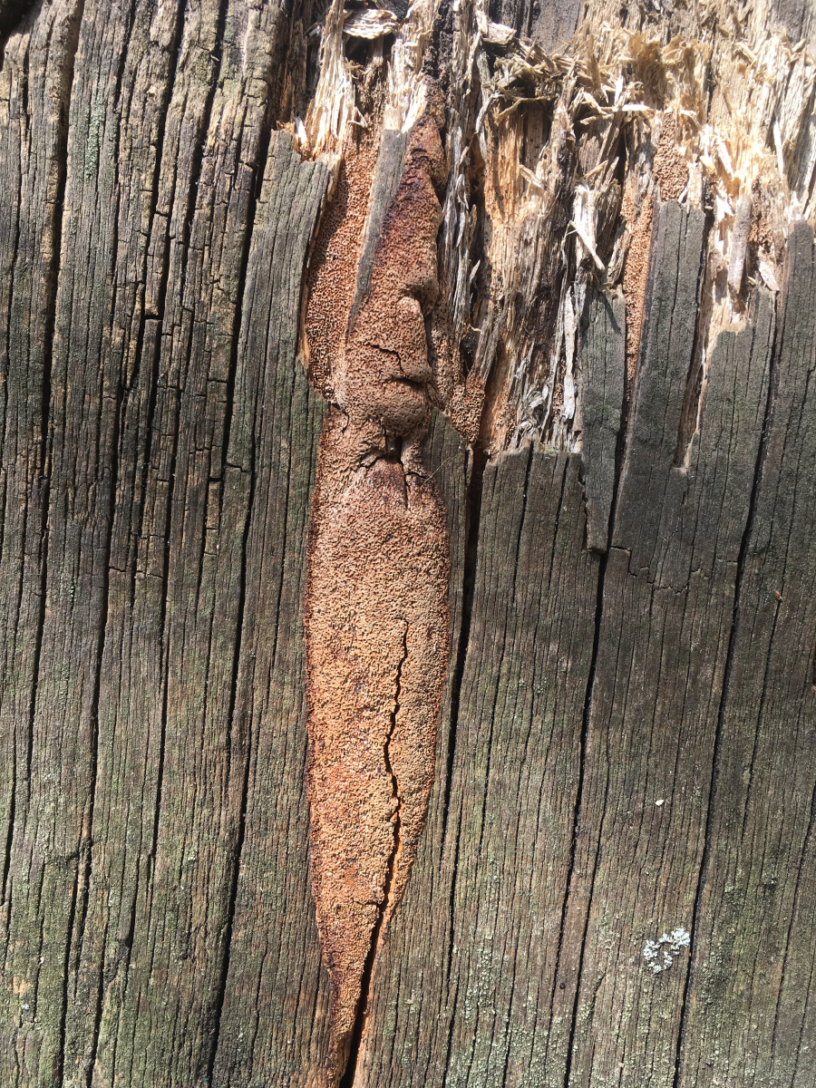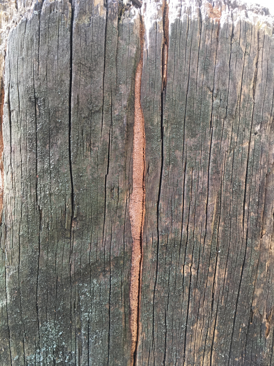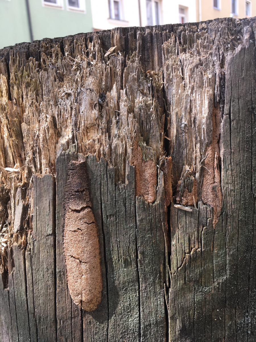 • Hallo zusammen, ich habe euch eine neue Folge "Urban Shrooming" mitgebracht. Bei der Parkplatzsuche fielen mir nämlich diese hölzernen Poller auf. Es handelt sich eher um ein trockenes Habitat mit vermutlich gelegentlicher Hundedusche und für teils ungedimmter Sonneneinstrahlung. Das Holz schätze ich auf Fichte oder Tanne oder Douglasie, jedenfalls Nadelholz. Durchmesser vielleicht 40-50cm. Ich kann mir nicht vorstellen dass es nicht behandelt ist, aber vermutlich schon lange her, daher haben unsere Freunde die Chance genutzt. Die Optik hat mit gefallen, sie haben sich nämlich gut getarnt, als wären sie irgendeine Füllmasse in den Holzrissen. Vielleicht wachsen sie aber auch deswegen in den Spalten weil die Oberfläche behandelt ist :/. Die Poren fein, polygonal. So von weitem hätte ich auf einen Feuerschwamm getippt. So fein waren die Poren dann allerdings doch nicht, sodass es vielleicht in Richtung Fuscoporia (cf viticola) gehen könnte?