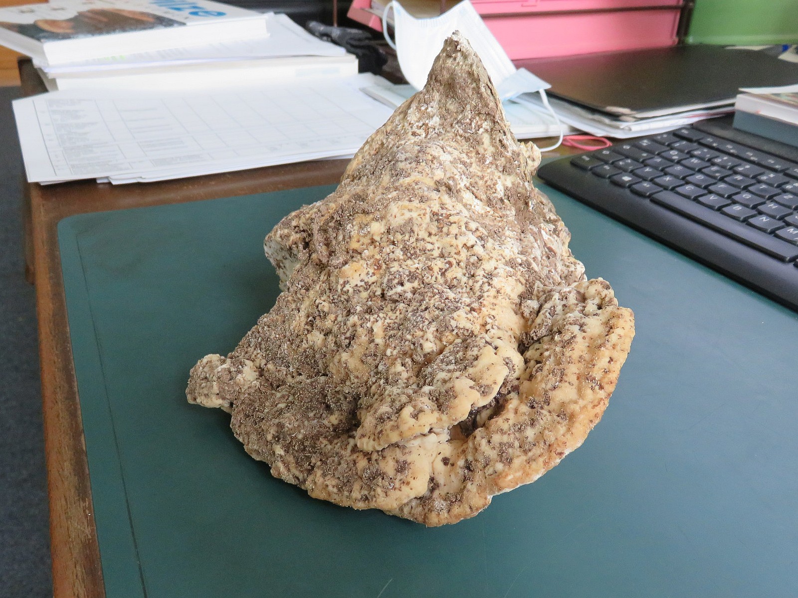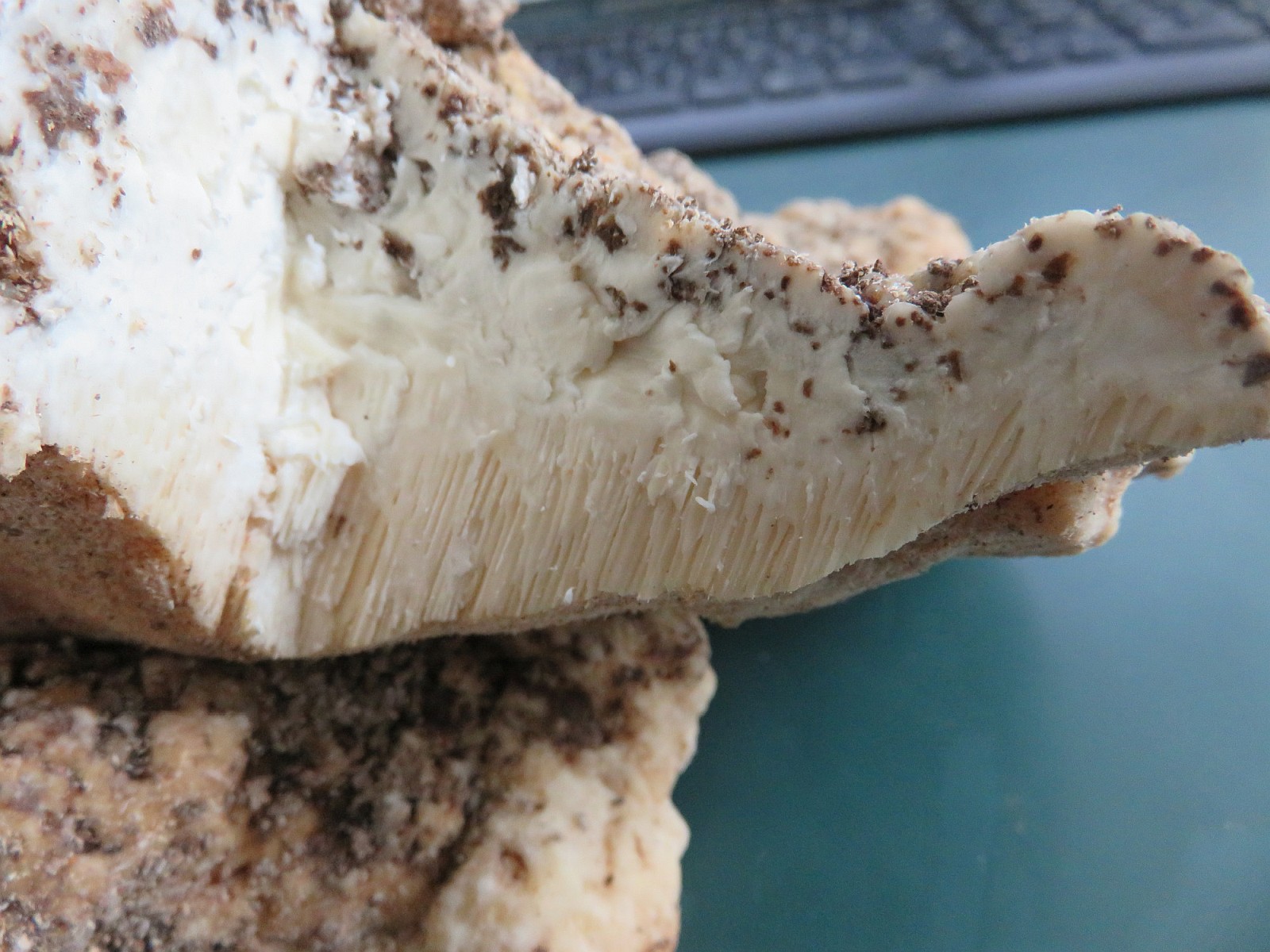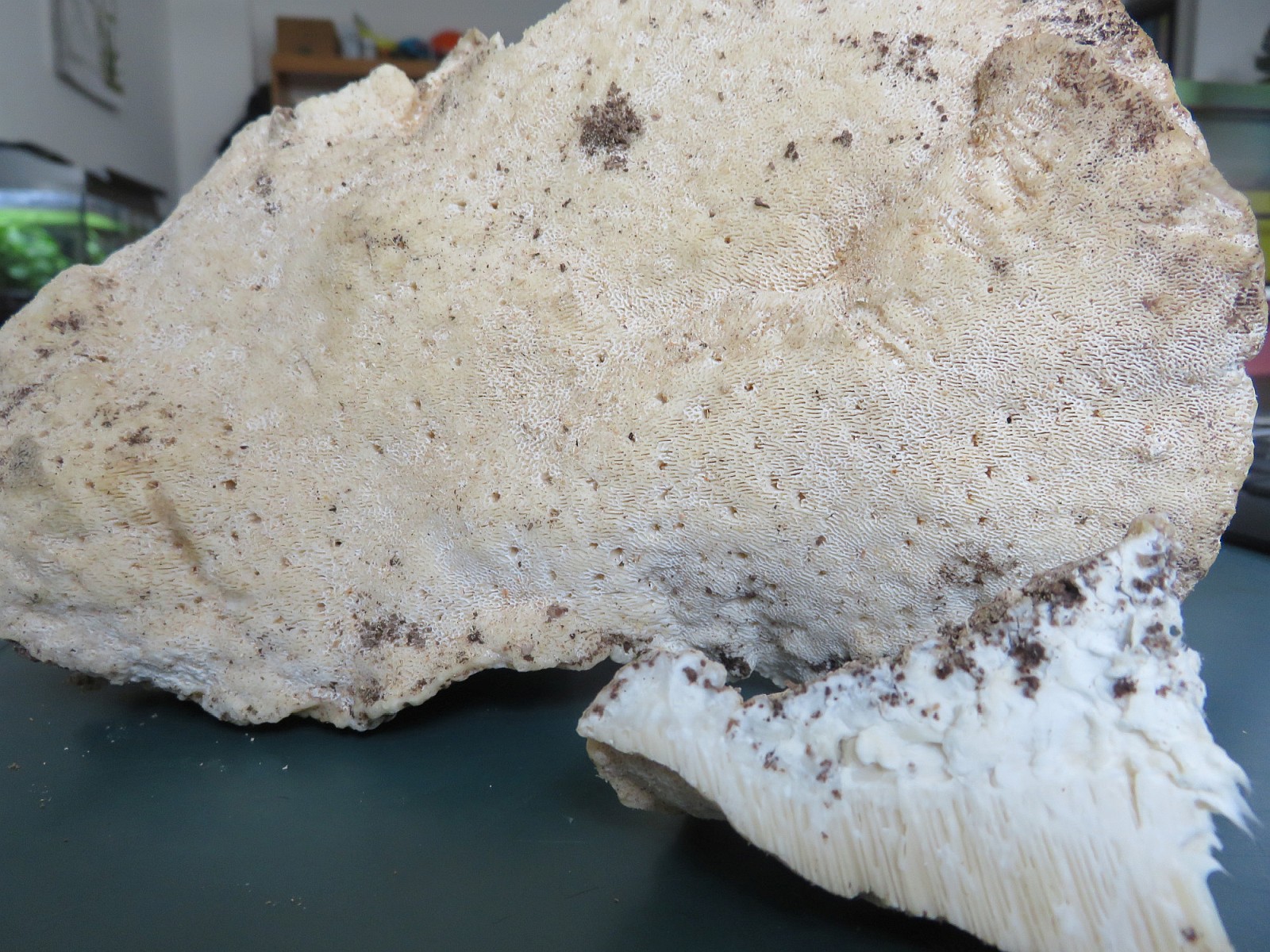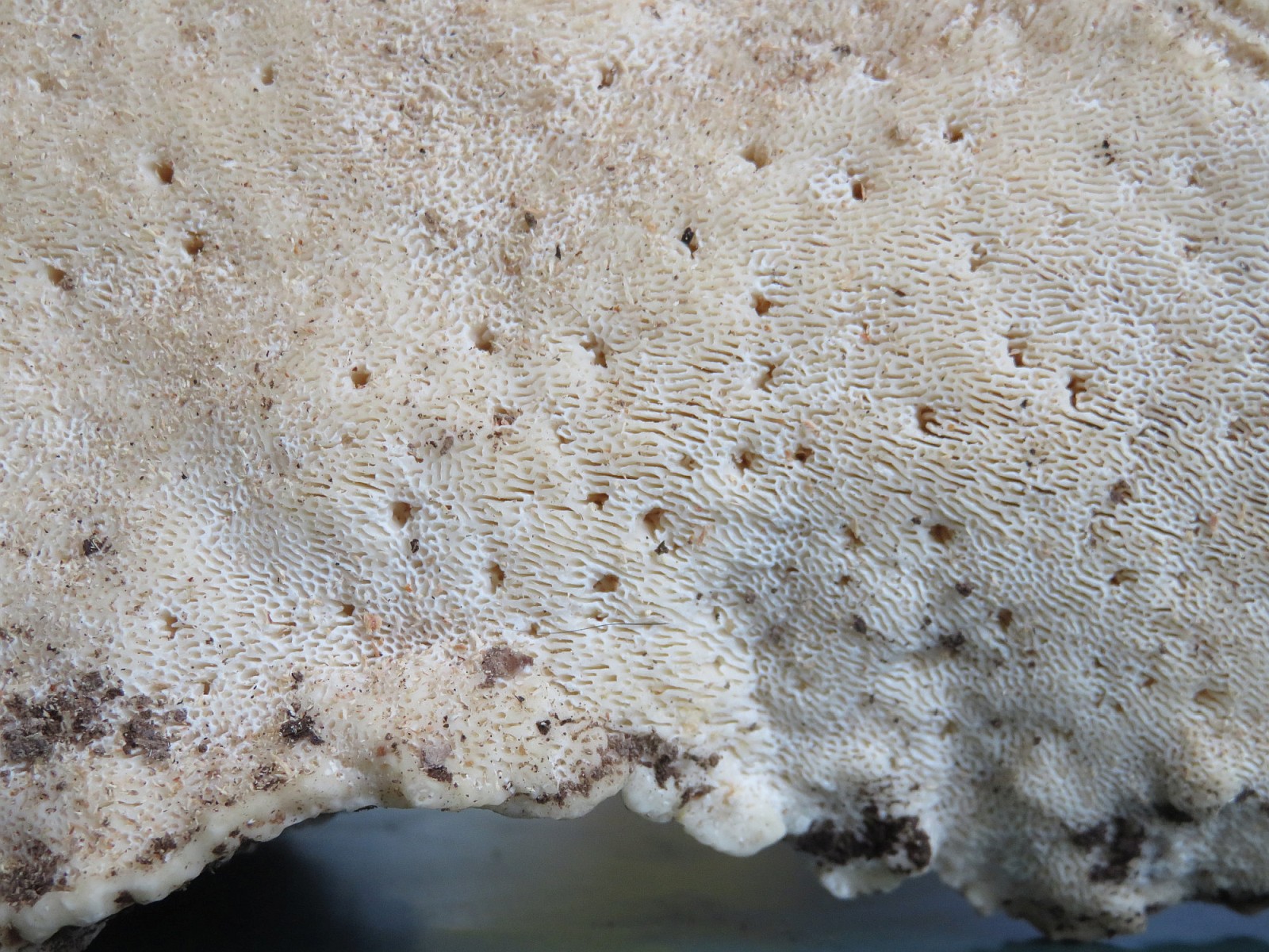 Kannst Du mir etwas zu diesem Pilz sagen? Evtl. meine Benennung als Spongipellis spumeus bestätigen, bestimmt nach H. Jahn? In PDS 2 steht als Verwechslungsart Tyromyces fissilis. Der kommt m. E. hier aber eher nicht in Frage. Ich habe den Pilz in der Hand, er ist trocken knochenhart, Sporen sind nicht (mehr) zu finden. Der Baum wurde vor ein paar Wochen gefällt.