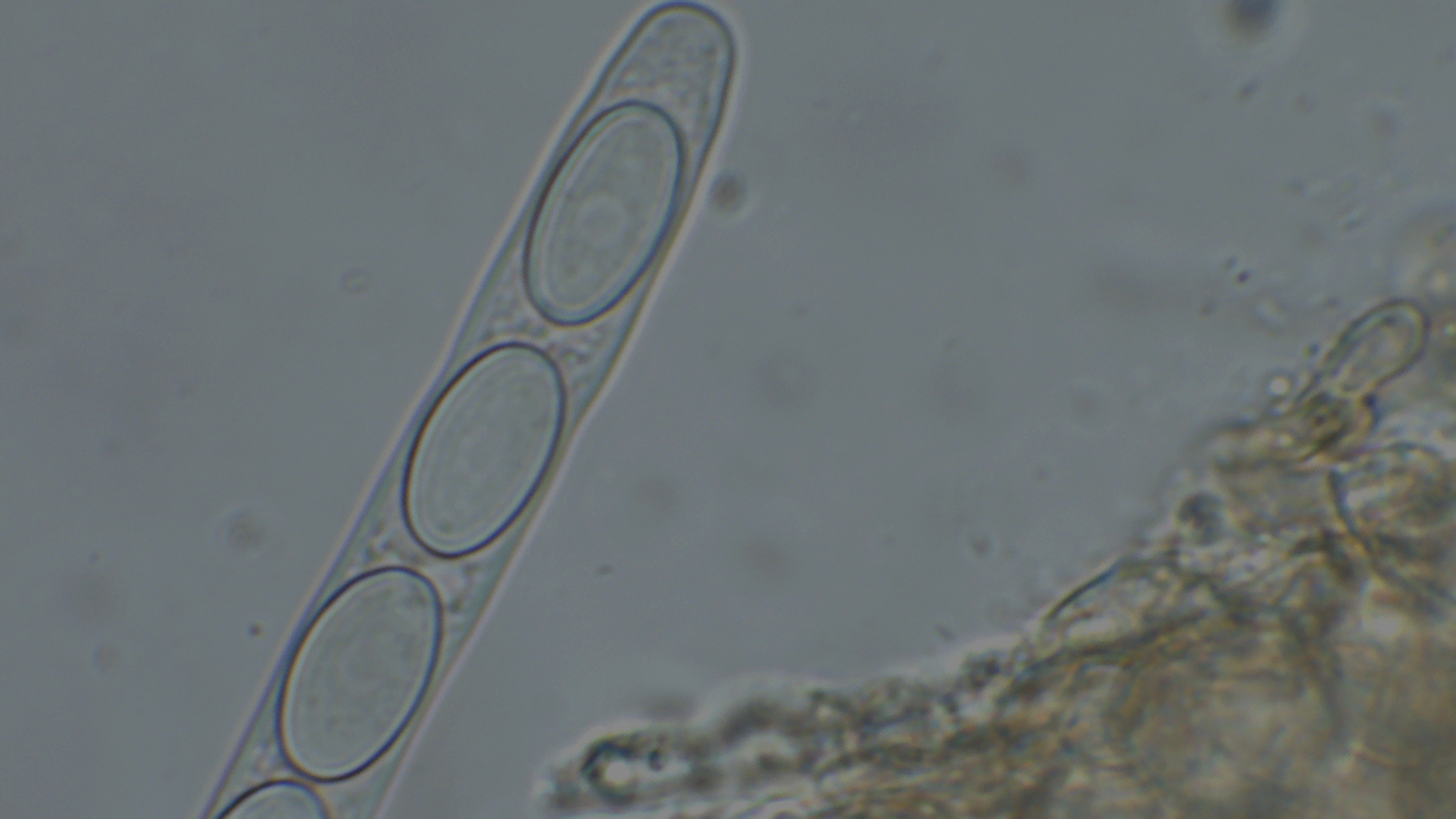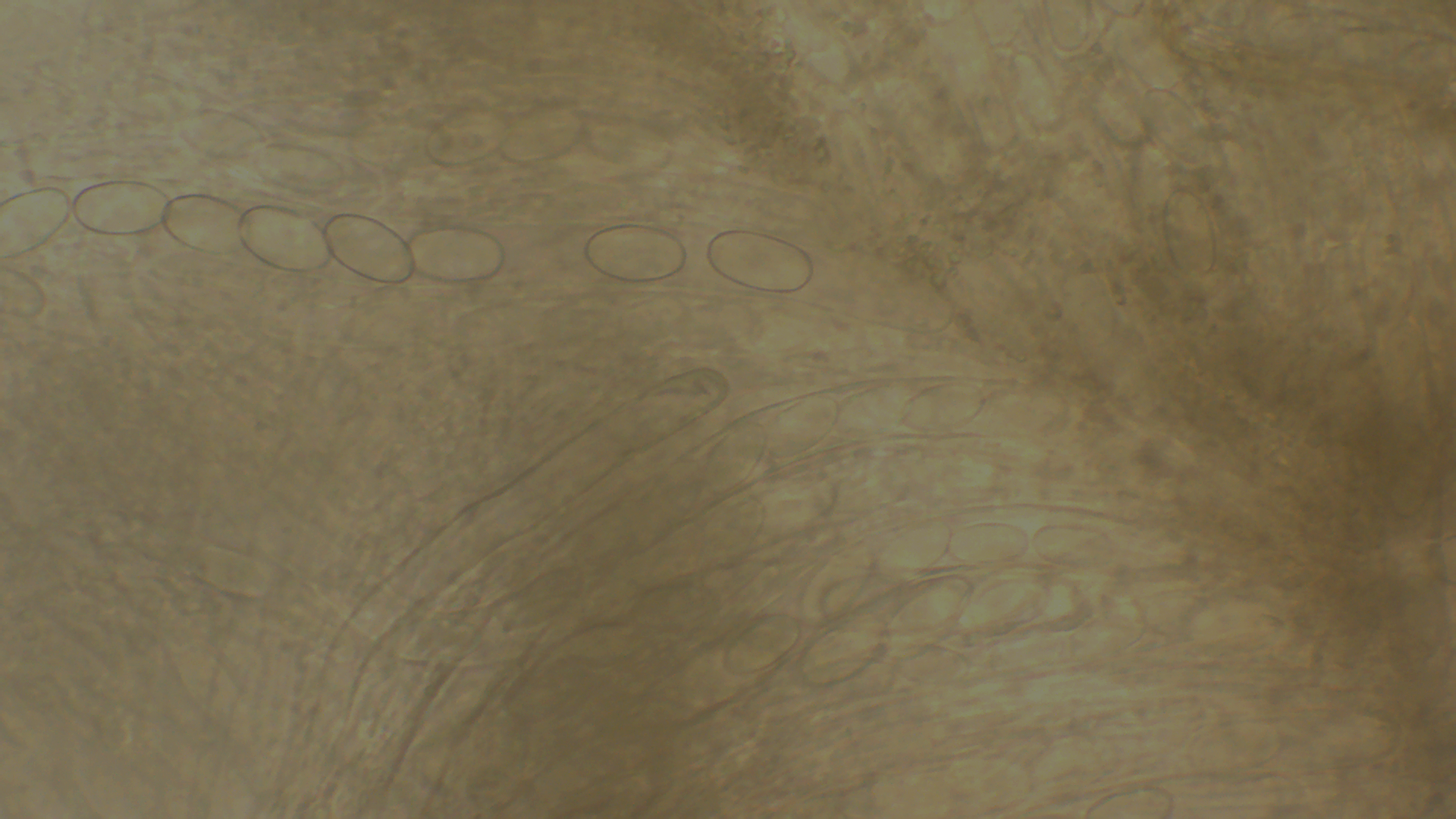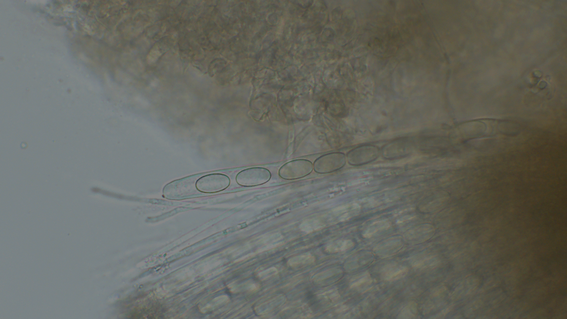 Die Pseudombrophila fand ich echt spektakulär. Ich denke, sie war noch etwas unreif, aber in einem Ascus waren die Sporen doch schon recht reif (denke ich) und nur von ihm habe ich dann die Sporen vermessen. Sie waren 15-17,5X 8-9 groß. Leider war das Stück, das ich unters Mikro gelegt habe zu groß, weshalb die Aufnahmen nicht ganz klar sind.