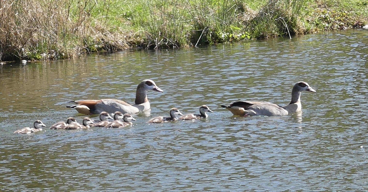 Die Familie Nilgans flüchtet vor uns ins Wasser ...