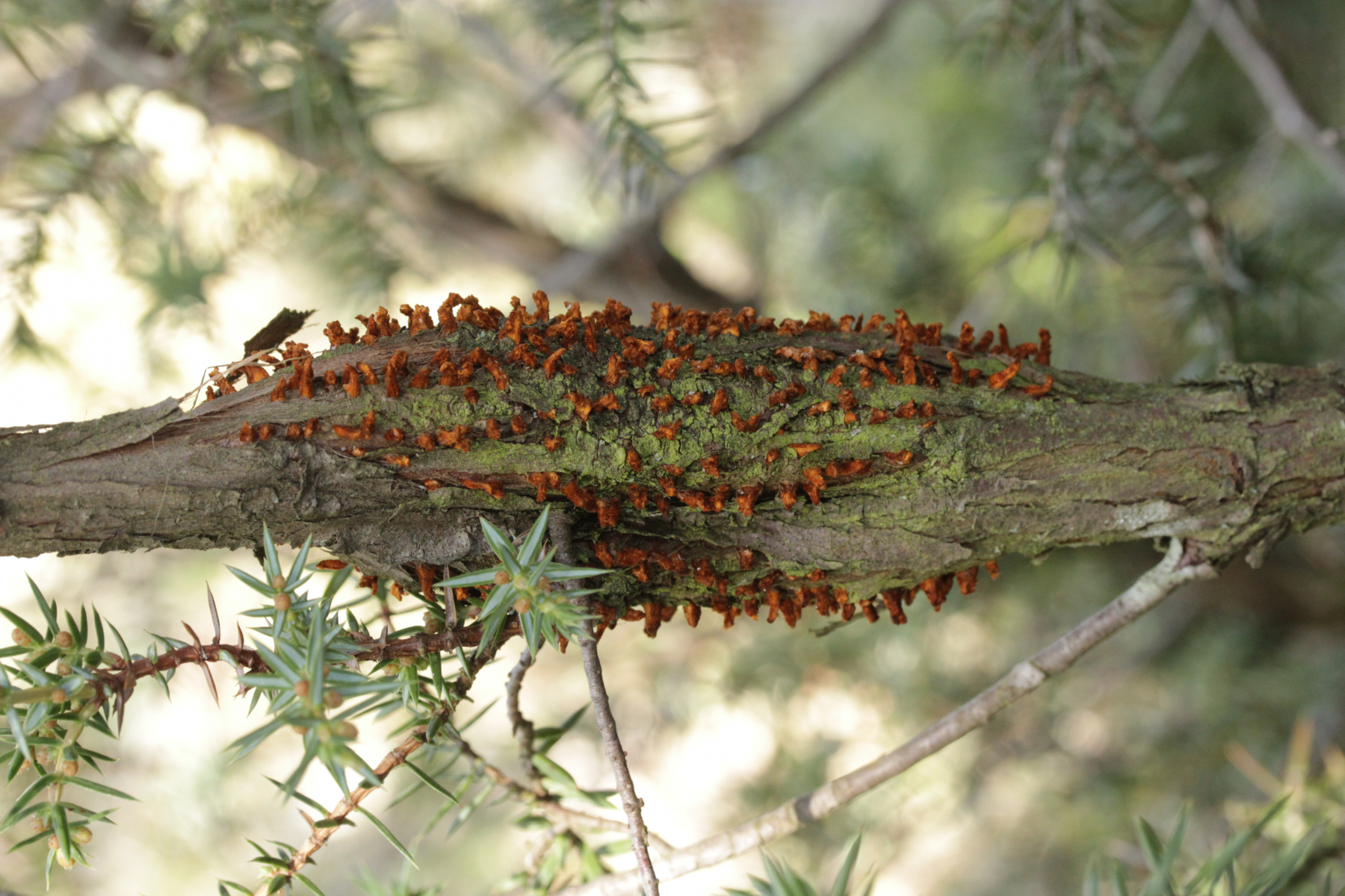 Nur für Gymnosporangium ist der Juni die undankbarste Zeit. Dann sind die Telien auf Wacholder schon weg und auf dem Wechselwirt Sorbus gibt es nur Spermogonien.