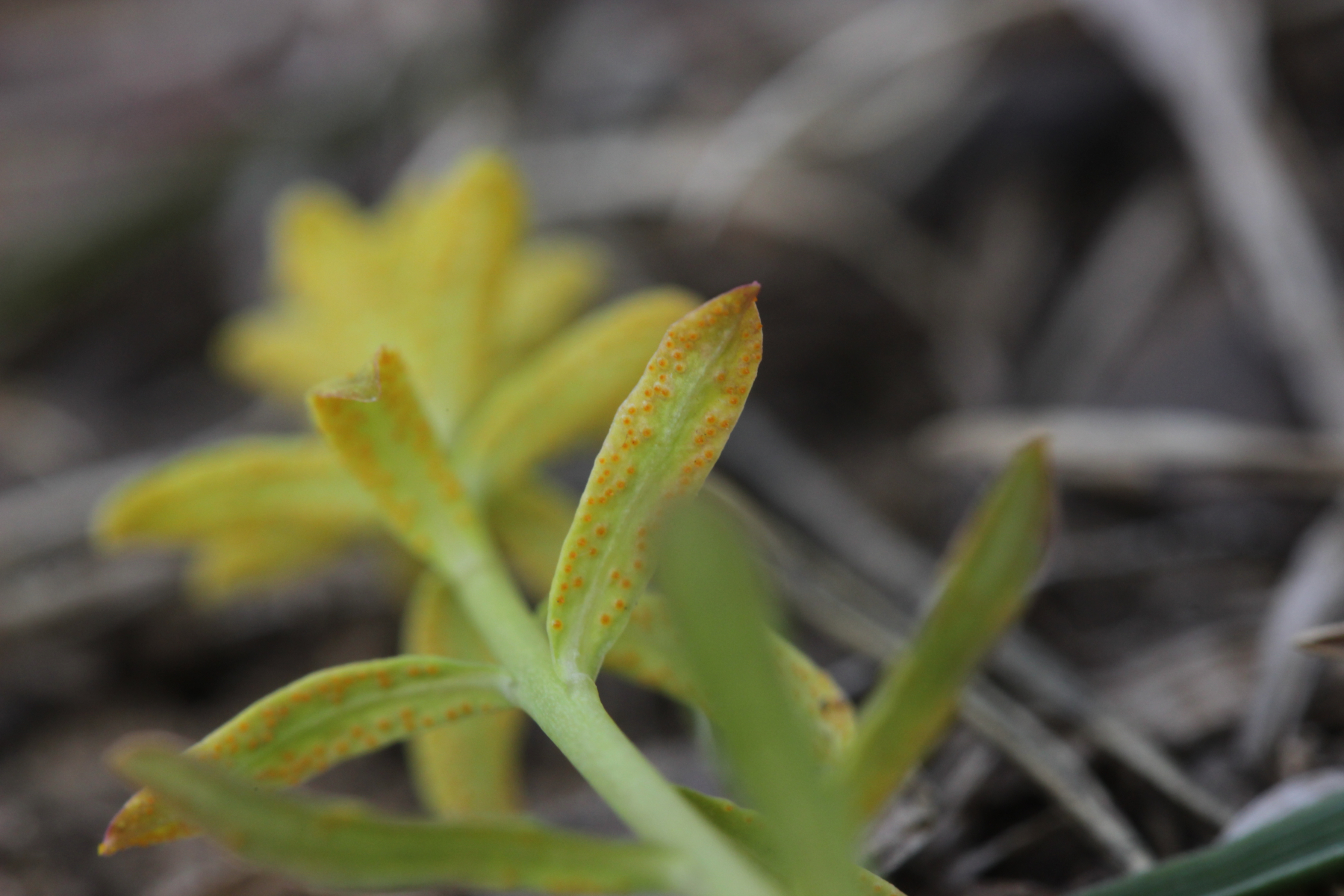 Bei meinem Fund oben sind nur Spermogonien vorhanden, deshalb ist da noch nicht klar, ob es auf Aecidium euphorbiae oder einen potentiell bestimmbaren Uromyces hinauslaufen wird.