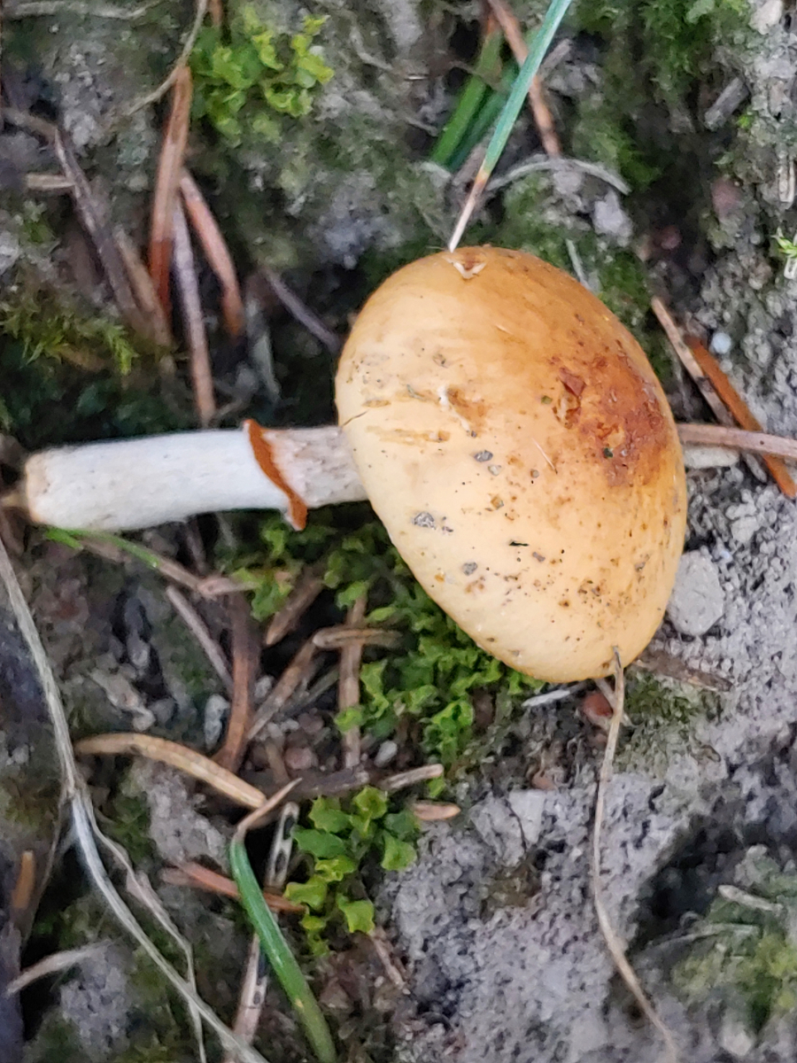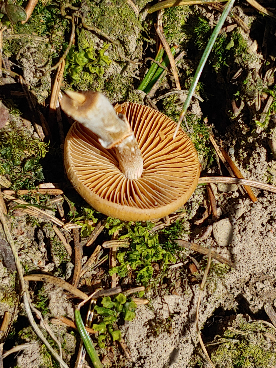 Ich meine auf dem Ring eine Riefung erahnen zu können bei umgedreht liegenden Pilz. Aber auch sonst haben die Ackerlinge, die so klein sind, generell keinen Ring. Und eine so kleine Stropharia mit ockerbraunem Hut wüsste ich jetzt auch nicht welche da in Frage käme, von der Lamellenfarbe mal abgesehen. Für Galerina ist der Ring etwas zu kräftig und die Stieloberfläche passt nicht (nachträglich editiert) gut zur marginata-Gruppe (die bei diesem Ring als einzige leidlich in Frage käme).