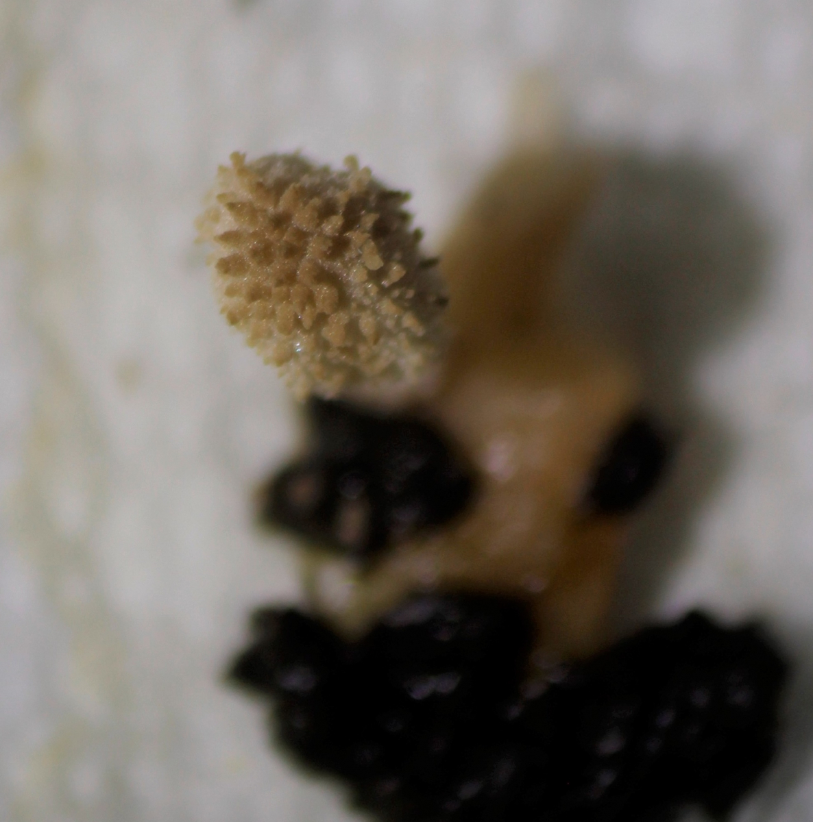 nun zeigt sich auf einem kleinen abgebröckelten Damwildköttel ein etwas größerer Tintling (ausgebreitet so ca. 8mm) und ist im Vergleich zu Coprinellus pusillulus ein wahrer Riese.