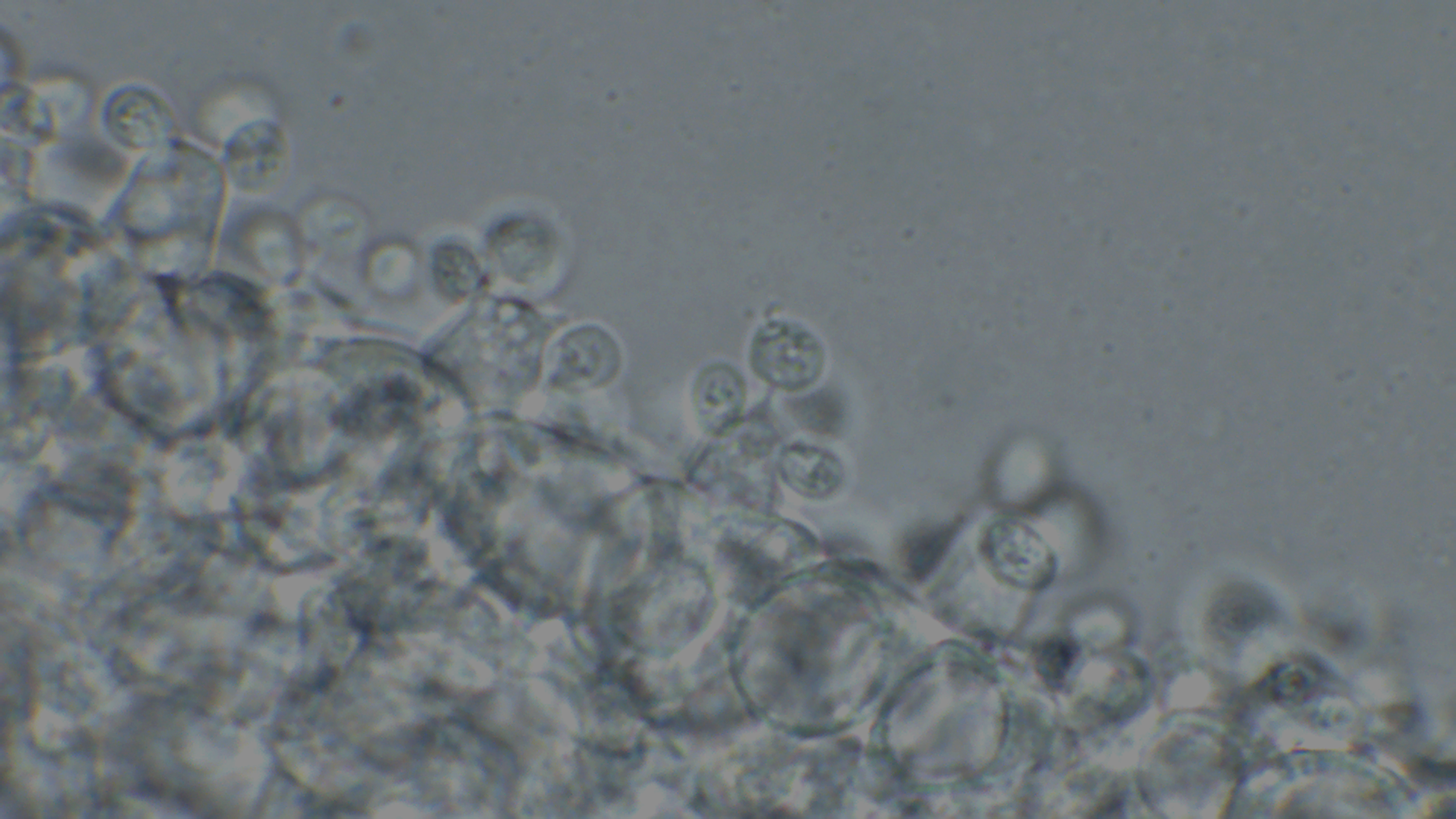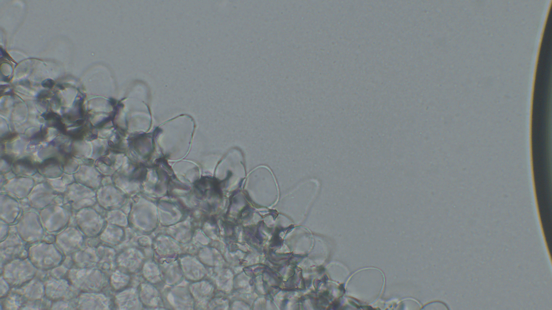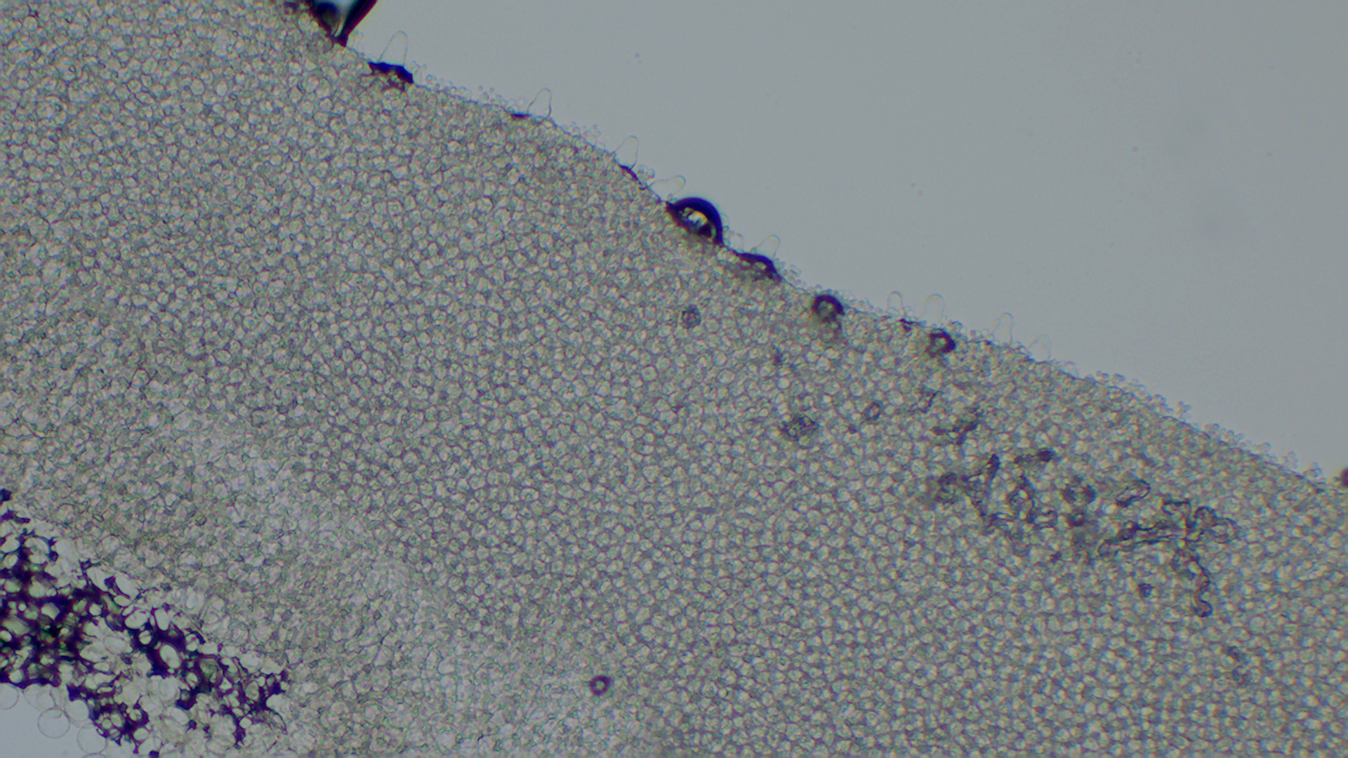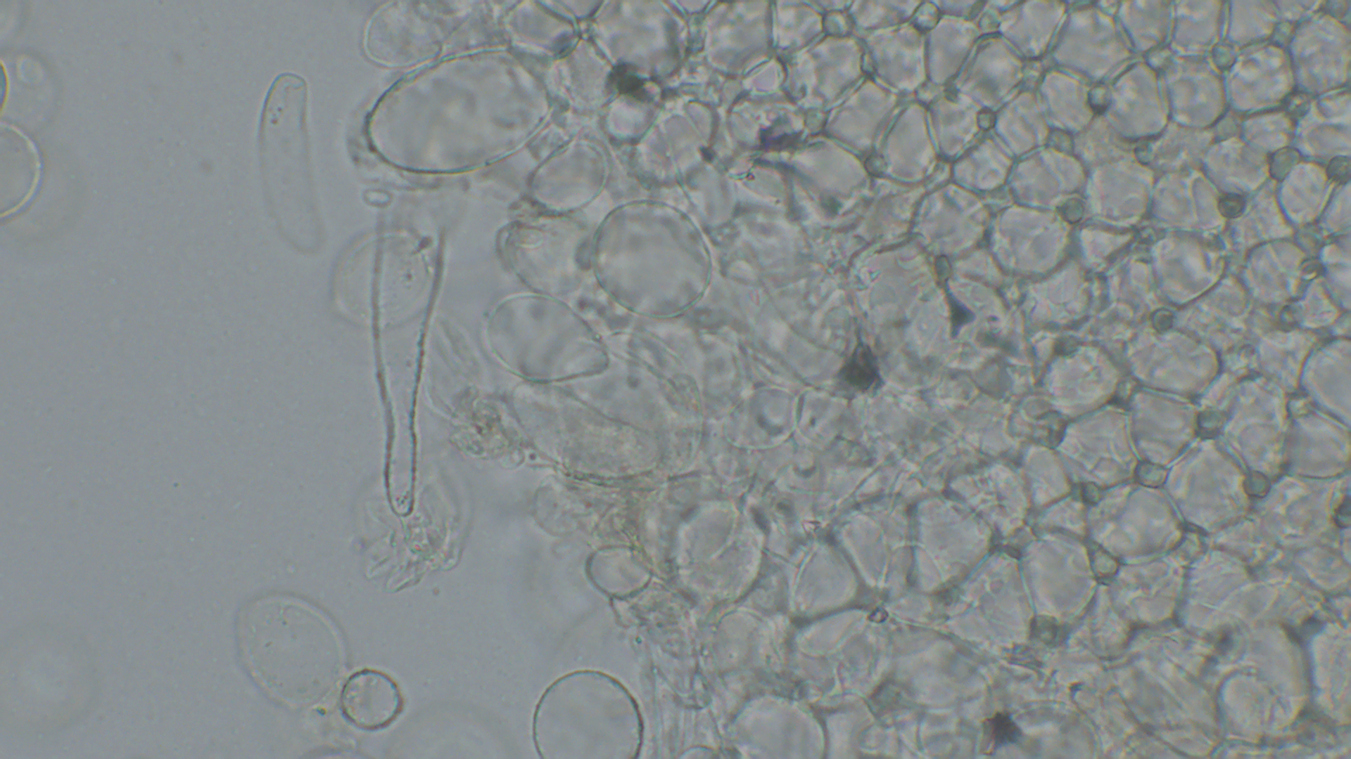 Die Cheilozystiden stammen von einem sehr jungen Fruchtkörper, und es scheint mir, dass die noch wachsen wollten.... Bei dem ausgebreiteten Exemplar waren dann leider die Cheilos verschwunden.