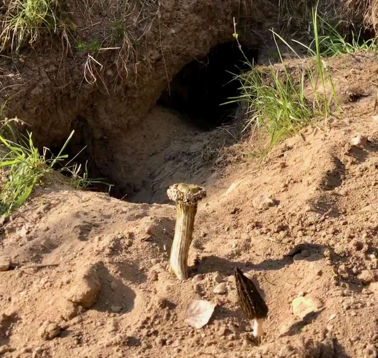 25 Hier noch einmal ein ganz typischer Morchelstandort. Morcheln finden ist ganz einfach. Ihr müsst einen Fuchsbau suchen mit mehreren Eingängen und einem Stück Rehgehörn auf Kalkboden davor. Wenn das alles passt sind Morcheln garantiert, wie dieses Photo ja zweifelsfrei belegt.