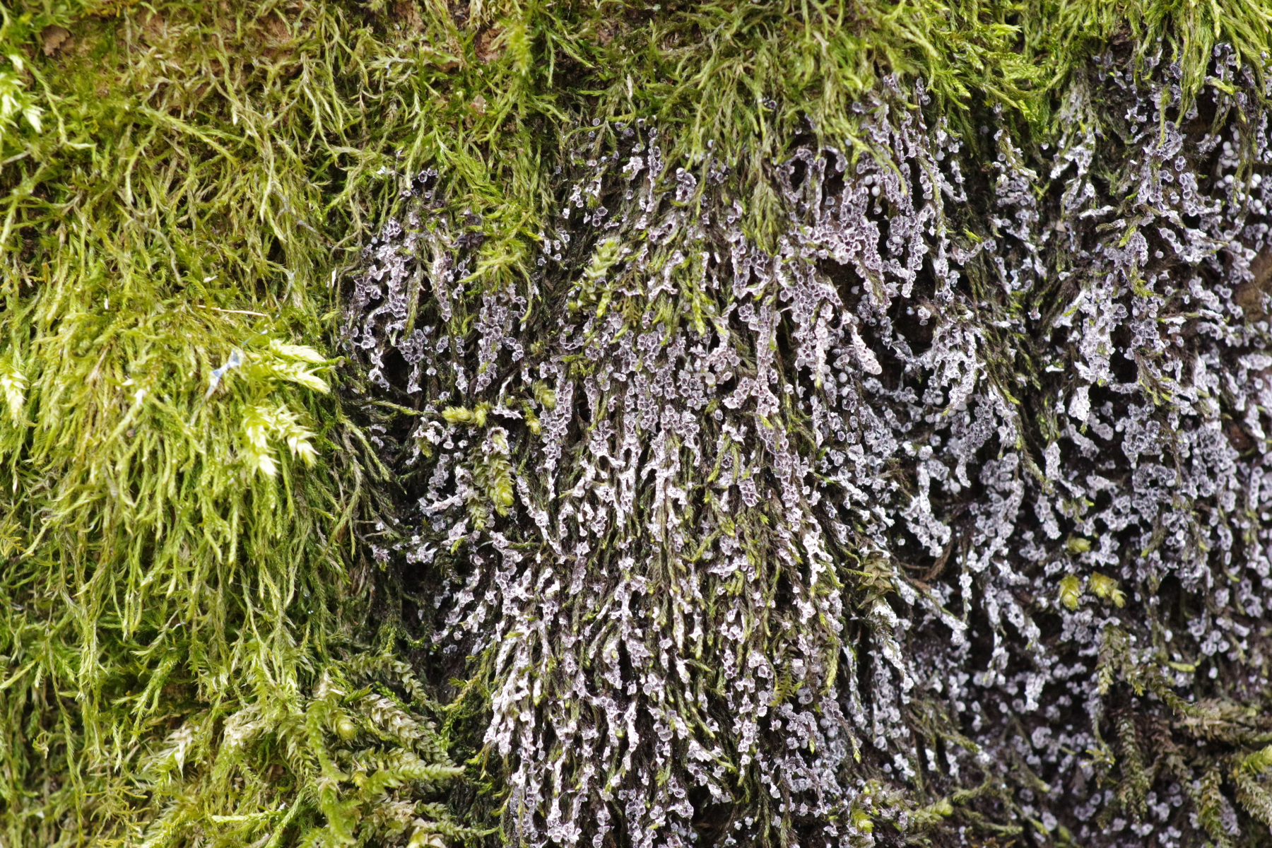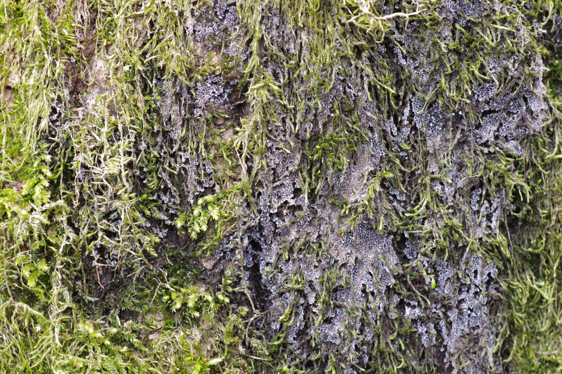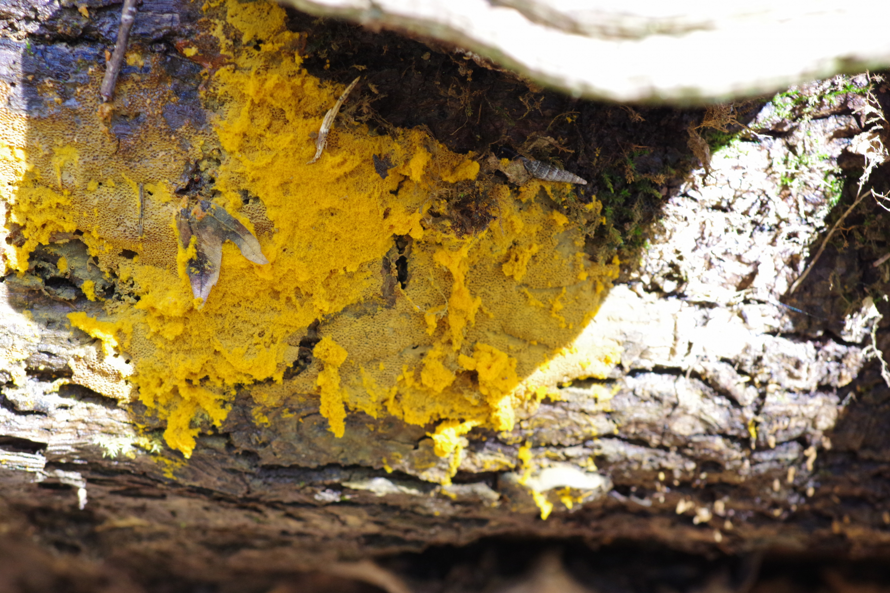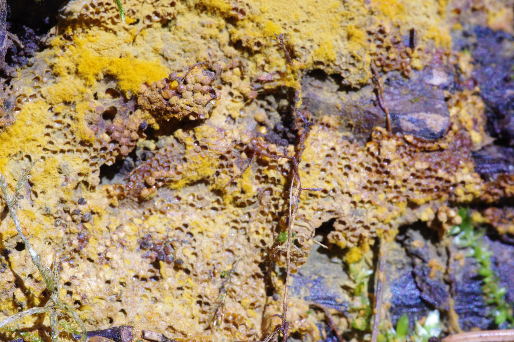 1) auf umgefallenem Laubbaum, wohl Ulmus sp., teilweise beschirmt von Porlingen, erinnert farblich an Metatrichia vesparium, bloß ohne diese Wabenstrukturen der Papierwespen, sondern eher in Honigbienenwabenanordnung