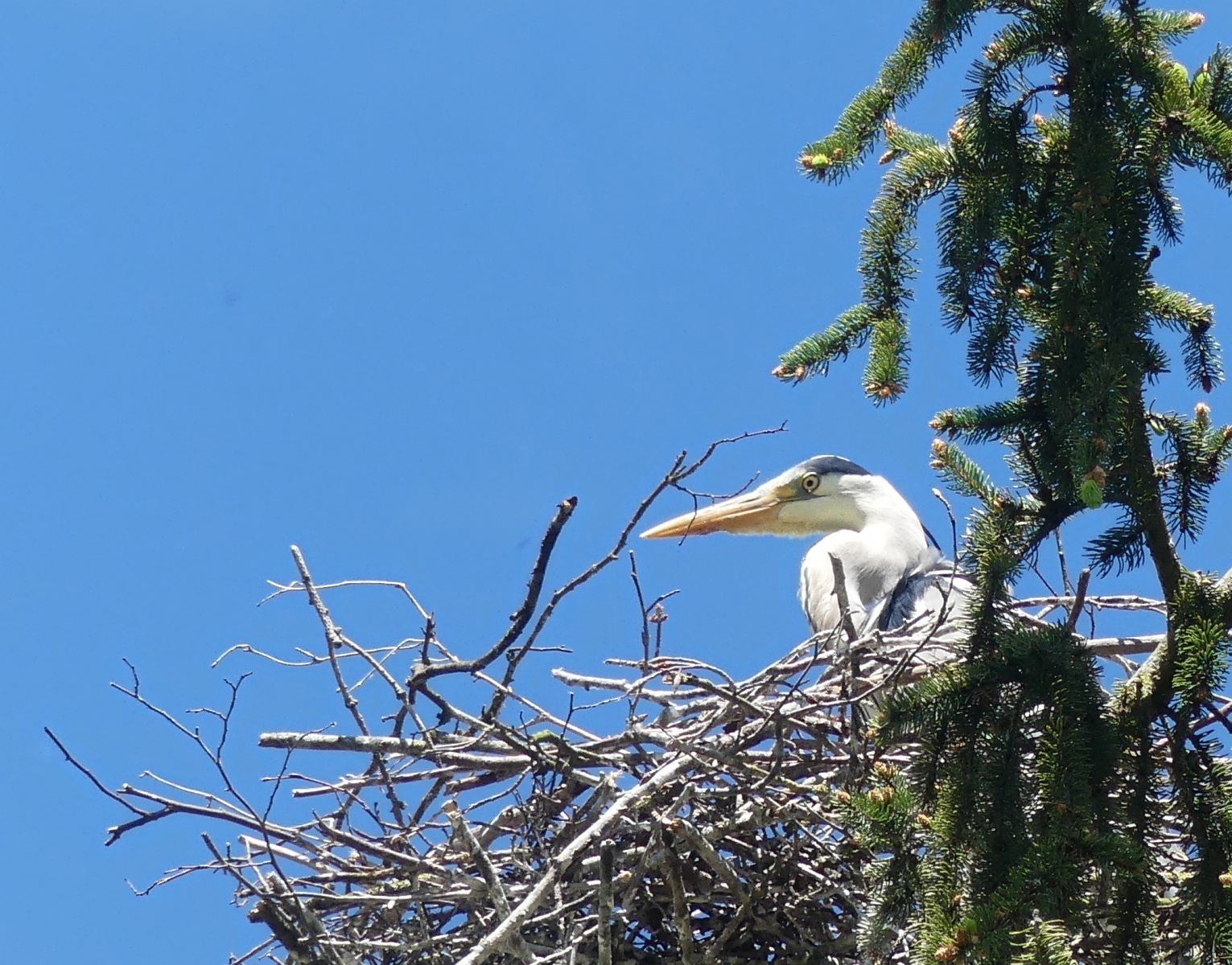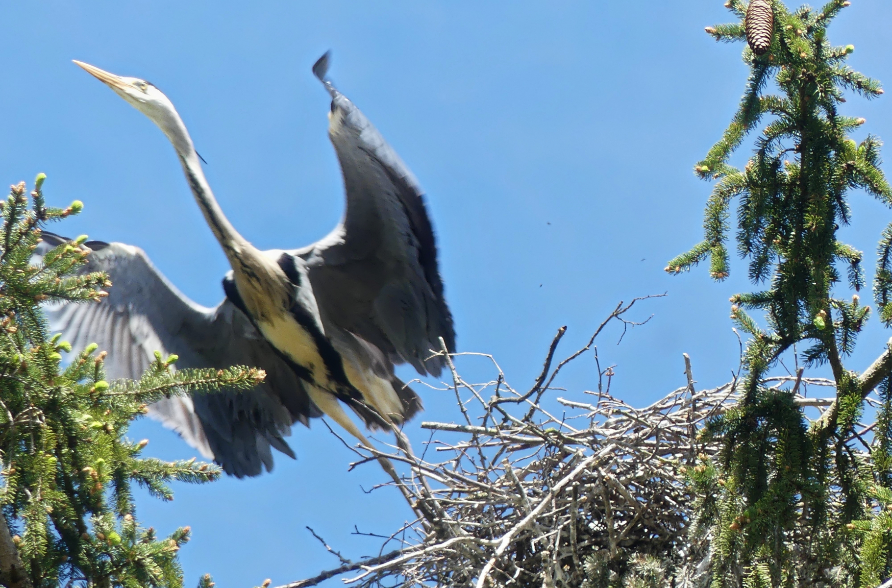 Etliche Graureiher-Nester sind dort in den Baumwipfeln nebeneinander und was war dies für ein Geklapper wenn die Alten mit der Beute ankamen
