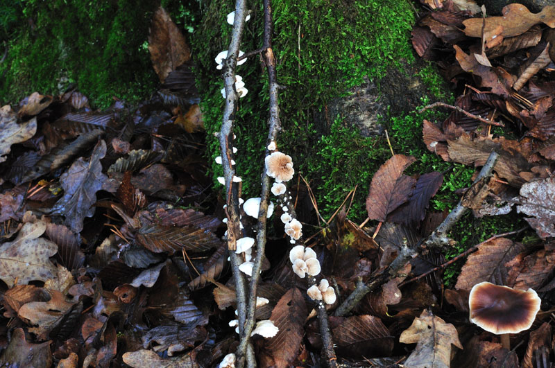 mit Fichtenwald führst Du ein wenig in die Irre. Das Ästchen, auf dem die kleinen Pilze wachsen, ist ein Laubholzast, wahrscheinlich Hainbuche. Da liegen nämlich Hainbuchen- und Eichenblätter herum. Weiter sehe ich noch Kiefernnadeln. Soviel schlaumeiern muss sein.