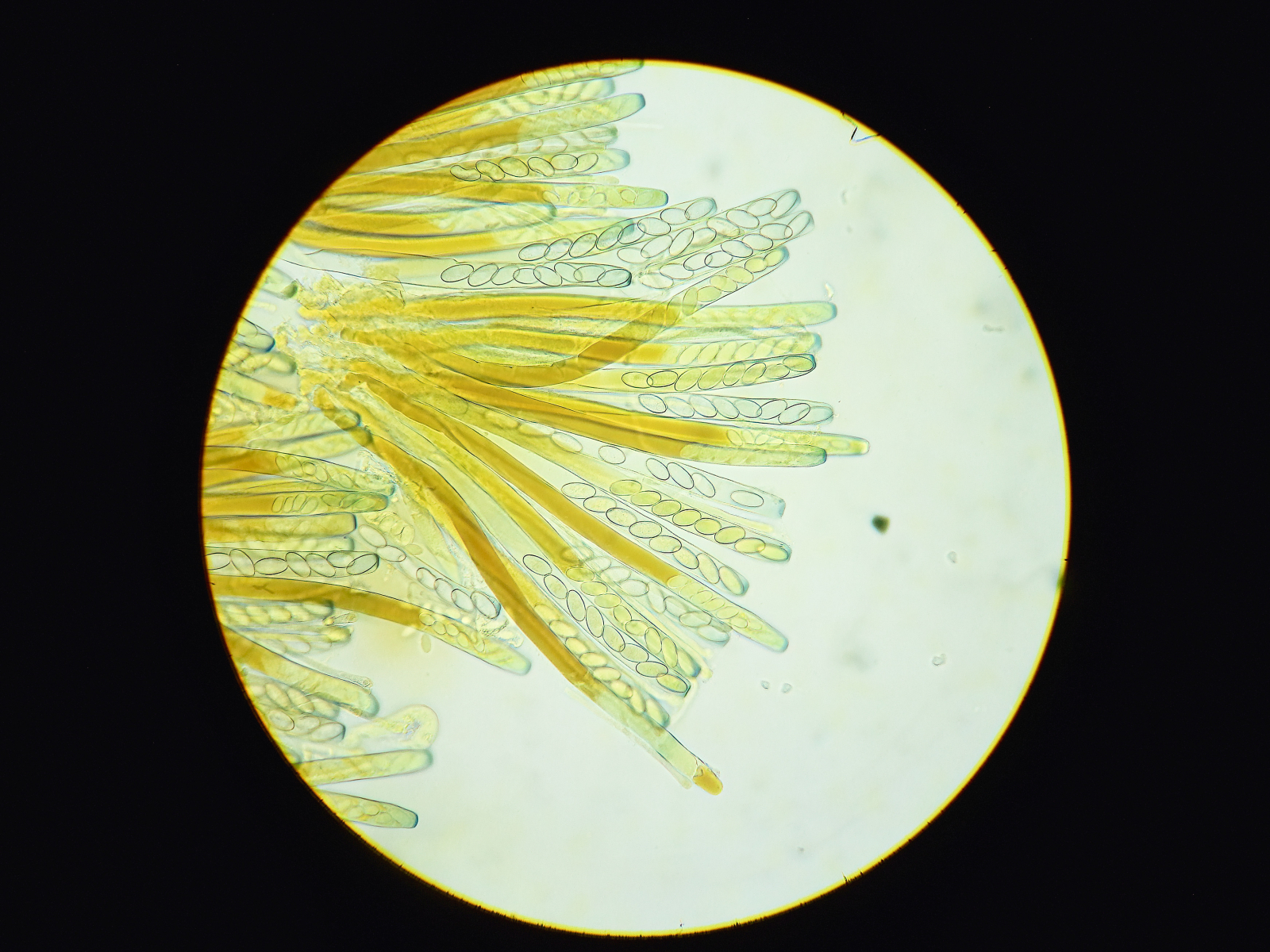ich bekam vorgestern eine Peziza auf den Tisch gelegt, die irgendwo in der Nähe von Oldenburg gefunden worden sein soll. ("Das sind doch Morchelbecherlinge?") Mehr als auf dem einen Bild zu erkennen ist, weiss ich über die Ökologie leider nicht. Ich finde die Ähnlichkeit mit Peziza arvernensis frappierend, allerdings sind die Asci etwas zu lang (zw. 240-280um). Die Paraphysen sind fädig und leicht kopfig, auf keinen Fall moniliform. Sporen messen ungefähr 17-18*8-9.