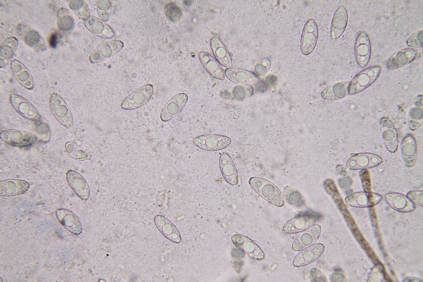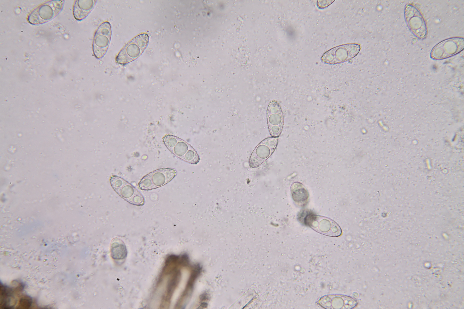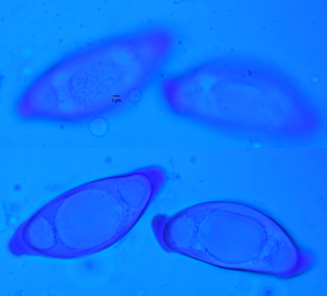 Man kann jetzt gut sehen, dass es mehr oder weniger offene Netzmaschen sind. Man erkennt da auch, dass sich das Material der Kappen um die ganze Sporen erstreckt und die "innere Spore an sich" etwas schmaler als die Maße sind. Man misst aber bei der Breite das Exospor gewöhnlich mit. Was die Länge angeht, messen die einen mit, die anderen ohne die Kappen.
