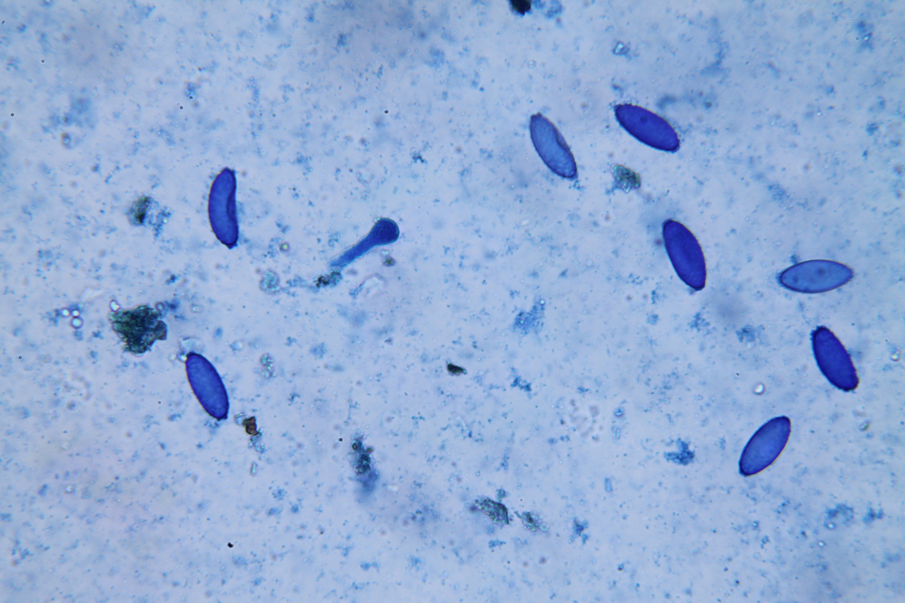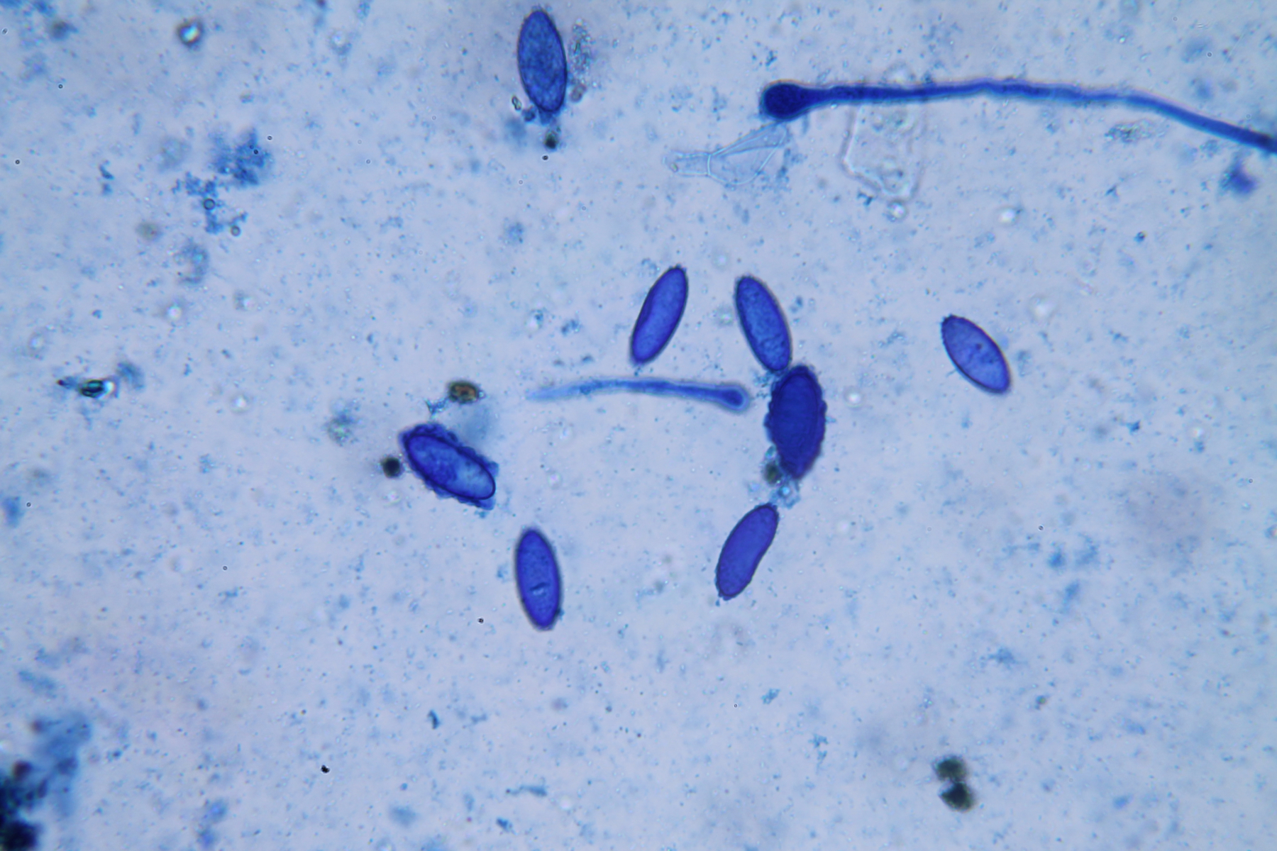 Gestern kam das Päckchen bei mir an und ich habe direkt die Sporen angeschaut. Die Maße sind in Wasser gemessen, die Fotos sind auch in Wasser bzw. die mit blauem Hintergrund in Milchsäure-Baumwollblau (nicht erhitzt, eine Stunde Einwirkzeit).