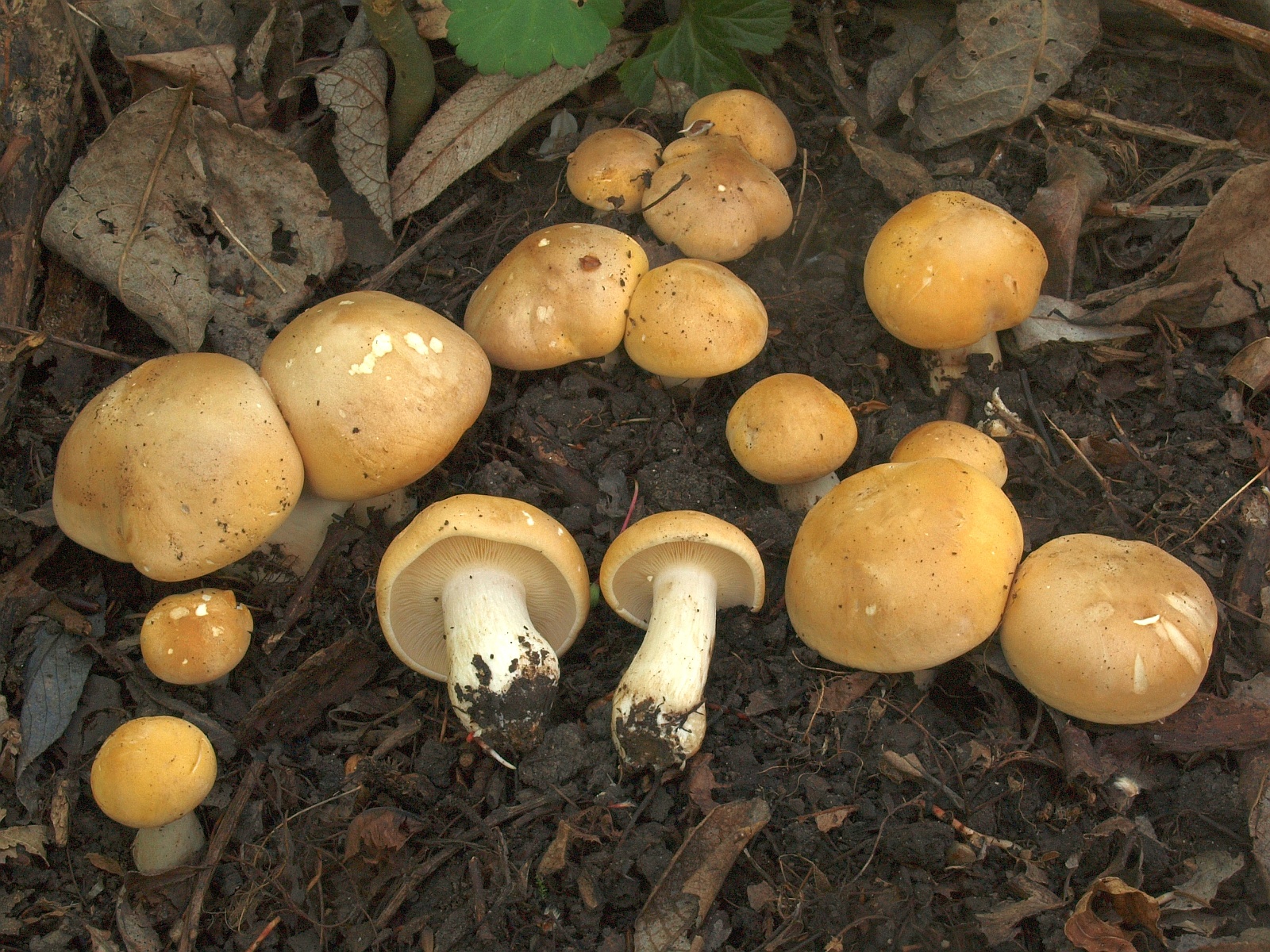 Was ein ganz entferntes bisschen auch wie ein Maipilz mit Gelben Lamellen aussieht (aber oft deutlich zu groß und irgendwie nicht im Mai wachsend) ist ja auch Leucopaxillus tricolor:Famose Sache übrigens, Karl: Maipilze mit leicht ockerlich verfärbenden Hüten (beim Antrocknen) findet man ja immer wieder mal, aber das, was du da zeigst, ist schon bemerkenswert. Sowas hatte ich noch nicht in der Hand.