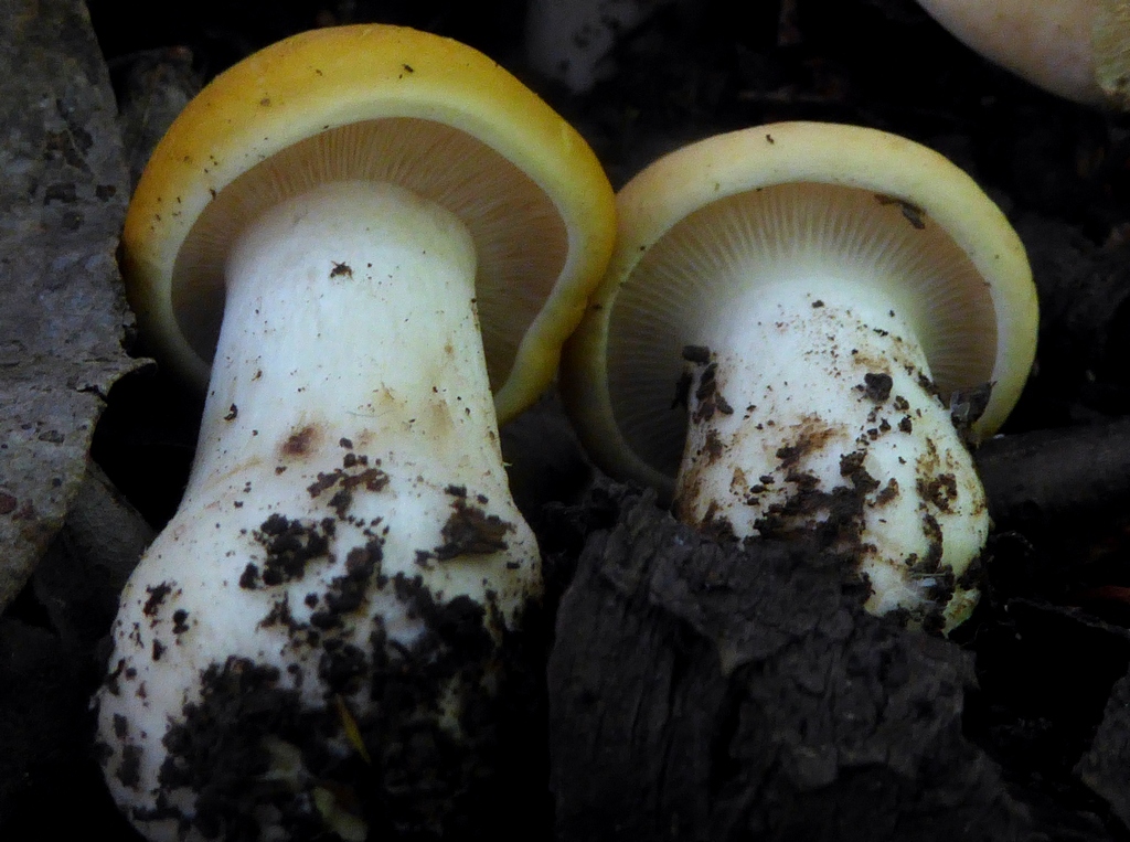 Was ein ganz entferntes bisschen auch wie ein Maipilz mit Gelben Lamellen aussieht (aber oft deutlich zu groß und irgendwie nicht im Mai wachsend) ist ja auch Leucopaxillus tricolor:Famose Sache übrigens, Karl: Maipilze mit leicht ockerlich verfärbenden Hüten (beim Antrocknen) findet man ja immer wieder mal, aber das, was du da zeigst, ist schon bemerkenswert. Sowas hatte ich noch nicht in der Hand.