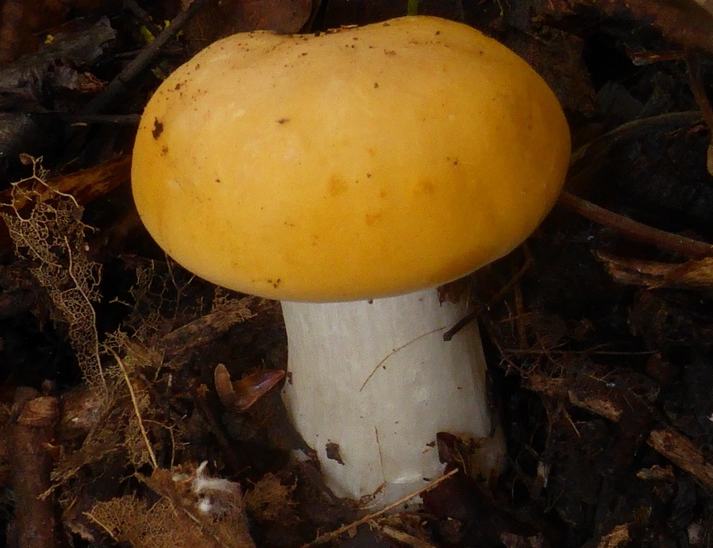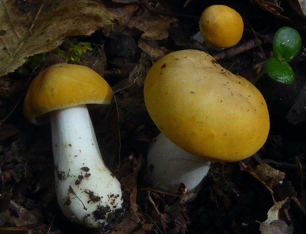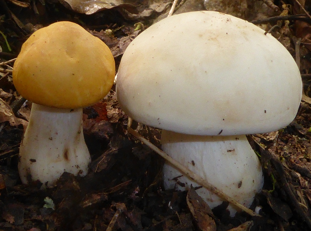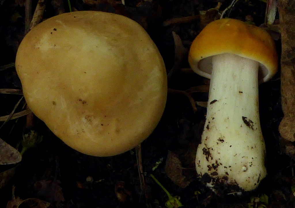 Was ein ganz entferntes bisschen auch wie ein Maipilz mit Gelben Lamellen aussieht (aber oft deutlich zu groß und irgendwie nicht im Mai wachsend) ist ja auch Leucopaxillus tricolor:Famose Sache übrigens, Karl: Maipilze mit leicht ockerlich verfärbenden Hüten (beim Antrocknen) findet man ja immer wieder mal, aber das, was du da zeigst, ist schon bemerkenswert. Sowas hatte ich noch nicht in der Hand.