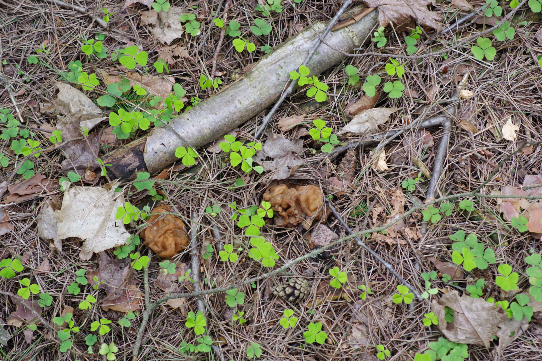 Moin, in einem Kiefernwald am Ende des Dorfes hatte ich vor Jahren schon mal Lorcheln gefunden (der heimische Name bobausiai übersetzt sich etwa als "Altweiberohren"). Jetzt stehen da zwei Arten fast nebeneinander, die ich für G. esculenta und G. gigas halte. Fotos vom Biotop habe ich noch nicht gemacht. Die Kiefern sind um die 60, eigentlich kein arg typischer Kiefernboden, mit jüngeren Birken und Ahorn in der Baumschicht und Hasel und Eberesche in der Strauchschicht. Sind nur Handyfotos, und die Münze für den Größenvergleich ist 1 €. Der große ist ein Einzelstück.