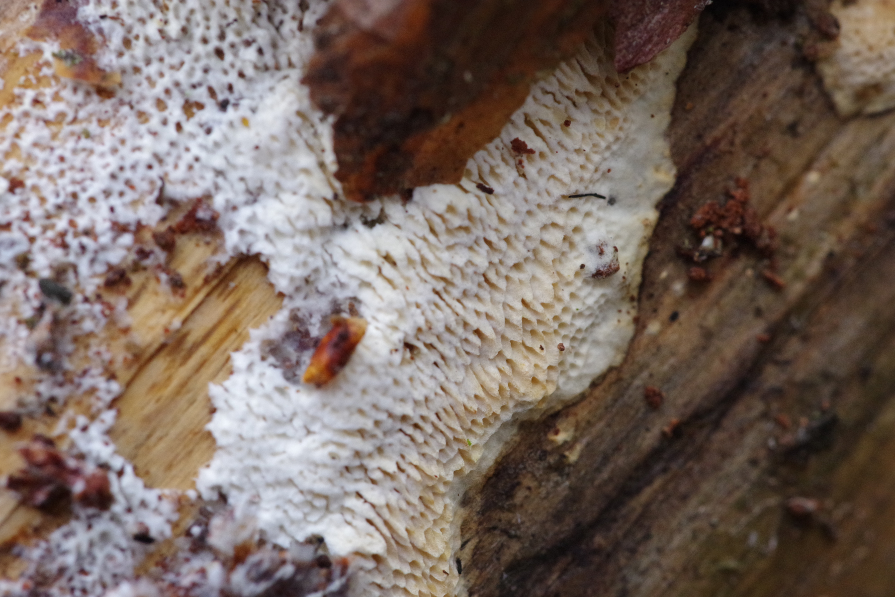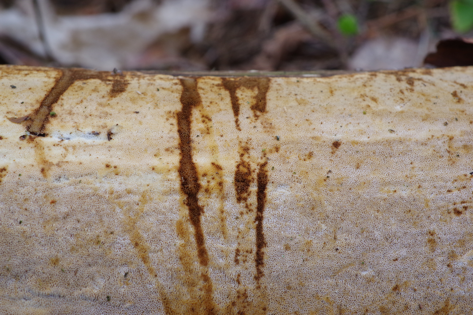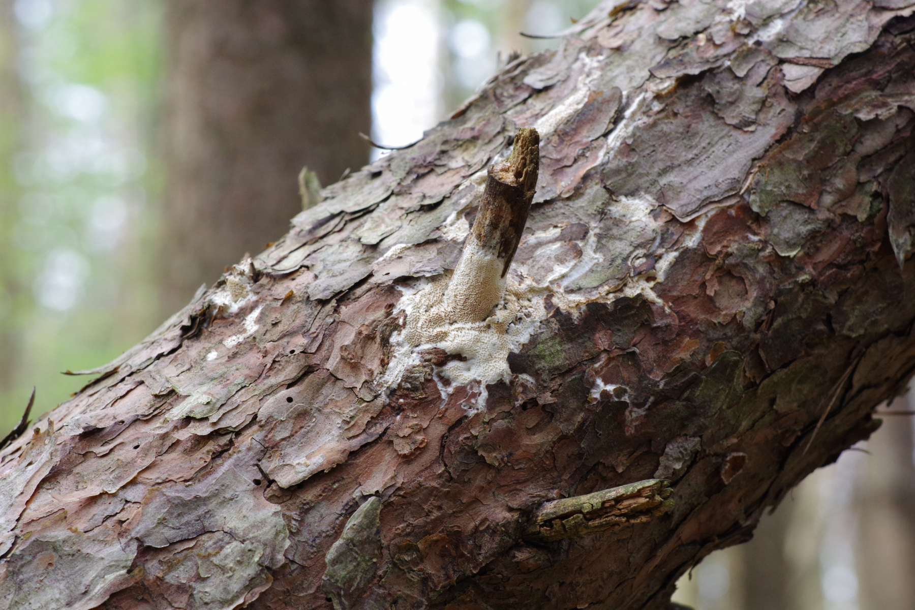 an einer toten Kiefer, die schräg in der Landschaft hängt, wächst über weite Bereiche dieser Porling. Der obere Teil des Stamms scheint erst kürzlich abgebrochen zu sein und liegt jetzt auf dem Boden mit dem Porling nach oben zeigend. Besonders auffällig finde ich die braune Färbung, vermutlich durch Druckstellen.