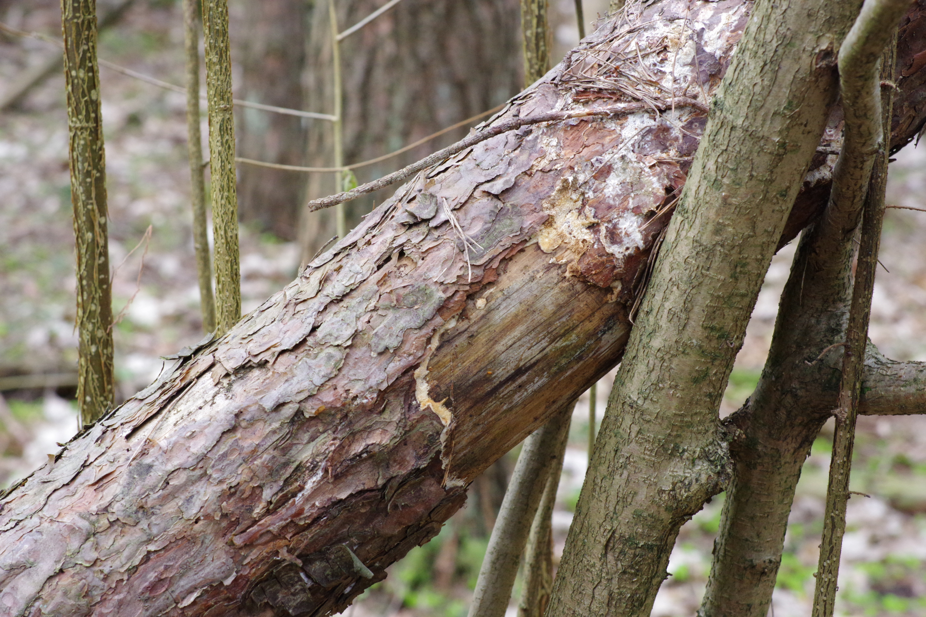 Da wo die Rinde noch komplett vorhanden ist, wächst der zunächst an den Ästen und unter der Rinde hervor.
