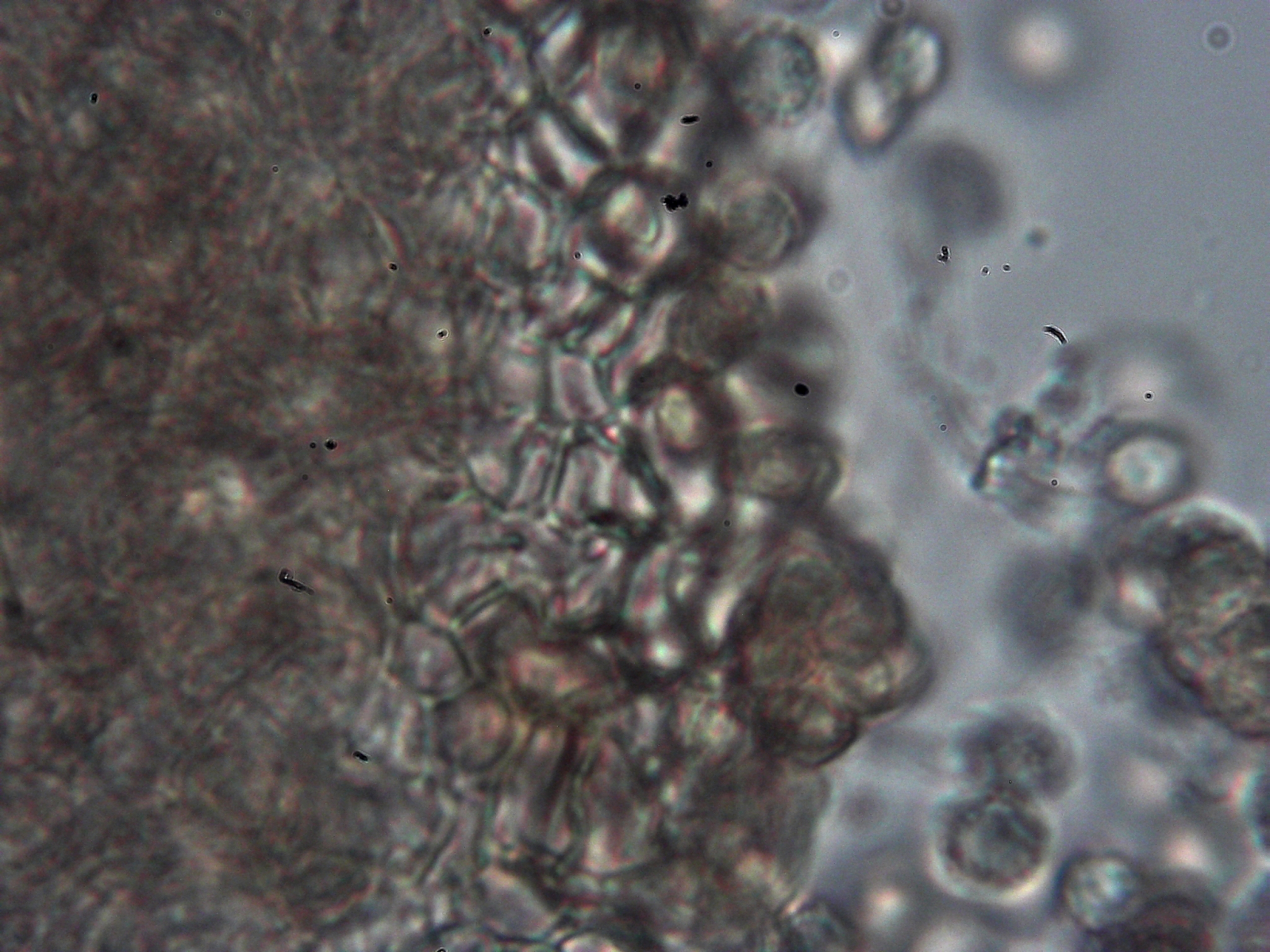Die winzigen Sporen sind bei 400facher Vergrößerung sehr warzig/stachelig. Unter Öl kann man erahnen, dass das Sporenornament netzartig ist. Die Sporen messen 4-5 x 3-3,5 µm.