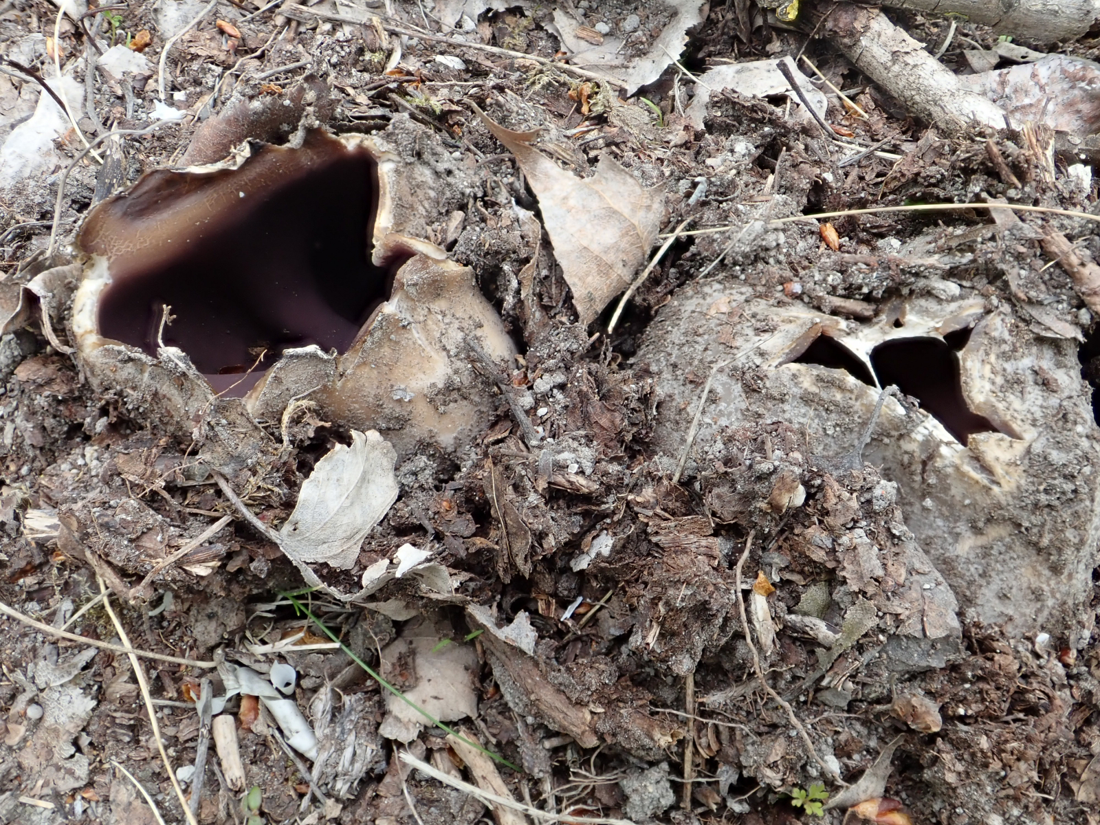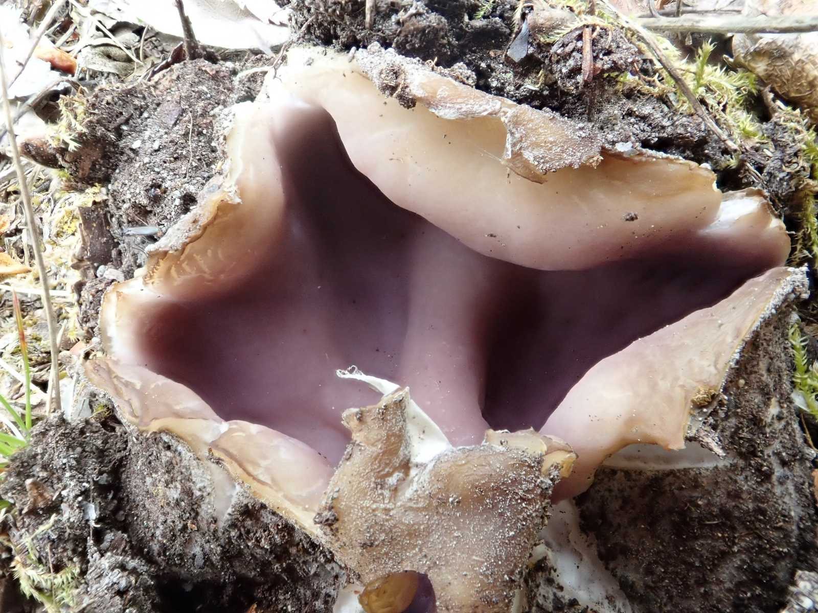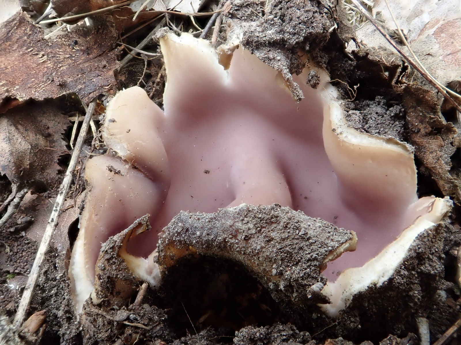 Später zwischen Birken und Pappeln dann ein für uns erstaunlicher, aber eindeutiger Fund – Kronenbecherlinge – Sarcosphaeria coronaria. Es war keine Kiefer in der engen und weiteren Umgebung zu sehen. Aber nach Recherche im Internet kann die auch mit Laubbäumen! Wichtig ist der kalkhaltige Untergrund. Das ist auch ein Erstfund für das Gebiet.