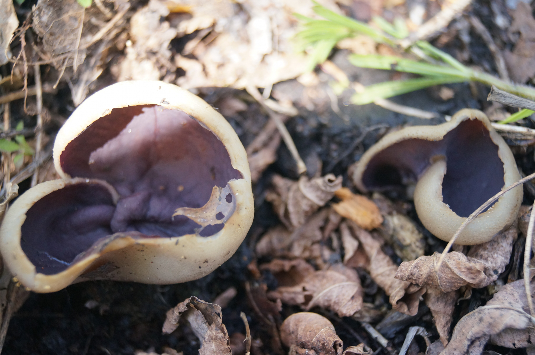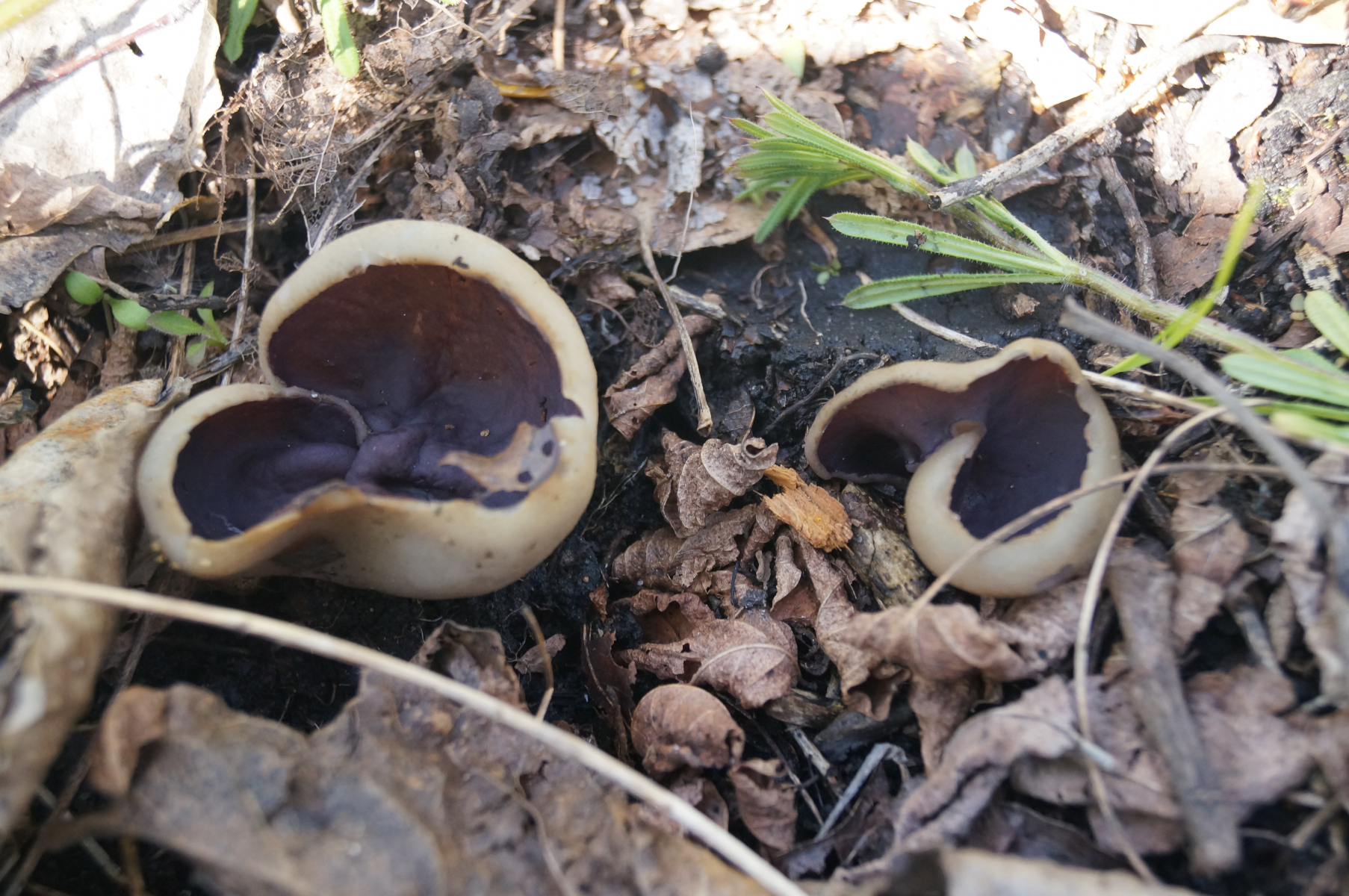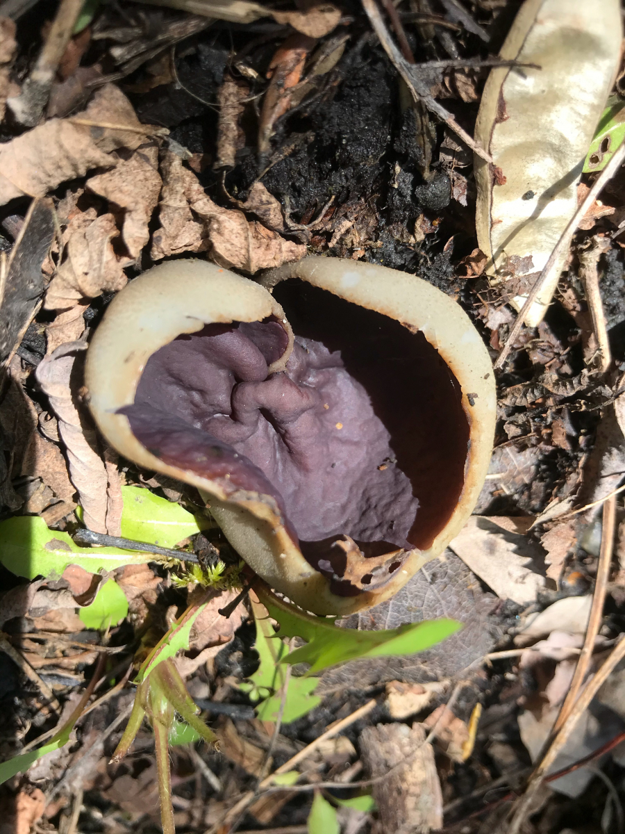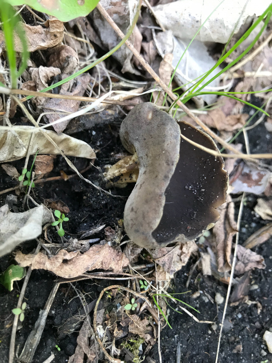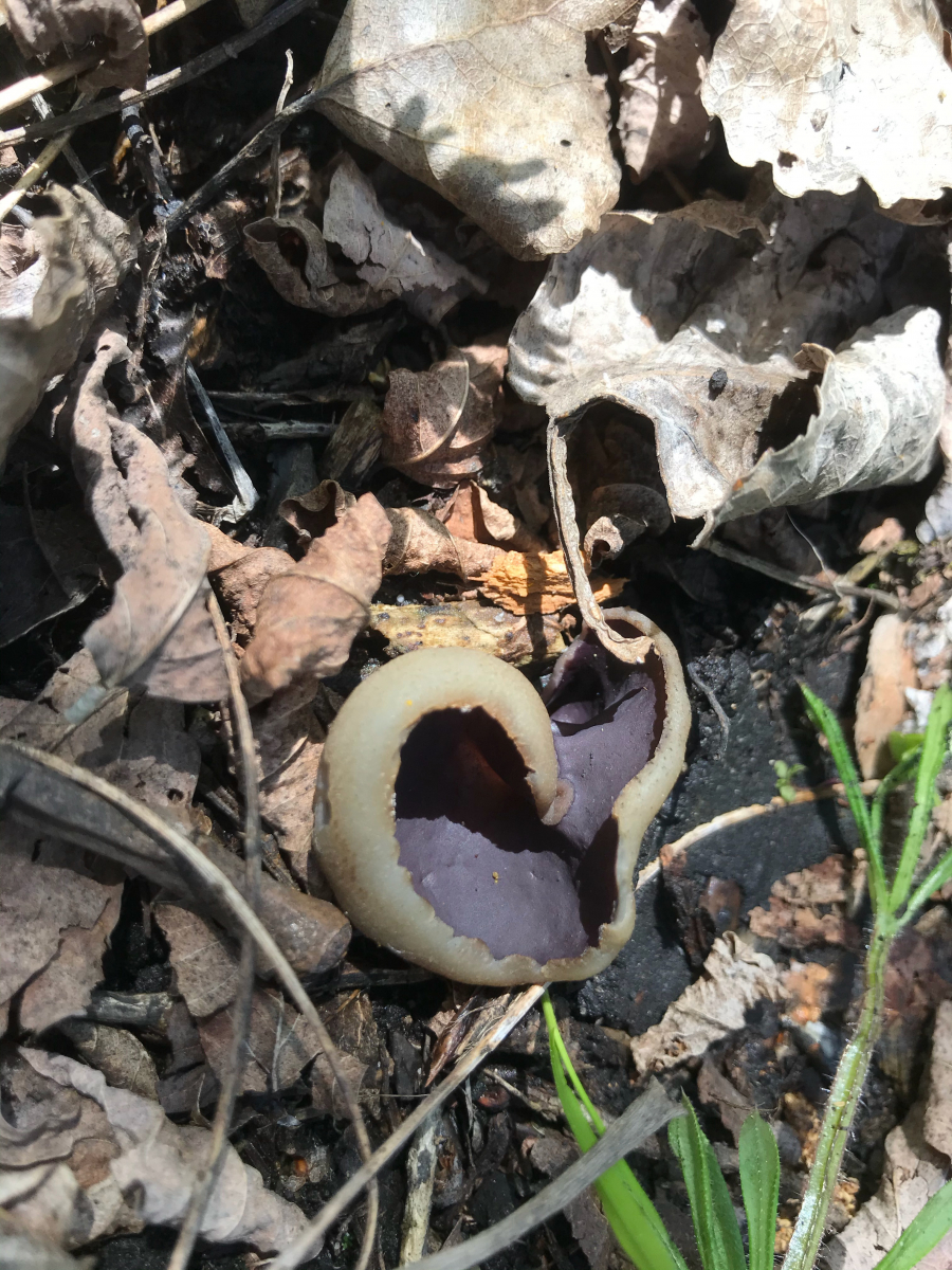 auf unserer Morcheltour heute haben Corne und ich einen tollen Becher mit violettbrauner Innenseite sowie eine gestielte Becherlorchel (Stiel "rund", gefurcht, 3-4 cm lang; Kopf becherförmig, schwarz) gefunden.