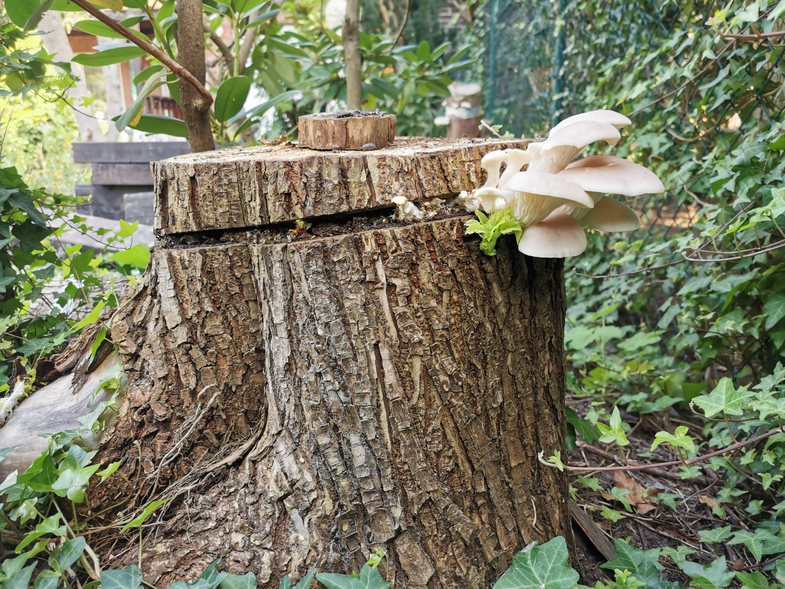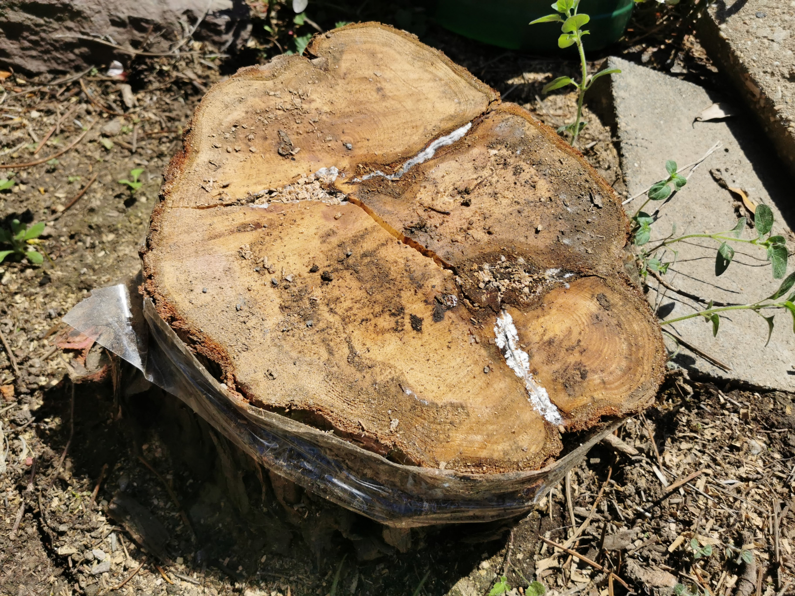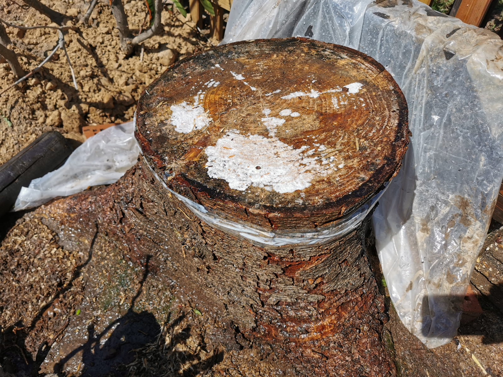 heute habe ich wegen der warmen Temperaturen mal meine vor Wochen beimpften Baumstümpfe gelüftet und kräftig gegossen. Habe sie unter einer milchig-transparenten, gelochten Folie, da kommt von allein zu wenig Wasser dran. Als ich die entfernt hatte, konnte ich auch schon sehen, wie das Myzel sich zumindest schon mal durch die Baumscheiben gekämpft hat. Ich hoffe, dass es ebenso in den Stumpf eingewachsen ist. Läuft also alles nach Plan ![]()
