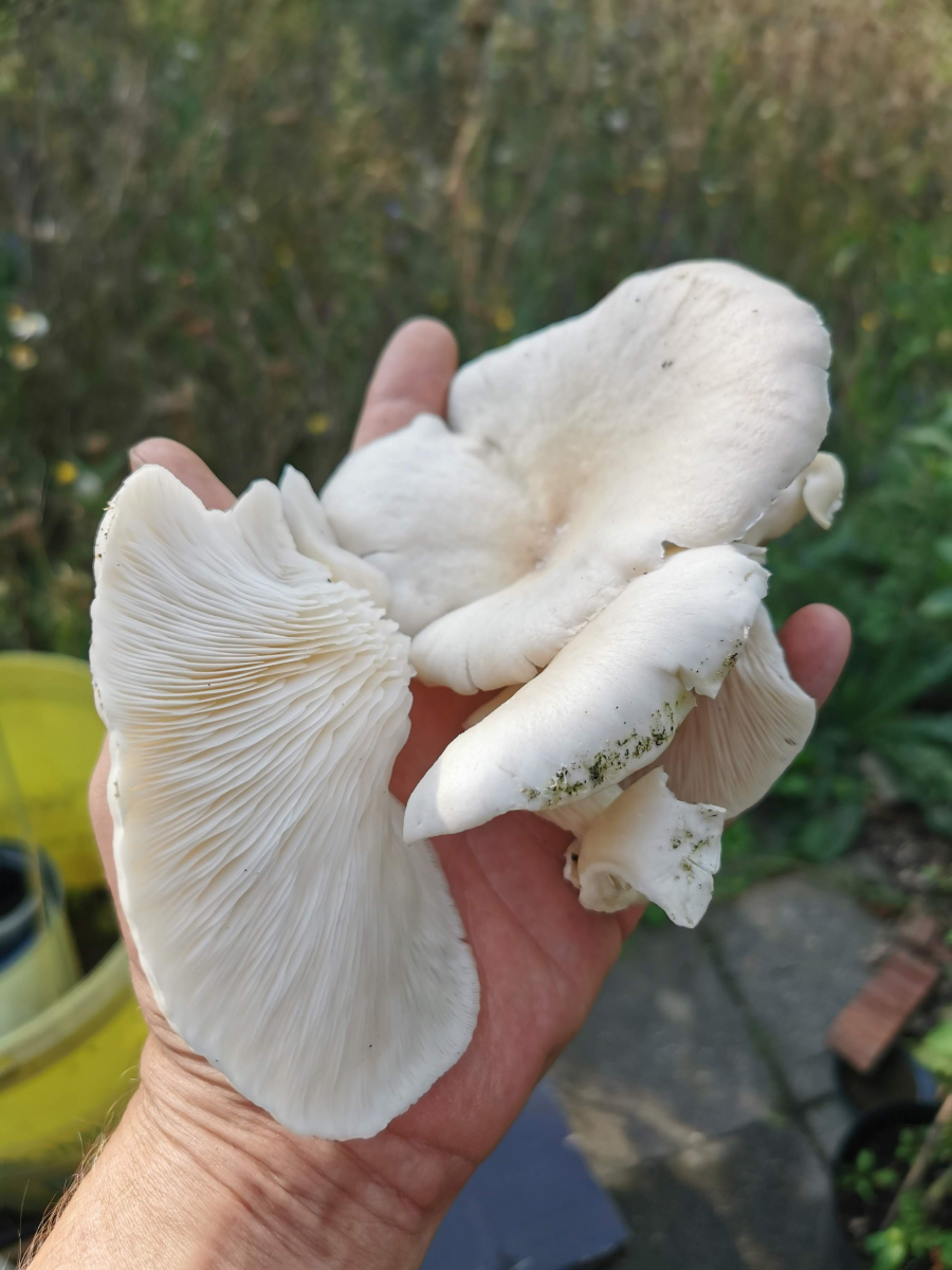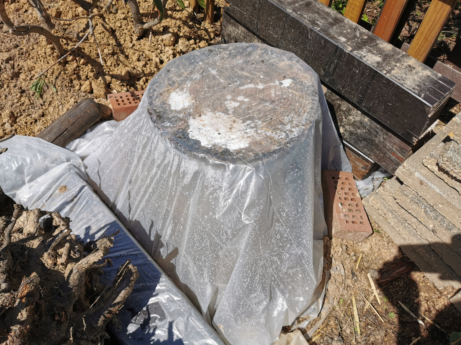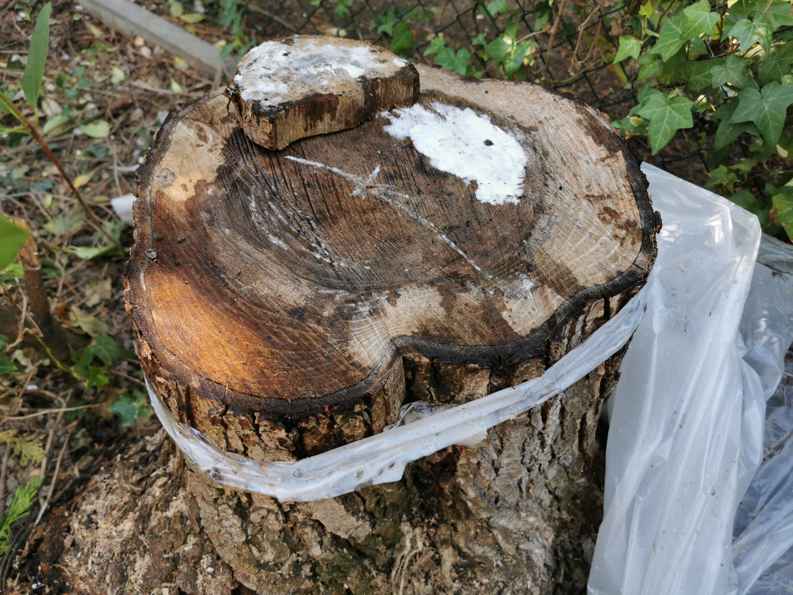 heute habe ich wegen der warmen Temperaturen mal meine vor Wochen beimpften Baumstümpfe gelüftet und kräftig gegossen. Habe sie unter einer milchig-transparenten, gelochten Folie, da kommt von allein zu wenig Wasser dran. Als ich die entfernt hatte, konnte ich auch schon sehen, wie das Myzel sich zumindest schon mal durch die Baumscheiben gekämpft hat. Ich hoffe, dass es ebenso in den Stumpf eingewachsen ist. Läuft also alles nach Plan ![]()