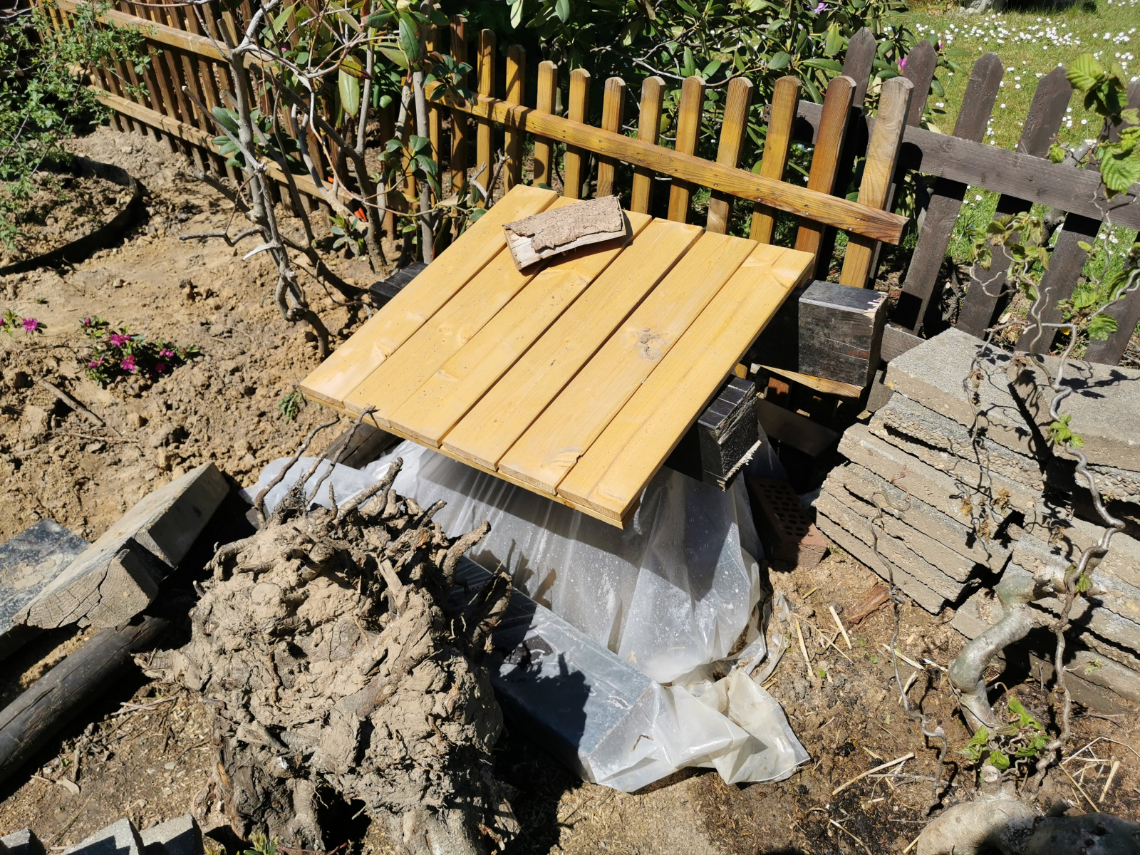 3. Stumpf der Fichte mit Dach zur Abschattung. Sonst knallt die Sonne zu sehr drauf.