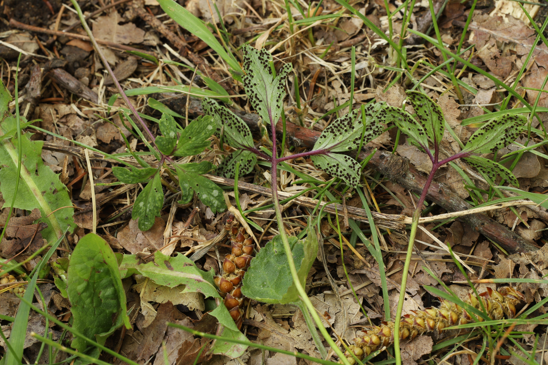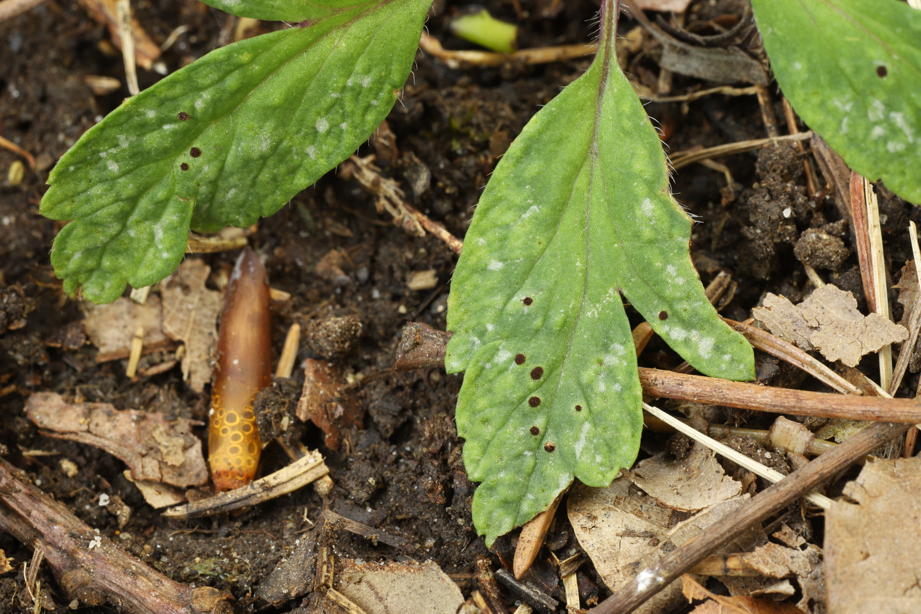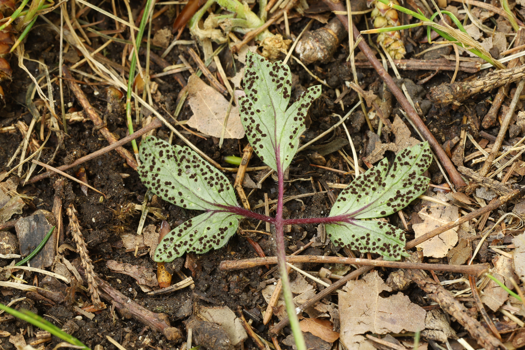 Erstmal der makroskopische Eindruck - ja, der ist nicht so sonderlich hübsch. Eine Pflanzenkrankheit eben, die die Blätter des Buschwindröschens verändert und mit Telienlagern bestückt. Ich habe die Tranzschelia beim Gassigehen (ohne Kamera) gefunden, habe sie daher nachträglich fotografieren müssen: