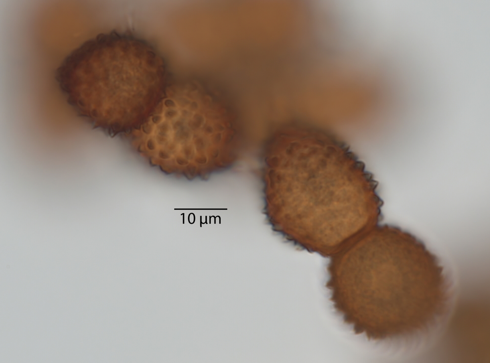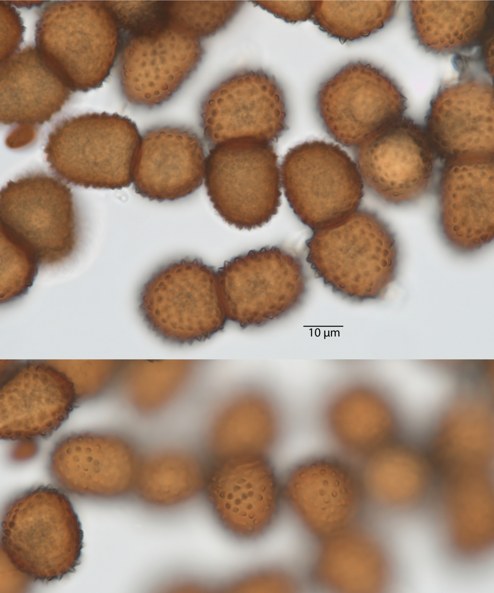 Die Teliosporen sind sehr groß, zweizellig und haben dieses irre Ornament. Aus den Telien werden übrigens später die Basidien keimen. Es ist also ein Dauerstadium, welches dikaryotisch ist (zwei Kerne pro Zelle, je einer von einem der beiden Geschlechtspartner) und das nur dazu da ist, die Sexualität abzuschließen. Die Basidien wachsen aus, in ihnen verschmelzen die Kerne, es kommt zur Reduktionsteilung und dann werden sexuelle Sporen gebildet. Das passiert dort, wo die Teliosporen hinfallen (oder, wenn sie am Blatt bleiben, später dort). Die Telien sind deshalb so groß - sie müssen ja die Nährstoffe speichern, die die Basidien später benötigen, um die eigentlichen Sporen zu bilden. Die Telien sind also sehr wichtig, deshalb auch gut geschützt - dunkel gefärbt (UV-Schutz, Schutz vor Mutationen), dicke Wände und das stachlige bis noppige Ornament (Fraßschutz).