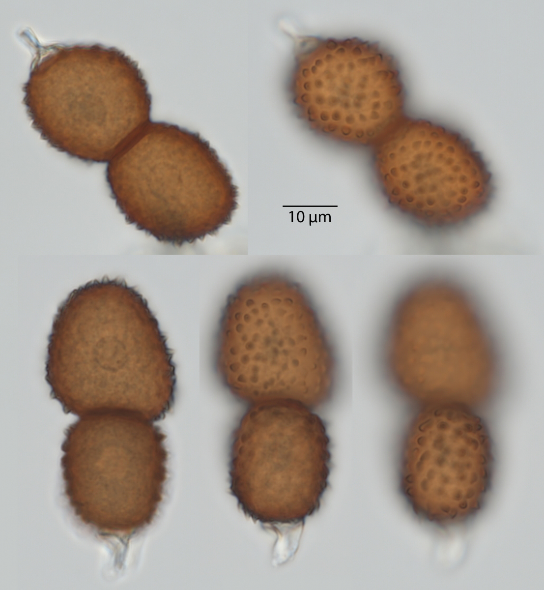 Ich habe oben und unten je eine Teliospore in unterschiedlichen Schärfebenen zusammengestellt.