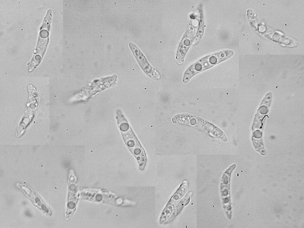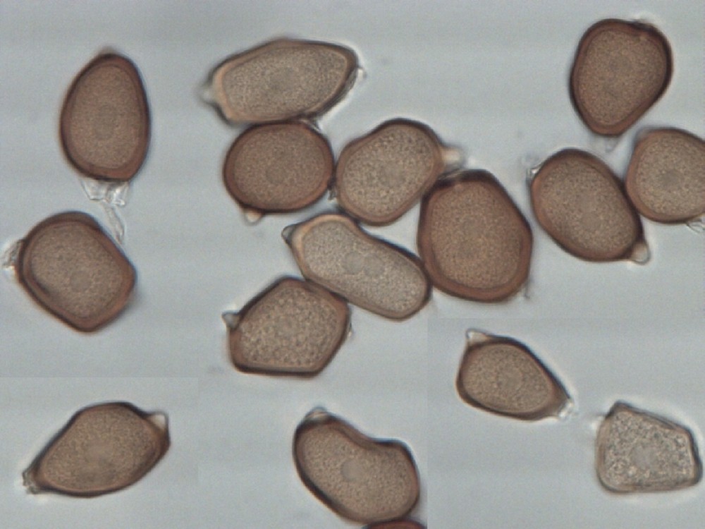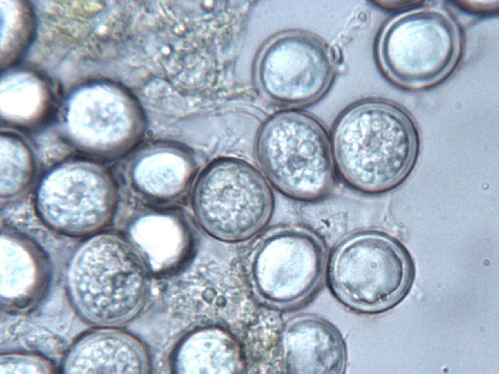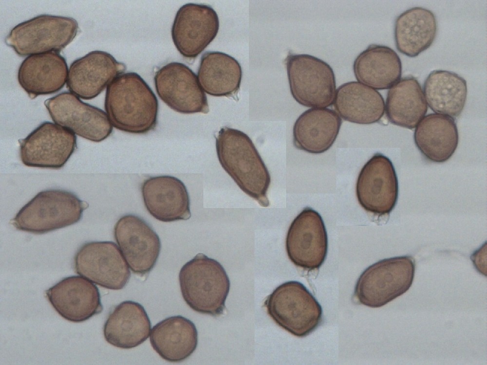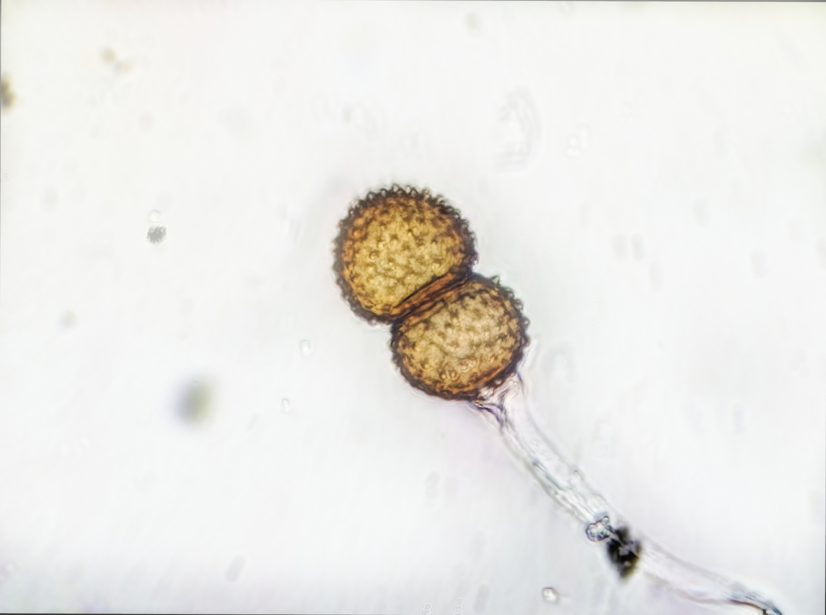 Die Teliosporen sind sehr groß, zweizellig und haben dieses irre Ornament. Aus den Telien werden übrigens später die Basidien keimen. Es ist also ein Dauerstadium, welches dikaryotisch ist (zwei Kerne pro Zelle, je einer von einem der beiden Geschlechtspartner) und das nur dazu da ist, die Sexualität abzuschließen. Die Basidien wachsen aus, in ihnen verschmelzen die Kerne, es kommt zur Reduktionsteilung und dann werden sexuelle Sporen gebildet. Das passiert dort, wo die Teliosporen hinfallen (oder, wenn sie am Blatt bleiben, später dort). Die Telien sind deshalb so groß - sie müssen ja die Nährstoffe speichern, die die Basidien später benötigen, um die eigentlichen Sporen zu bilden. Die Telien sind also sehr wichtig, deshalb auch gut geschützt - dunkel gefärbt (UV-Schutz, Schutz vor Mutationen), dicke Wände und das stachlige bis noppige Ornament (Fraßschutz).