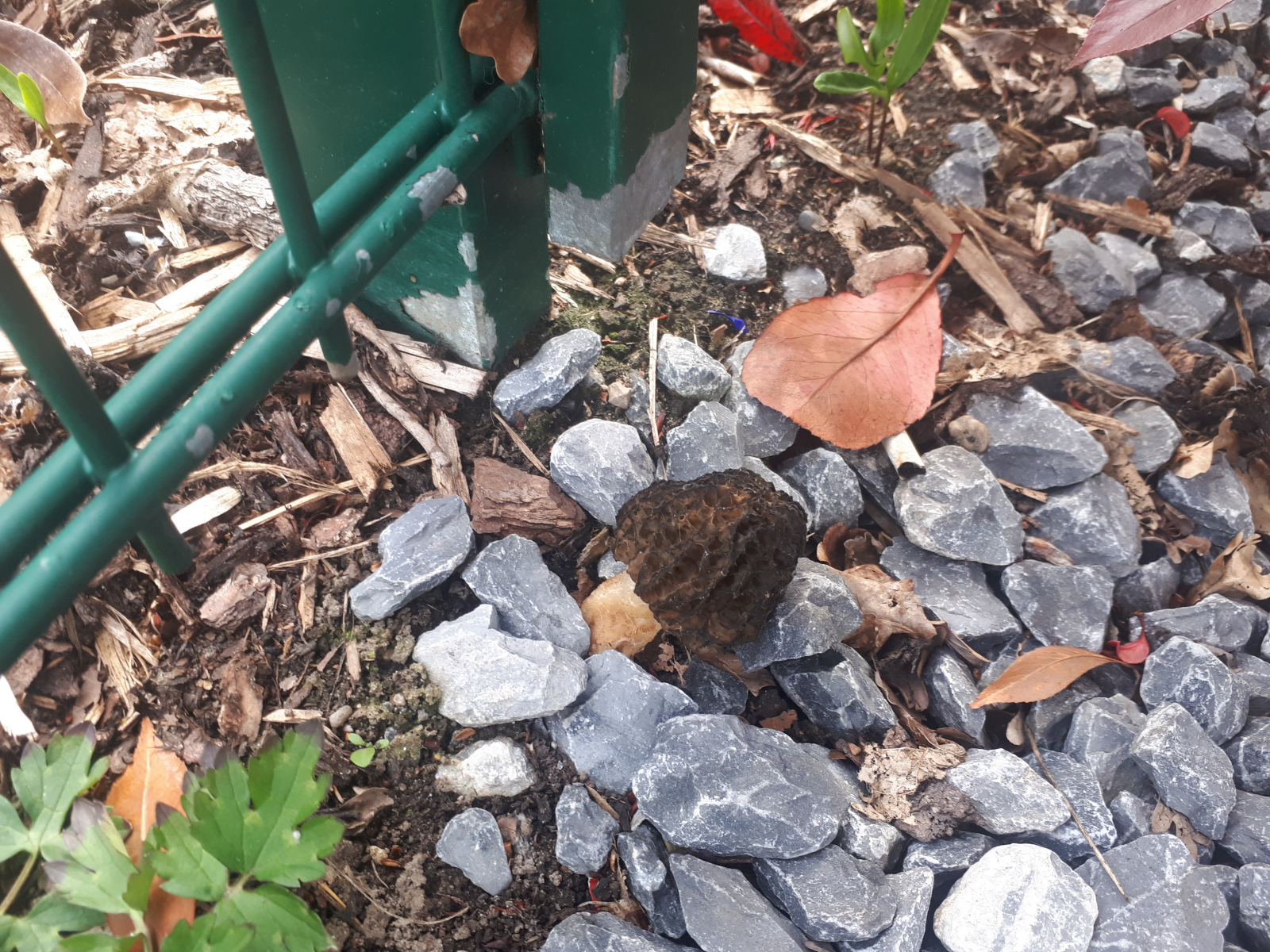 der Standort für diese Morcheln ist gar nicht so überraschend: Wie man auf deinem Foto sieht, liegt dort auch Rindenmulch bzw. Holzschnitzel. Aus diesen wachsen auf Parkplätzen oder ähnlichen Orten, wo eben diese Produkte verteilt werden, oft Spitzmorcheln heraus, da die Sporen der Morcheln (und oft auch anderer Pilzarten) mit dem Rindenmulch eingeschleppt werden. Das hat ihnen sogar den Spitznamen "RiMuMo" für "Rindenmulchmorchel" eingebracht.