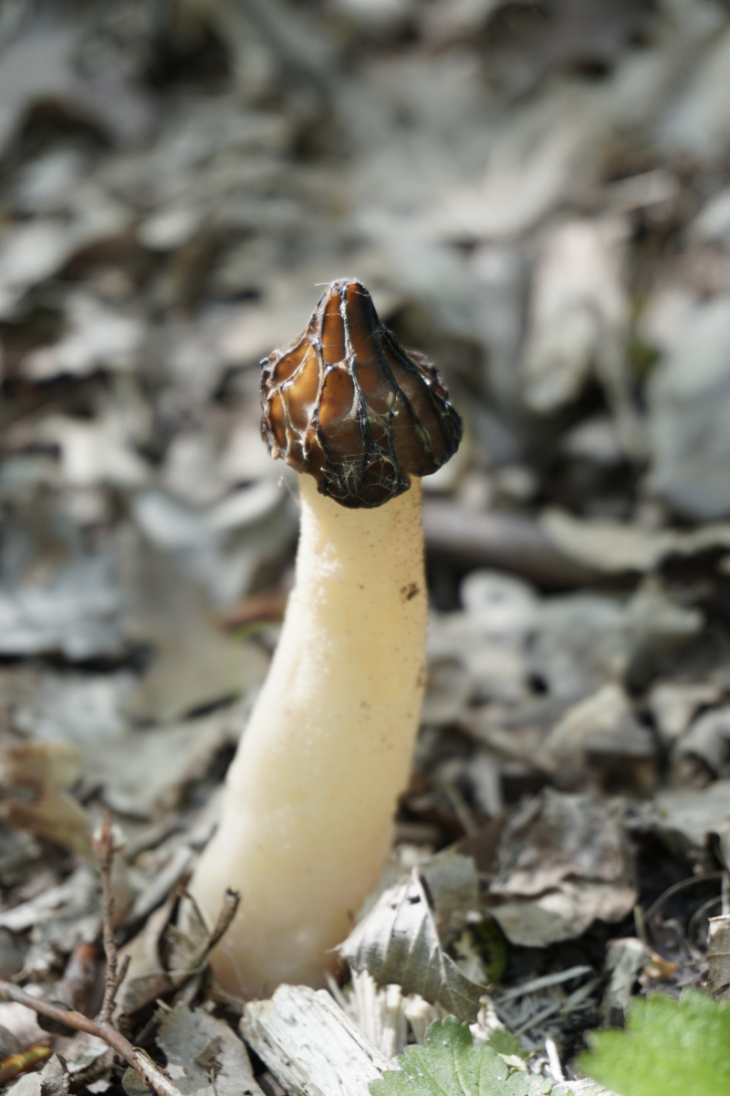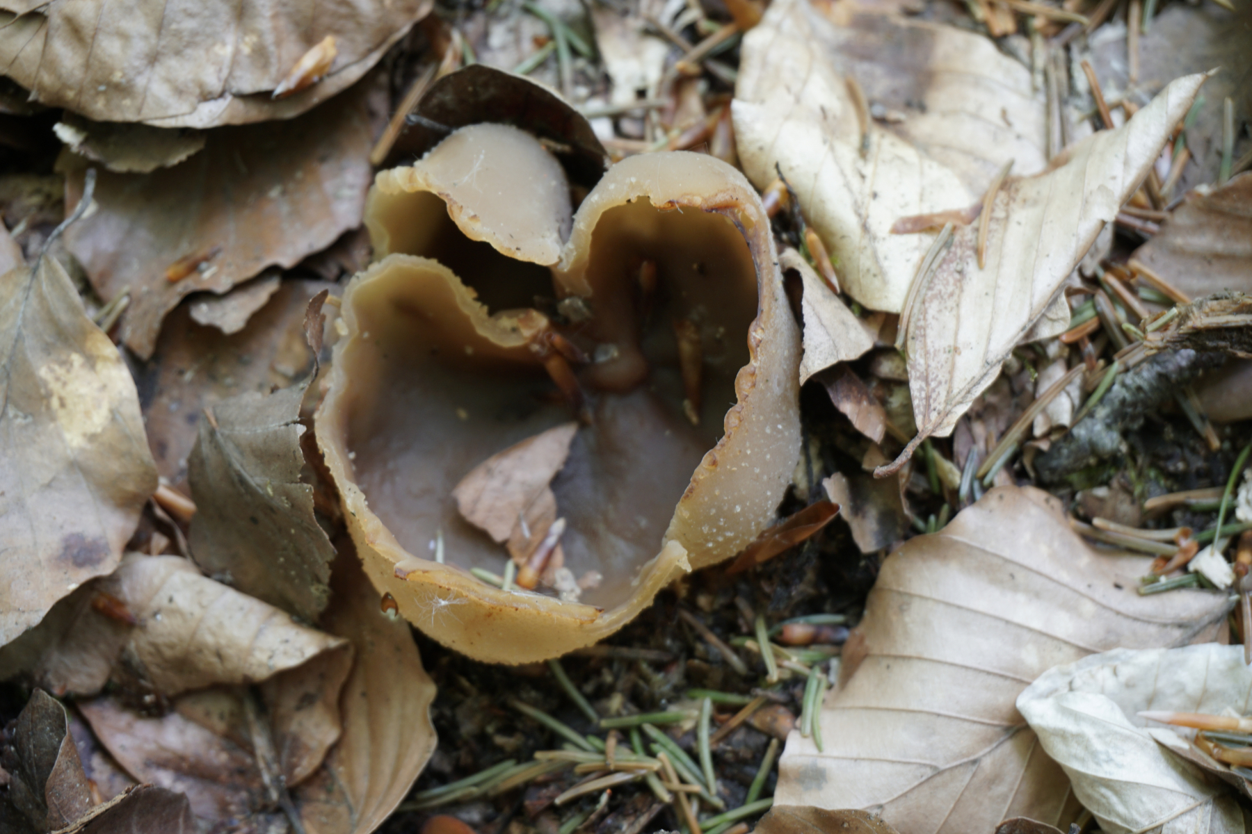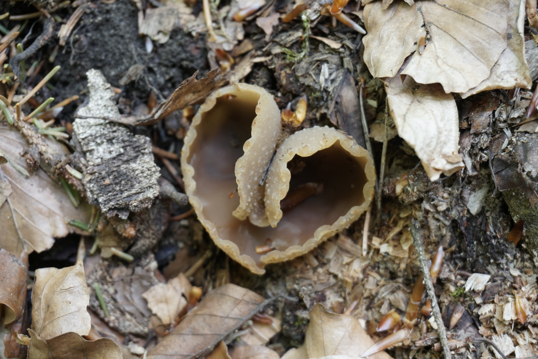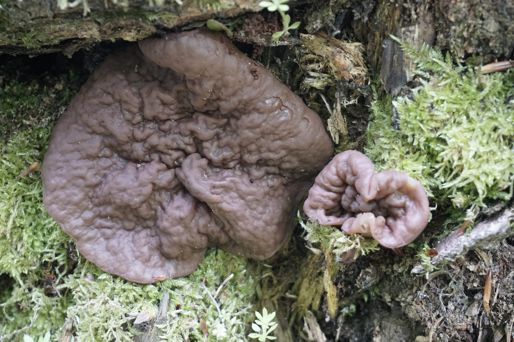 Die potenziele Scheibenlorchel war auf einem morschen Baumstamm. Mehrere Baumstammen standen in eine geordnete Reihe. Andere waren offensichtlich Nadelnholz, es war nicht zu erkennen den Stamm mit potenzielen Scheibenlorchel.