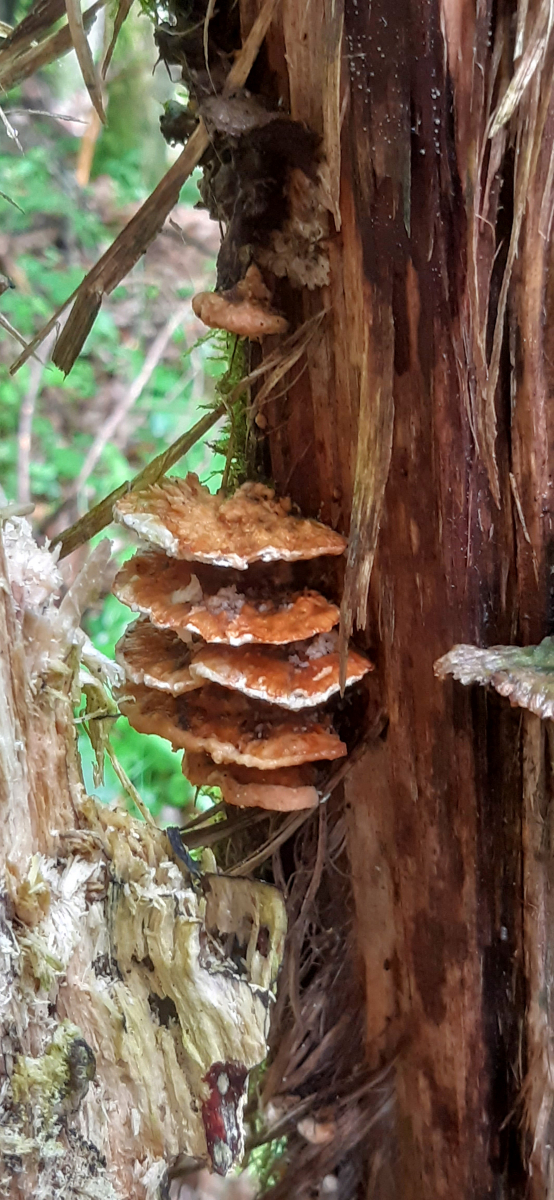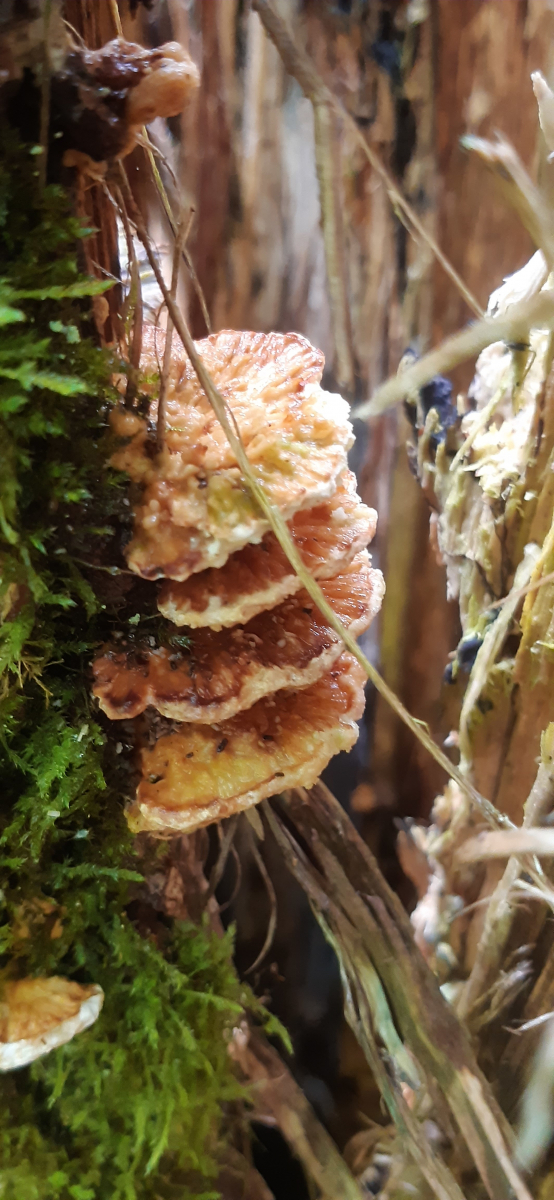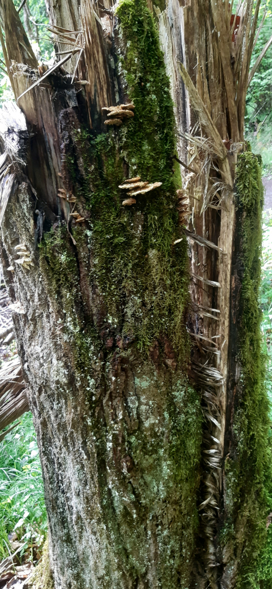 Von allen Seiten ist dieser mit ockerfarbenen Trameten bewachsen.