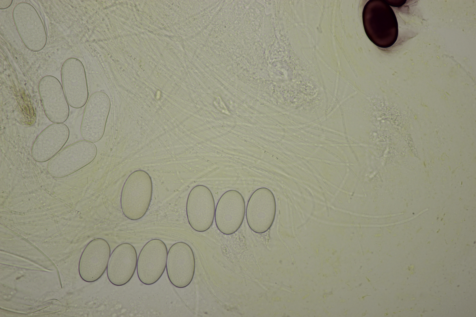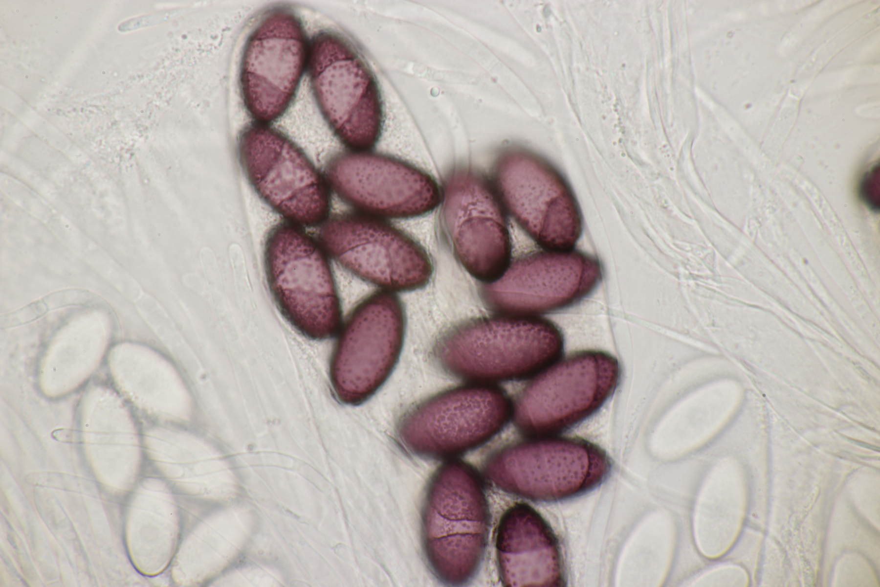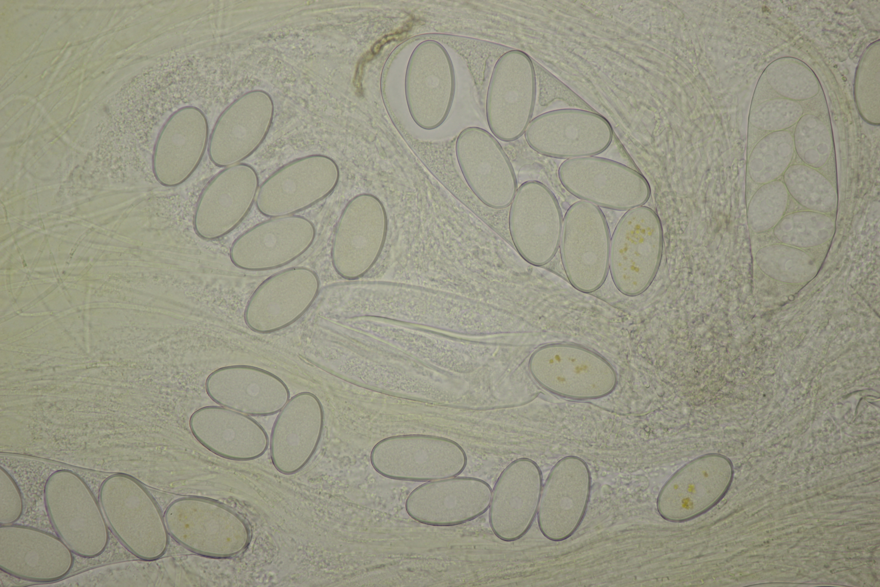 Mittlerweile gab es auch noch einen weiteren Ascobolus. Sporen messen (16-19) µm x (9-10) µm, der Fruchtkörper war weißlich und wollte wohl eines Tages mal groß werden, also lande ich bei A. sacchariferus. Das Schöne, wenn man einen Ascobolus nach dem anderen auf den Proben hat, ist, daß man da auch schon ohne genaues Ausmessen merkt, daß sich Sporengrößen und -formen zwischen verschiedenen Arten unterscheiden.