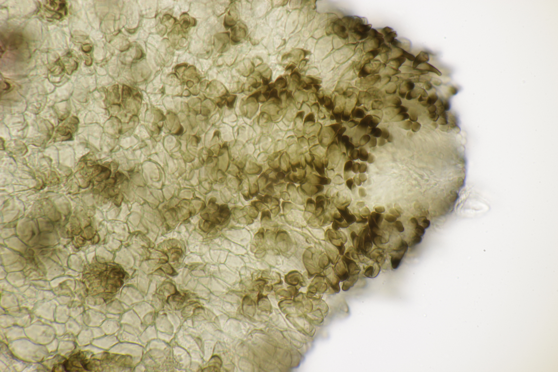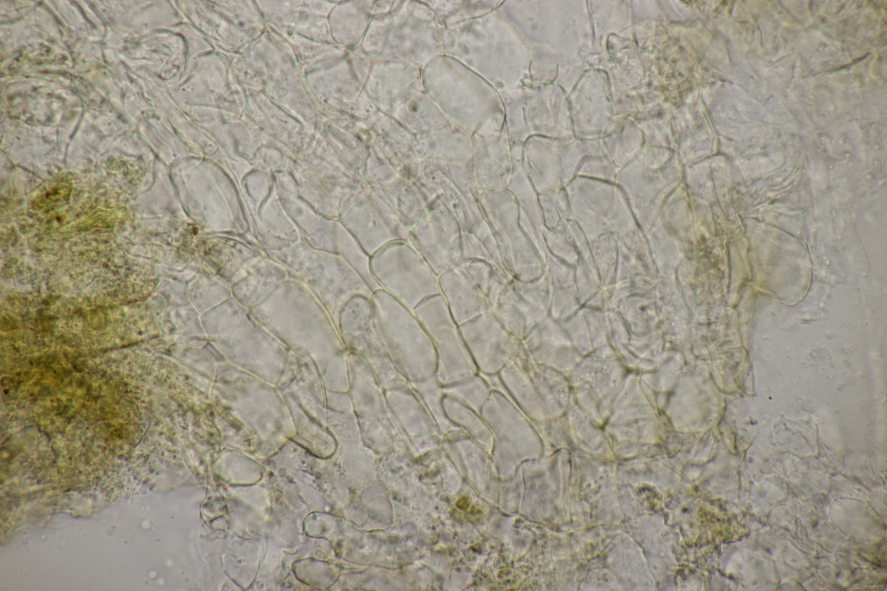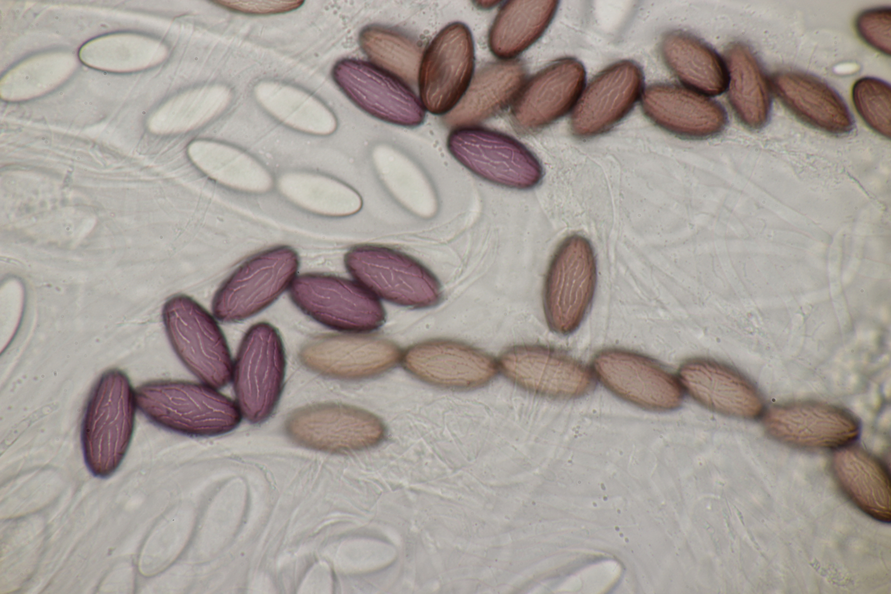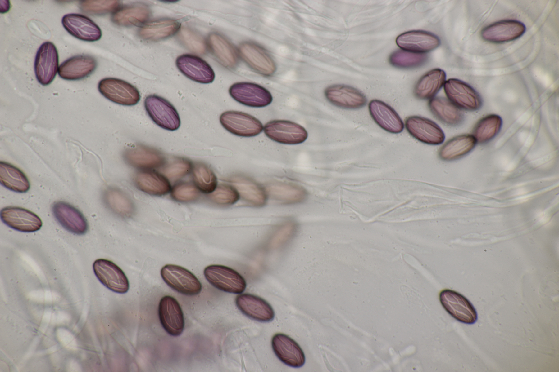 Mittlerweile gab es auch noch einen weiteren Ascobolus. Sporen messen (16-19) µm x (9-10) µm, der Fruchtkörper war weißlich und wollte wohl eines Tages mal groß werden, also lande ich bei A. sacchariferus. Das Schöne, wenn man einen Ascobolus nach dem anderen auf den Proben hat, ist, daß man da auch schon ohne genaues Ausmessen merkt, daß sich Sporengrößen und -formen zwischen verschiedenen Arten unterscheiden.