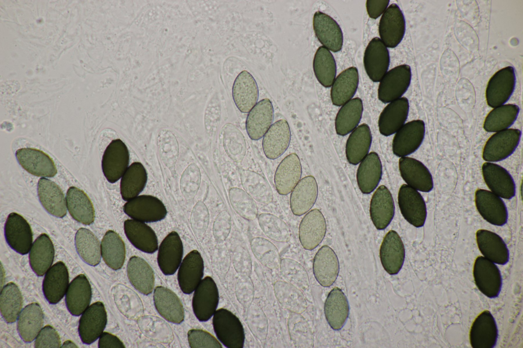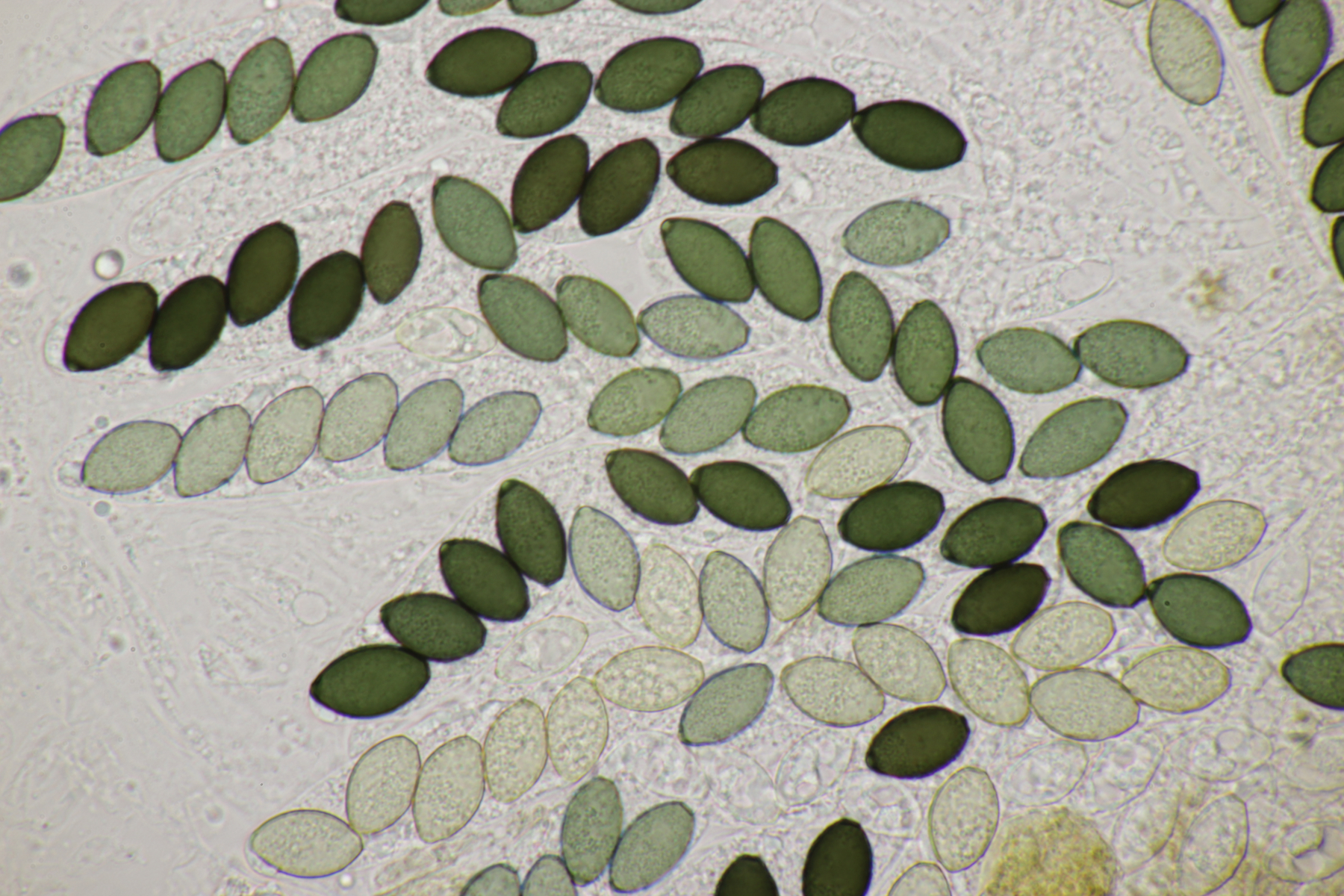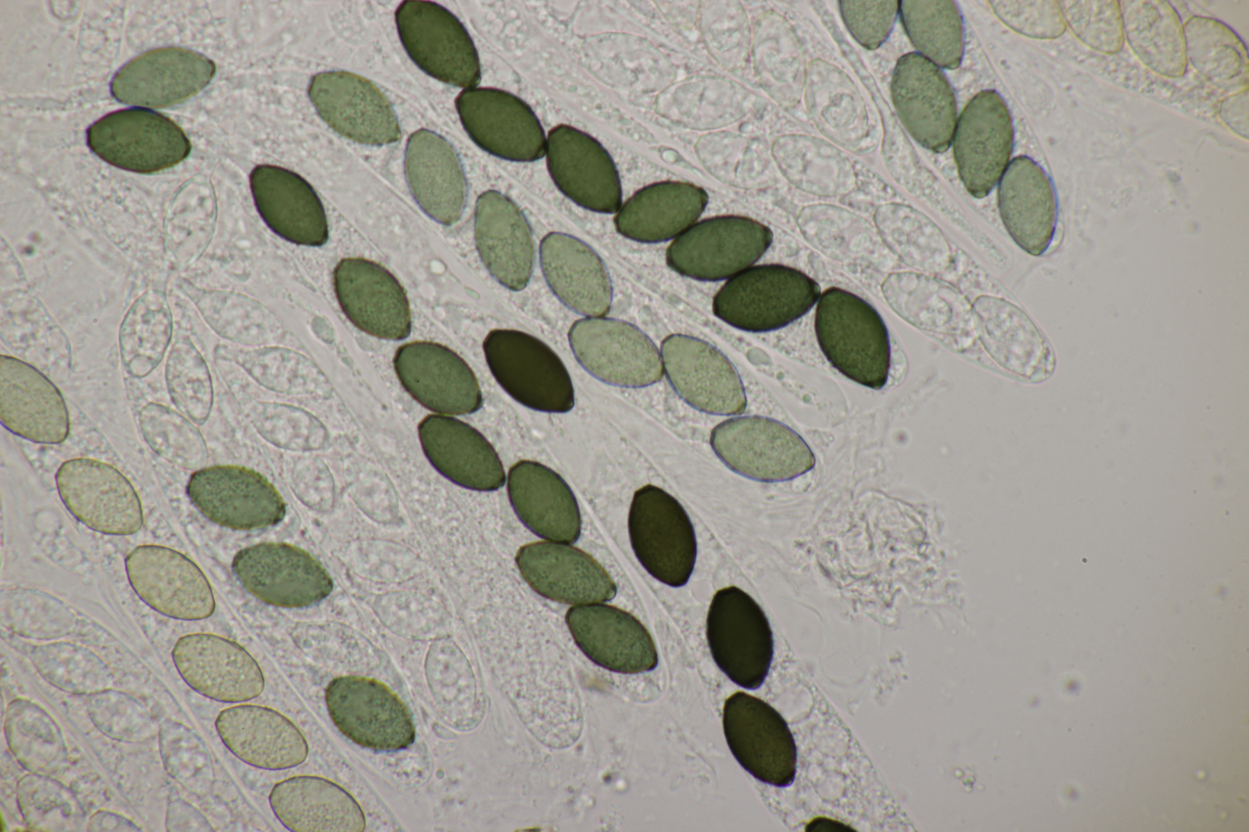 2. Und noch ein Ascobolus. Die Sporen messen (28-33) µm x (14-16) µm, so daß A. hawaiiensis raus ist. Damit bleiben noch A. stictoideus und A. degluptus im Rennen. Wenn ich mir ältere Forenbeiträge zu den beiden Arten anschaue, sind die nur schwer zu trennen (so es denn überhaupt zwei verschiedene Arten sind). Da hier das Epispor bei den älteren Sporen teilweise abgelöst erscheint (oder interpretiere ich die helleren Bereiche des Epispors falsch?), würde ich die Art als A. degluptus ablegen wollen, wenn es keine Einwände gibt.
