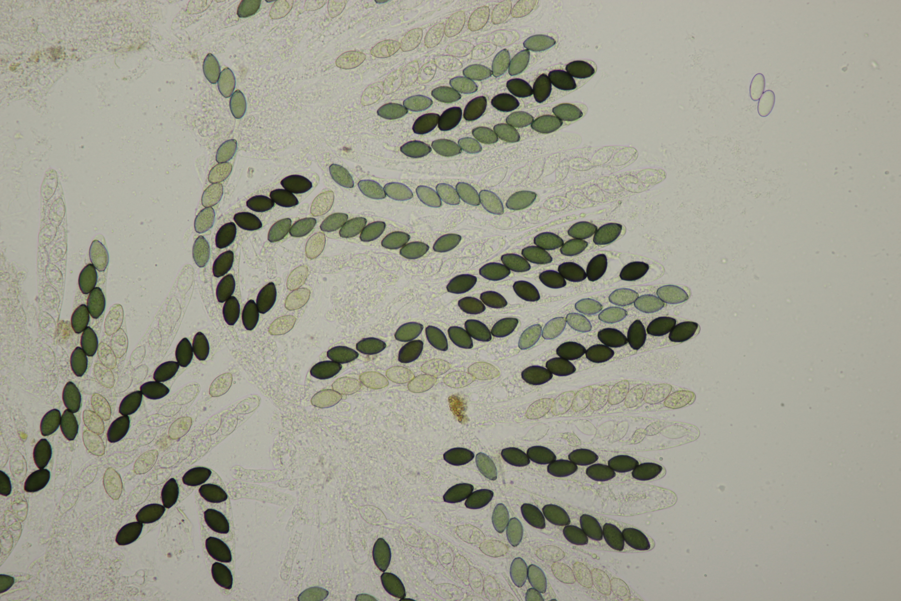 5. Langsam kommen auch die Pyrenomyceten aus ihren Löchern. Hier lande ich mit Sporen von (18-20) µm x (11-12) µm bei Schizothecium vesticola.