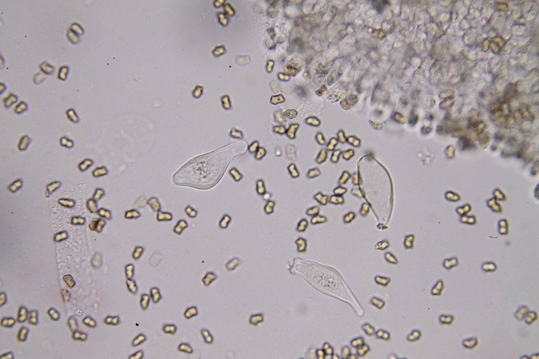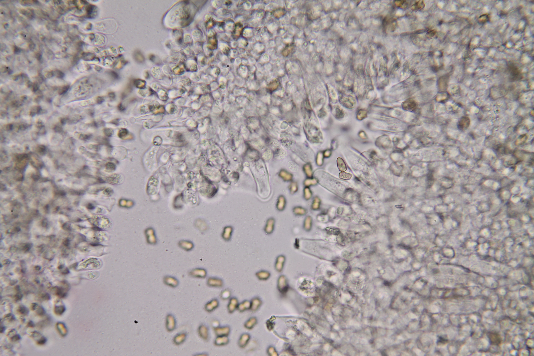 Sporen: 10-12,5 x 5-7,5 µm, sehr formvariabel von rechteckig bis trapezförmig bis projektilförmig; teilweise auch mit 1-2 Höckern por Spore