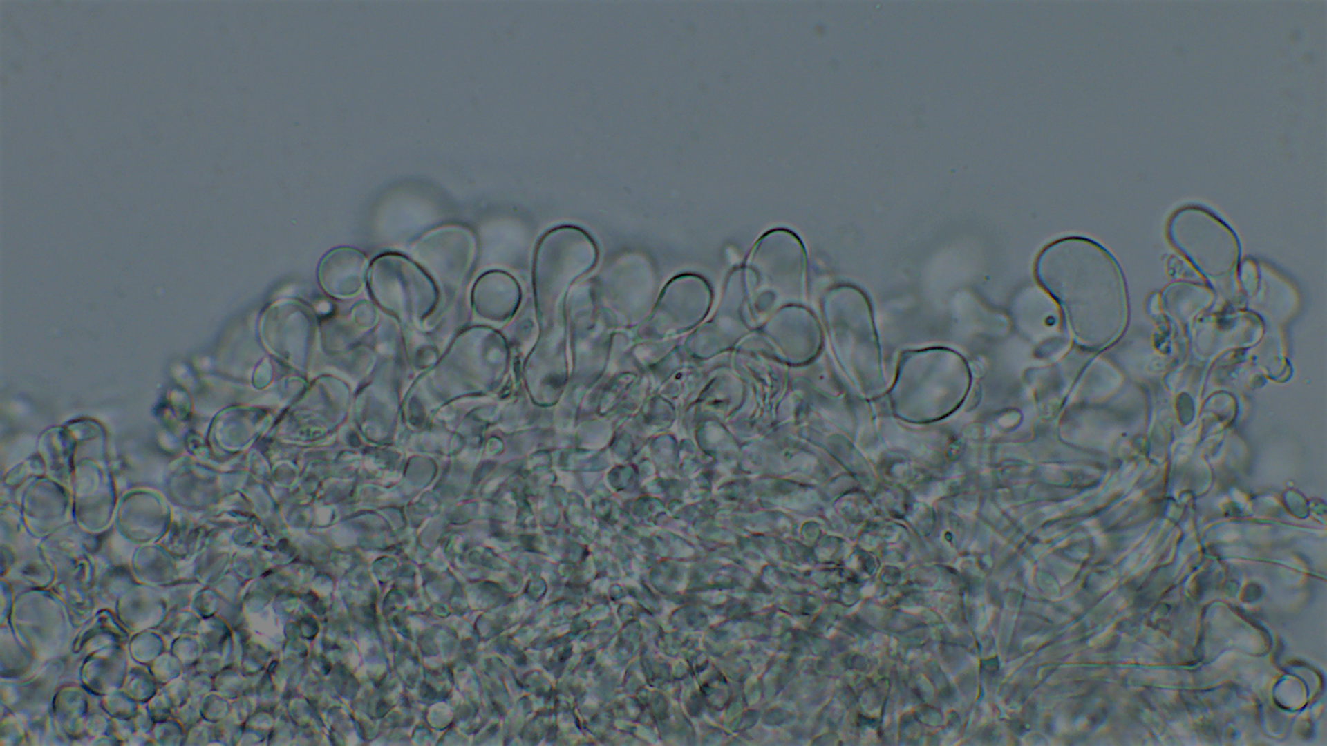 Um zu sehen, ob ich das Wissen direkt anwenden kann, wollte es das Schicksal, dass ich während einer Arbeitspause direkt auf den nächsten Rübling stieß, den ich nun als Gymnopus aquosus ansprechen würde. Der Farbverlauf des Hutes war im Randbereich heller als im Zentrum. Die Cheilozystiden waren diesmal nicht so zahlreich vorhanden, bestanden aber hauptsächlich aus dieser keulenförmigen und im Apex aufgeblähten Form. Also kein chaotischer verzweigter Aufbau erkennbar.