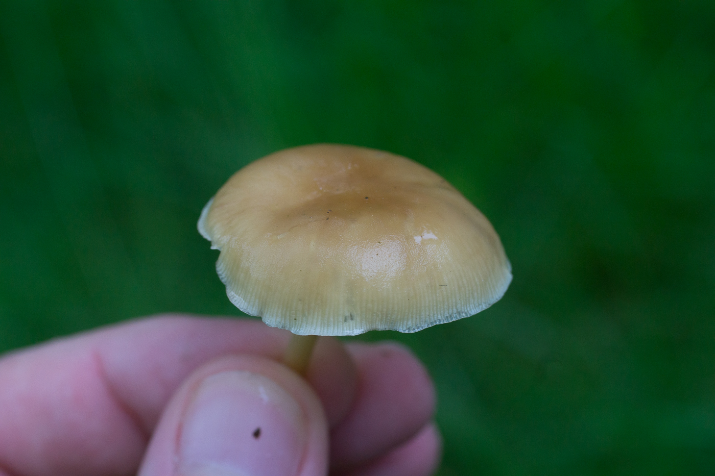 recht dunkle Fruchtkörper mit nur angedeuteten Riefen am Rand und gelbstichige Lamellen. (Kommt auf den Fotos nicht gut rüber.