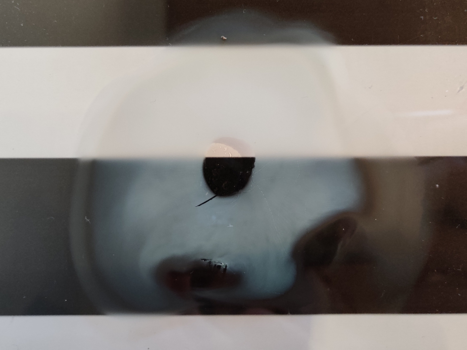 Um noch sicherer mit der Bestimmung zu sein versuchte ich einen Sporenabwurf zu machen. Es war erst mein dritter Sporenabwurf und von dem Ergebnis war ich ziemlich überrascht. Bei meinen vorherigen Abwürfen (mit Täublingen) funktionierte alles wie erwartet. Die Sporen sammelten sich als feines Pulver in der Form der Lamellen auf der Glasplatte. Bei dem Maipilz bildete sich eine dünne verschwommene Schicht, die am Glas angetrocknet ist. Mir schien es als wär ziemlich viel Feuchtigkeit im Spiel gewesen. Ich hatte den Fruchtkörper auf der Glasplatte mit einer Schüssel abgedeckt. Habt ihr Erklärungen und/oder Tipps was ich das nächste mal besser machen kann. Vielleicht "luftiger" abdecken.:/ Ich hatte Probleme den Sporenabwurf auf der Glasplatte zu fotografieren, ich hoffe man kann erkennen was ich beschrieben habe.