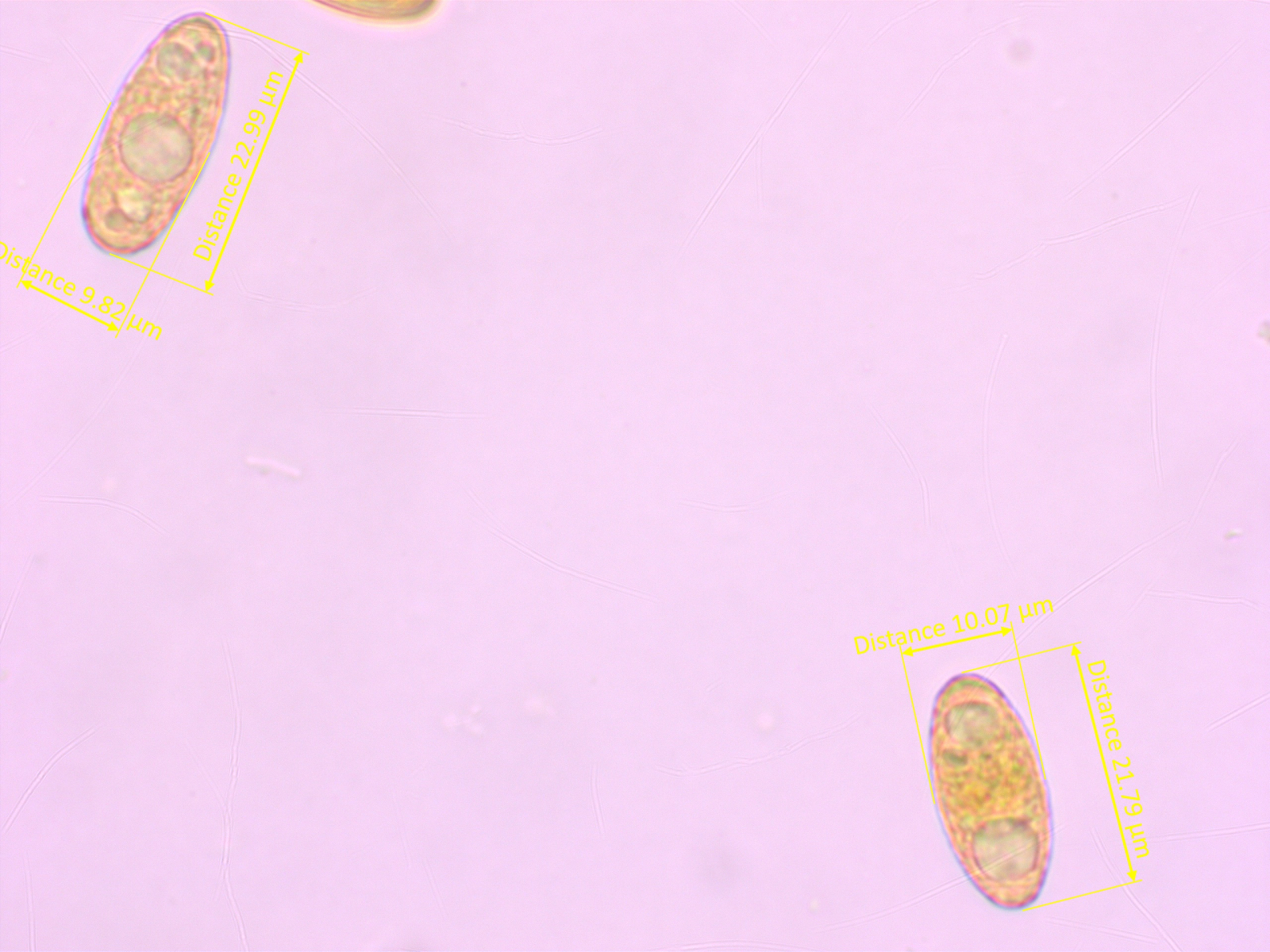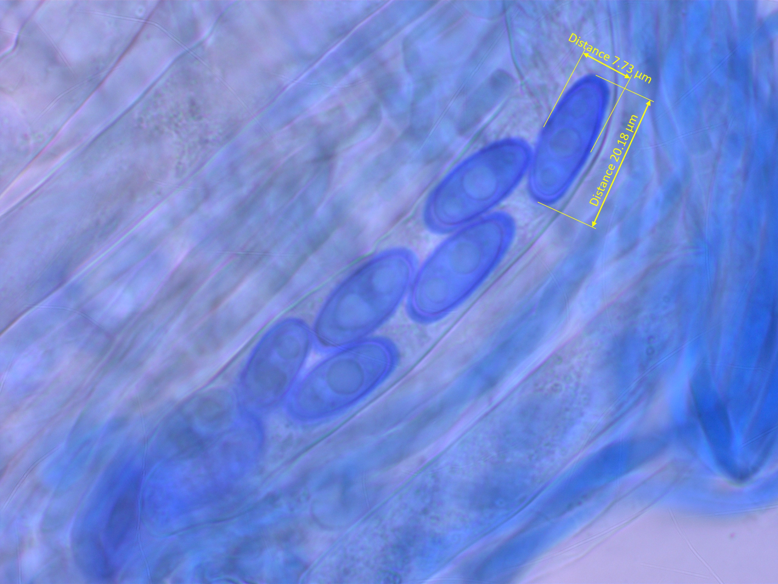 Zuerst in Lugol, dann in Baumwollblau. Sie sind so etwa 18-22x7-10 µm gross, mit 2-3 Tropfen, und etwas rauh.