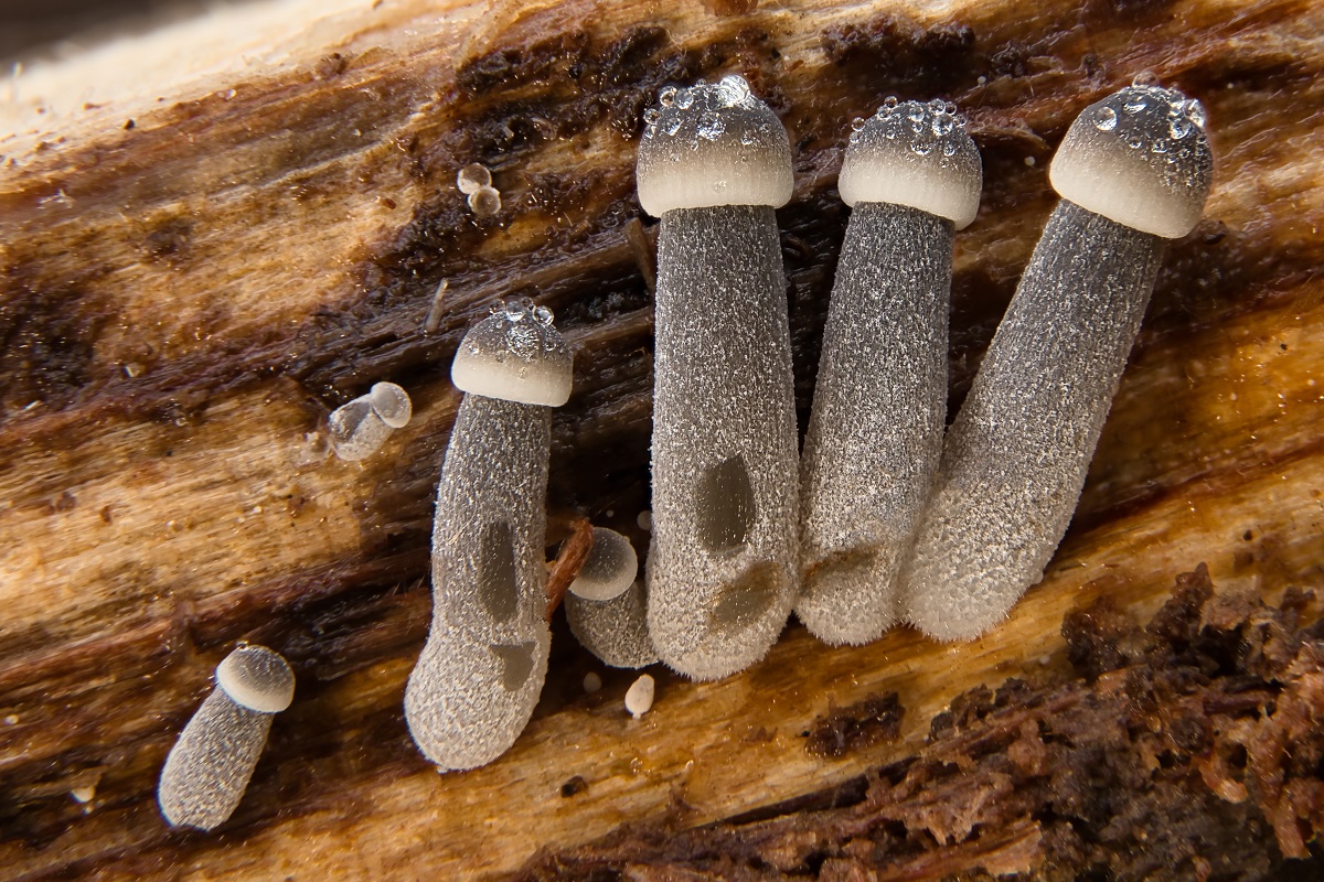 Diese juvenilen Pilze habe ich Mitte Mai auf einem vermodernden Holzstück in einem Mischwald gefunden. Sie sind auf der Unterseite gewachsen. Der größte Pilz ist maximal 1 cm hoch. Leider habe ich keinen Ansatzpunkt, aus welcher Ecke sie kommen. Daher bin ich für jeden Tipp sehr dankbar.