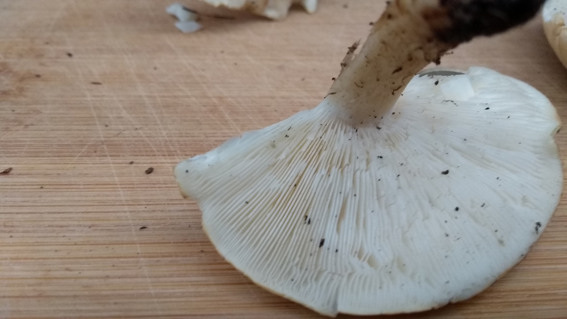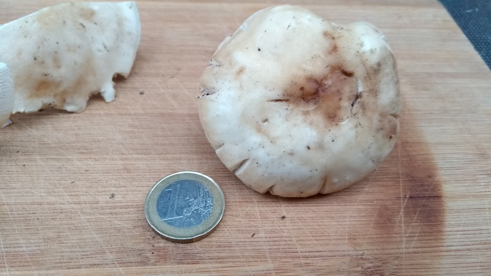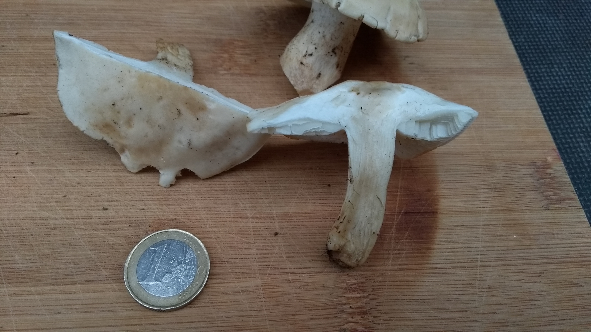 Der Fundort unter lichten Fichten und einem großen Ahorn zwischen Brombeeren und Efeu. Die Pilze sind fest, haben trockene Hüte und riechen unglaublich intensiv. Halbiert ist der Geruch nach Gurken für meine eigentlich gar nicht so gute Nase schon fast zu viel. Der halbierte Pilz zeigte nach Druck auch nach einer Stunde noch keine rötliche Verfärbung. Mehl konnte ich ich als Geruch nicht identifizieren. Farbe, Fundort, engstehende Lamellen, Dicke des Hutfleisches und Geruch lassen mich fest an einen Maipilz (Calocybe gambosa) glauben, was anderes kann ich mir eigentlich nicht vorstellen. Gibt es Bestätigungen zur Bestimmung oder andere Meinungen. Danke schon mal.