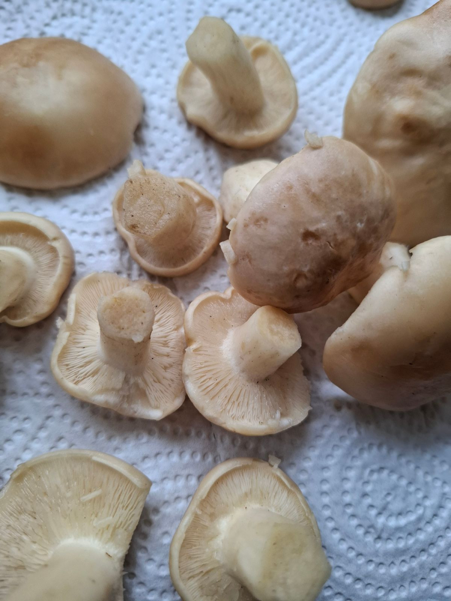 Beim Putzen von Pilzen mache ich eigentlich immer noch eine finale Qualitätskontrolle. Bei Maipilzen gehört dazu, dass die Finger schmierig werden. Liegt vielleicht daran, dass ich immer mit den Fingern über den Hut streiche. Ist vielleicht ein weiteres makroskopisches Erkennungszeichen.