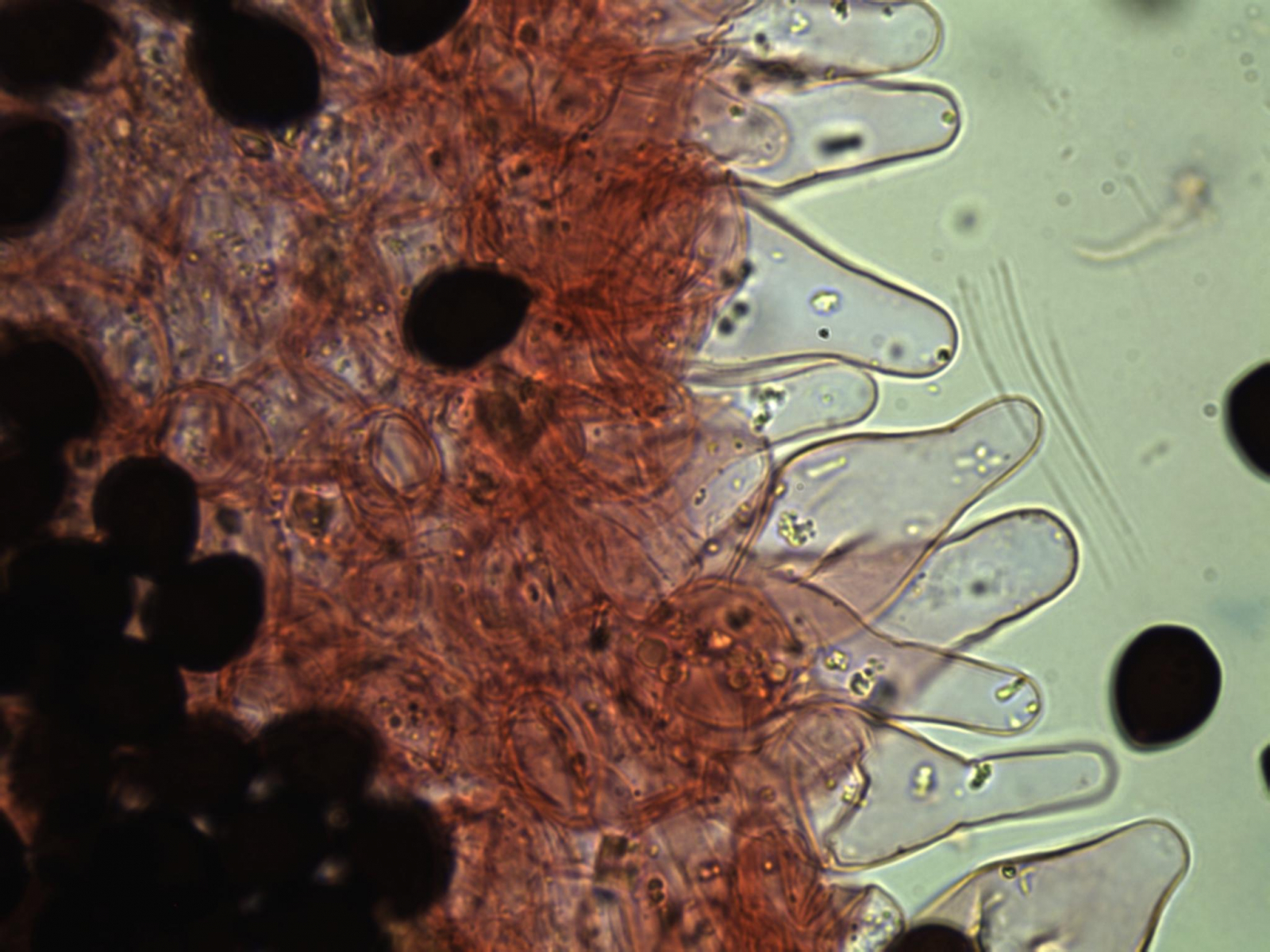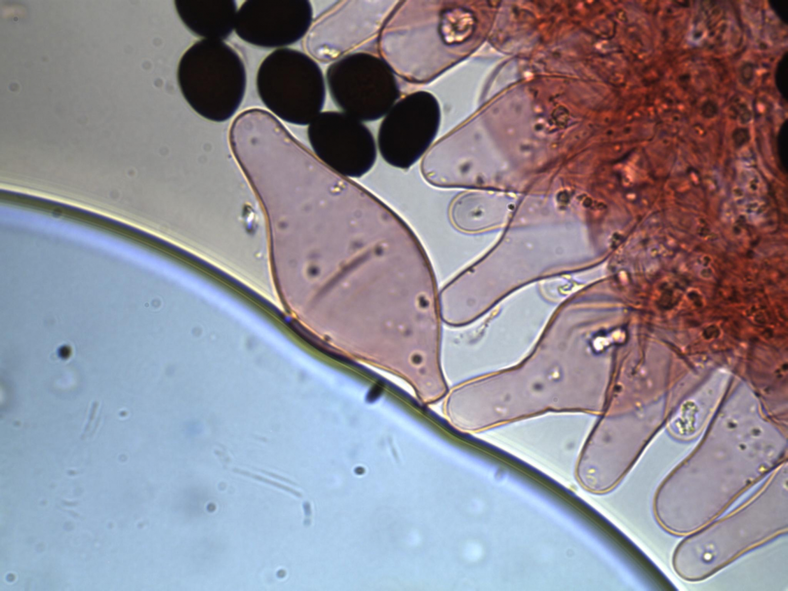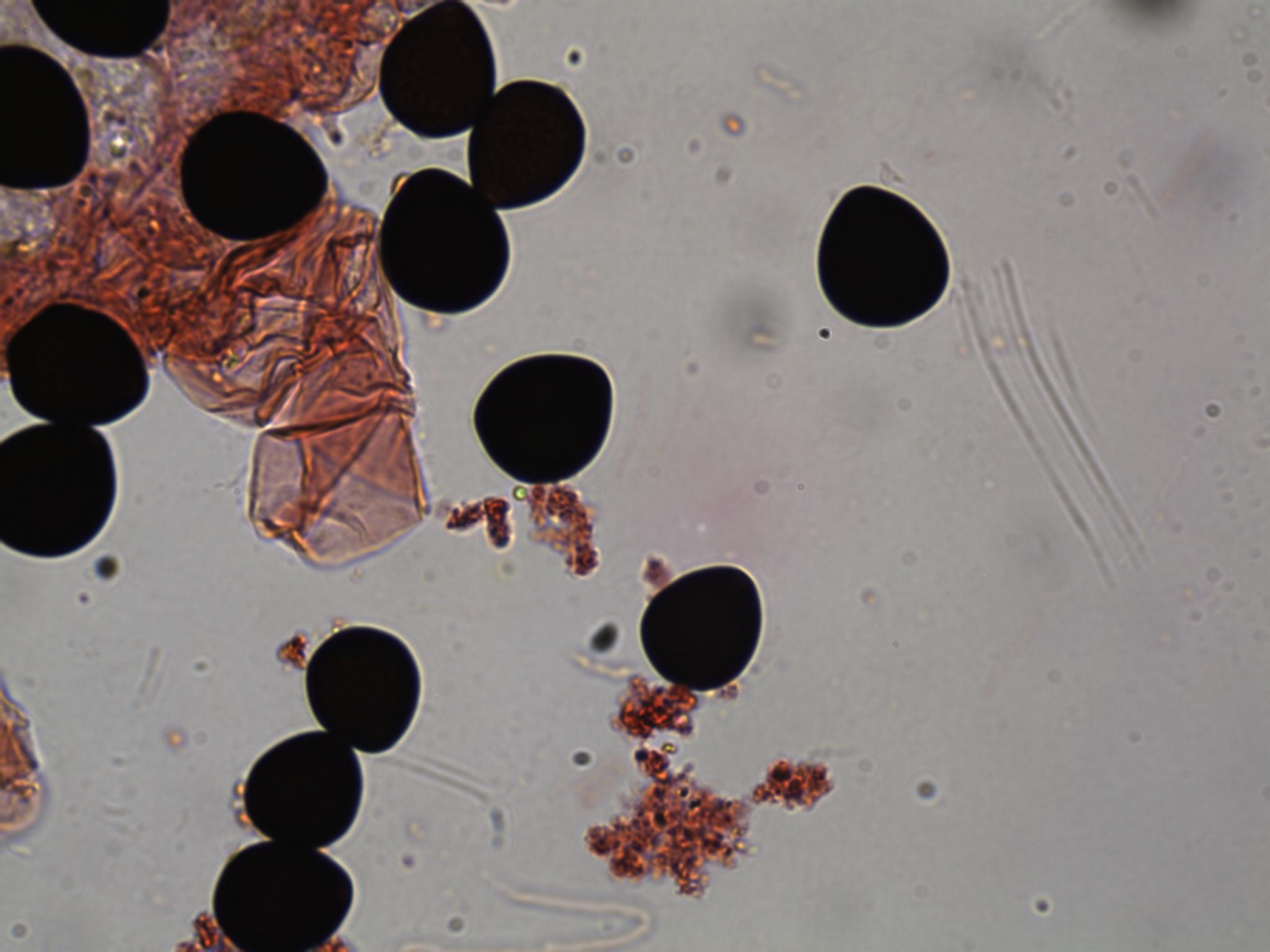 Da bleibt nicht viel zum Mirkoskopieren übrig. Und es war nur ein Exemplar. Also schnell noch die Sporen gemessen (in Kongorot NH3).