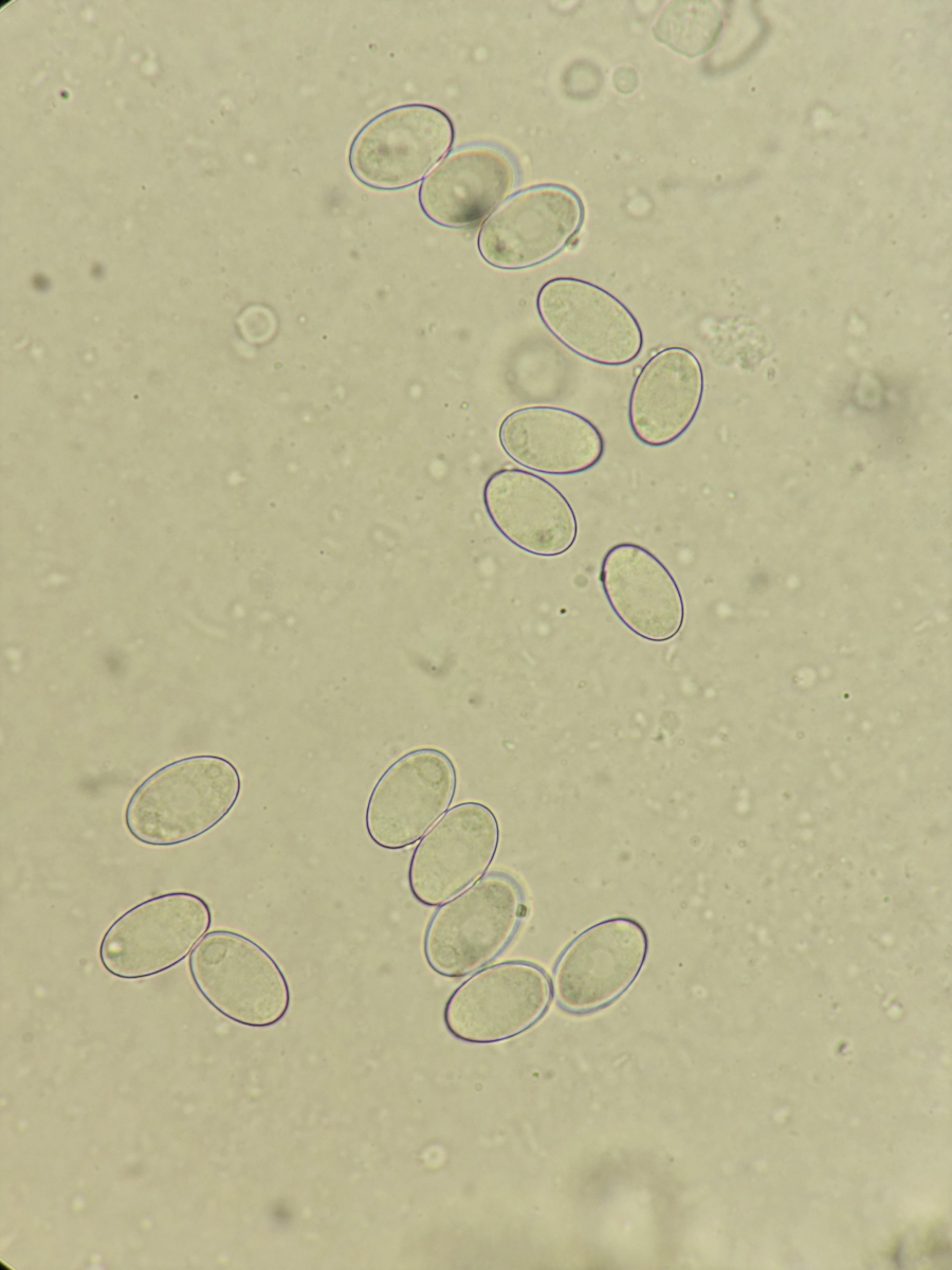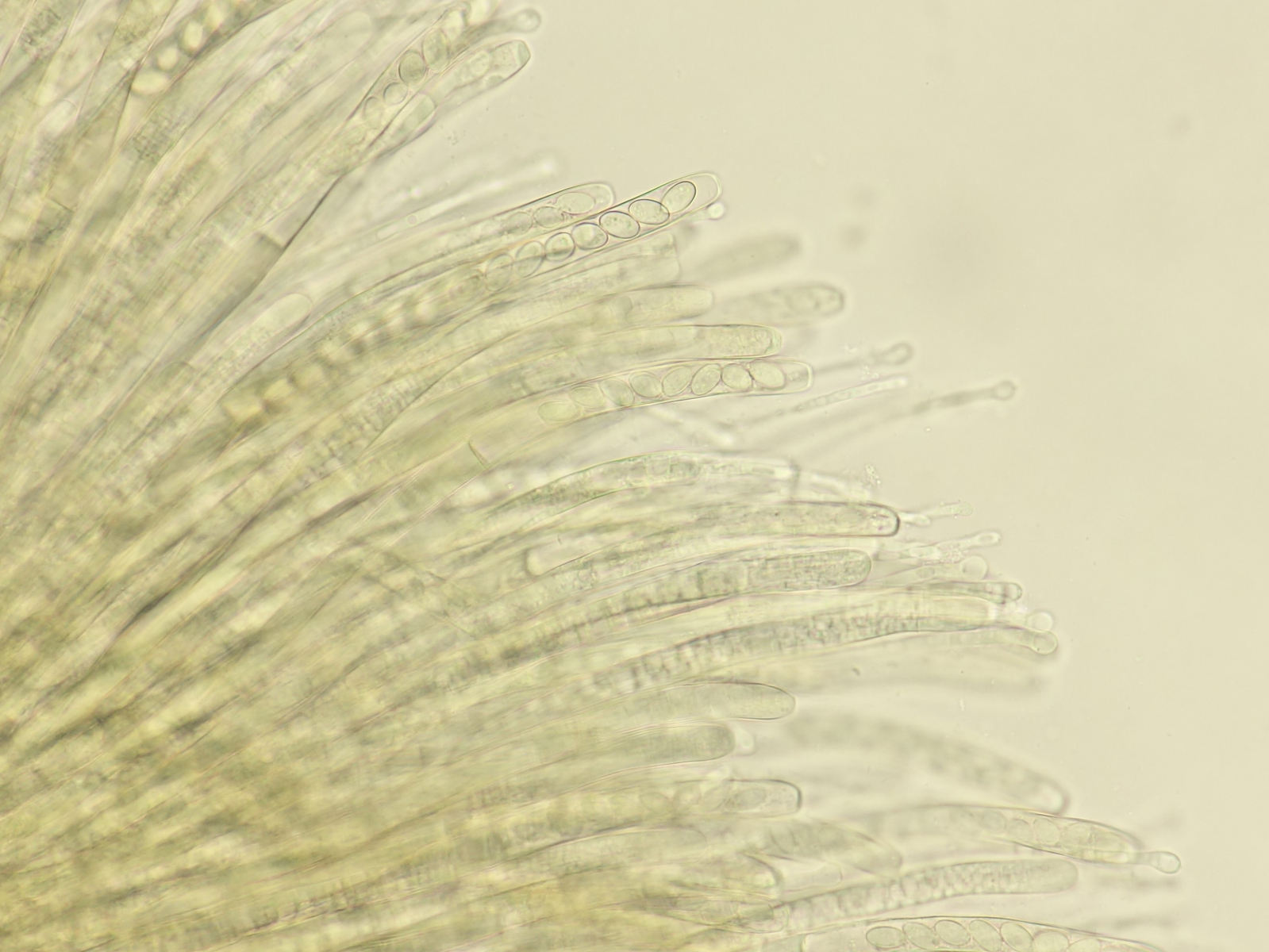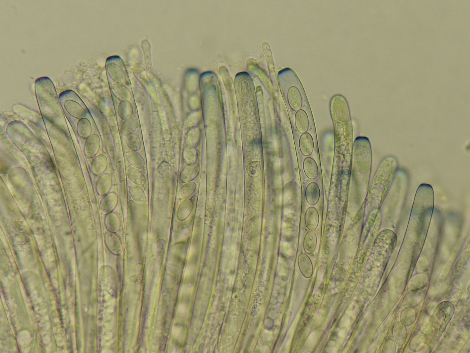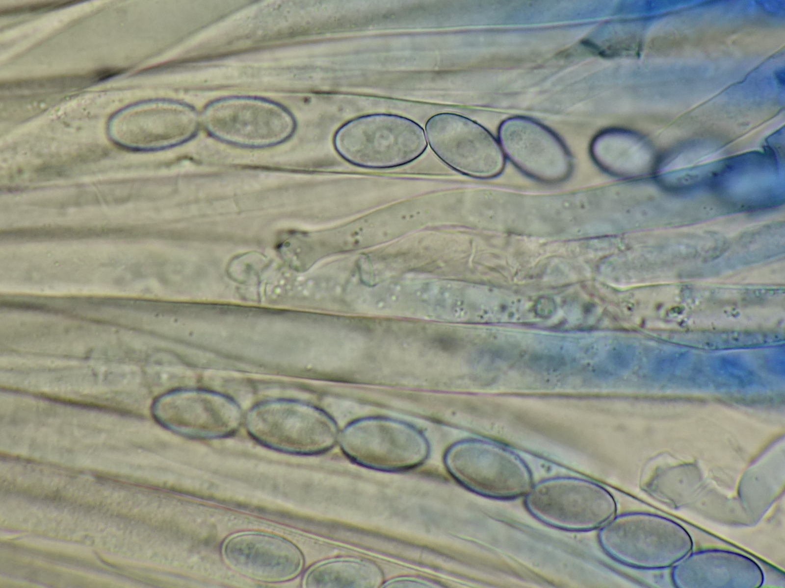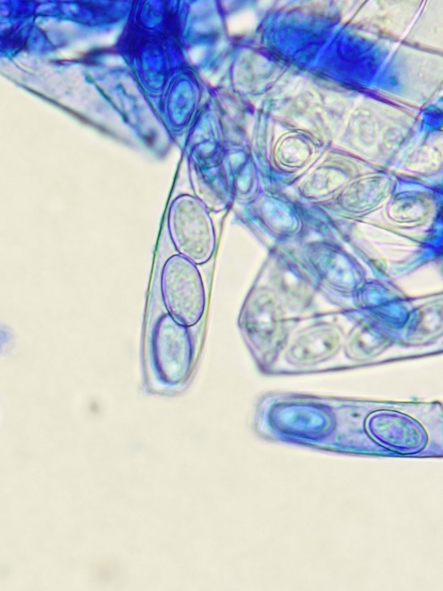 vor einer Woche fand ich auf diesem liegendem Laubholzstamm ==Gnolm10 (zB ein Pappel- oder Weidengewächs) einige Becher. Aufgrund der Dünnfleischgkeit und wachsartig splitternden Konsistenz gehe ich von einer Peziza aus. Außenseits heller, kleiig, ungestielt. Geruch jung nicht vorhanden, alt unangenehm säuerlich. Zunächst schien mir aufgrund der Größe von bis ca 8cm Durchmesser sowie des Vorkommens auf Holz Peziza varia agg. plausibel. Auch konnte ich makroskopisch im Querschnitt keine dunkle sondern nur eine hellere Linie feststellen. Die Sporenmaße bringen einen hier nicht weiter, sie passen mit 14 (13-16) x 9 (8-10) µm (n=12) zu vielen (u.a. varia, repanda, arvernensis), 8-sporig sind auch alle genannten und die Ascuspitzen Iod+. Aber was mich dann doch in Richtung P. arvernensis denken lässt ist ein fragliches Sporenornament. Nun bin ich ein Mikro- Anfänger und habe in der Beurteilung von Sporenornament keinerlei Ahnung. Ich bin mir also nicht sicher ob der feinkörnige Aspekt evtl. aus dem Zytoplasma herrührt und nur scheinbar auf der Oberfläche liegt. Zudem habe ich auch das Gefühl dass eine Baumwollblau-Färbung auf Ascomyceten ziemlich toxisch wirkt, denn nach wenigen Minuten sind alle Sporen bohnenartig eingedellt (vermutlich hypoton) was zu Artefakten führen könnte. Außerdem war es mir selbst mit stark verdünnter Lsg nicht möglich freie Sporen zu betrachten, weil alle freien Sporen sofort zu einem blauen Gerinnsel zusammenkleben.