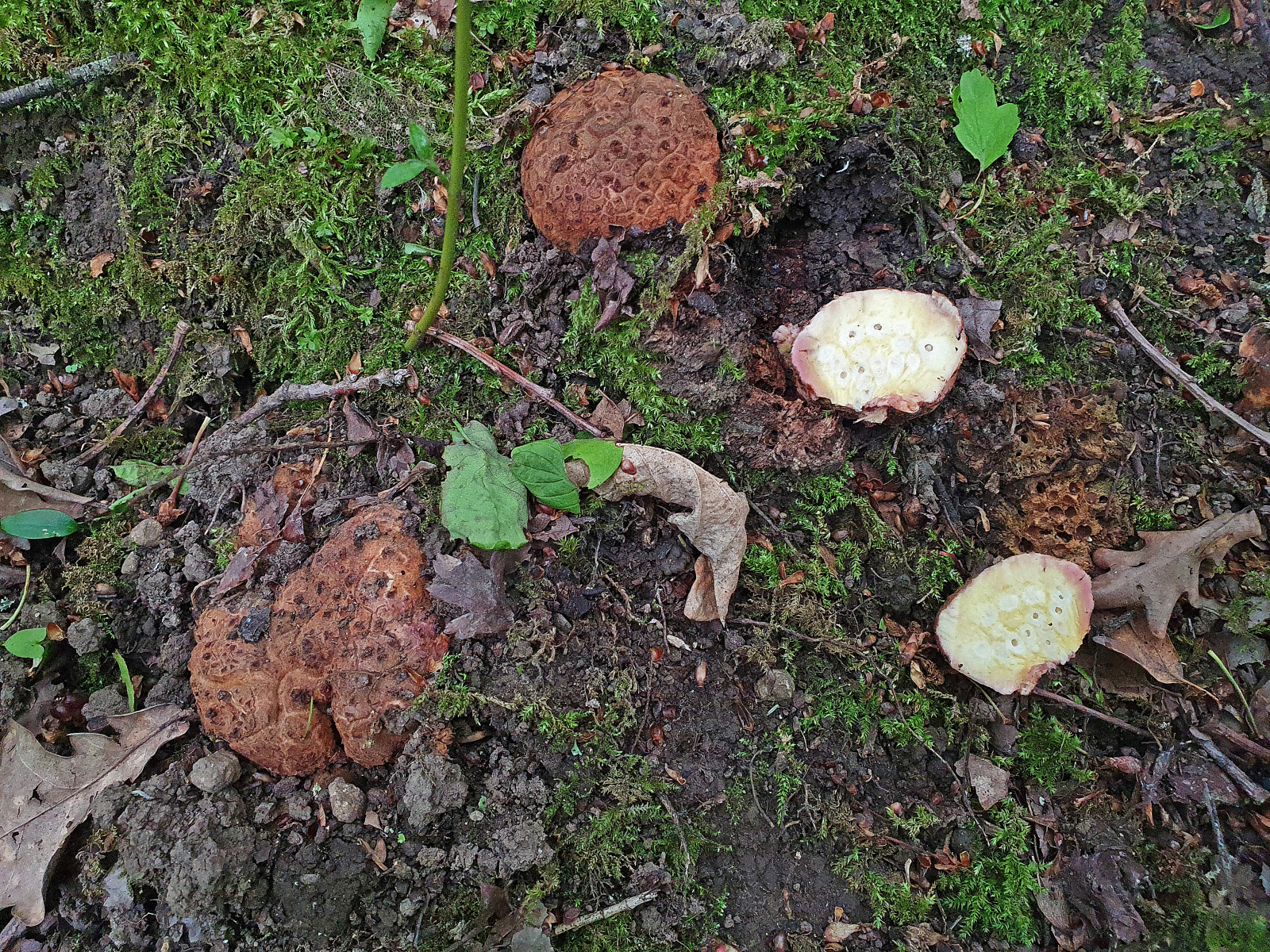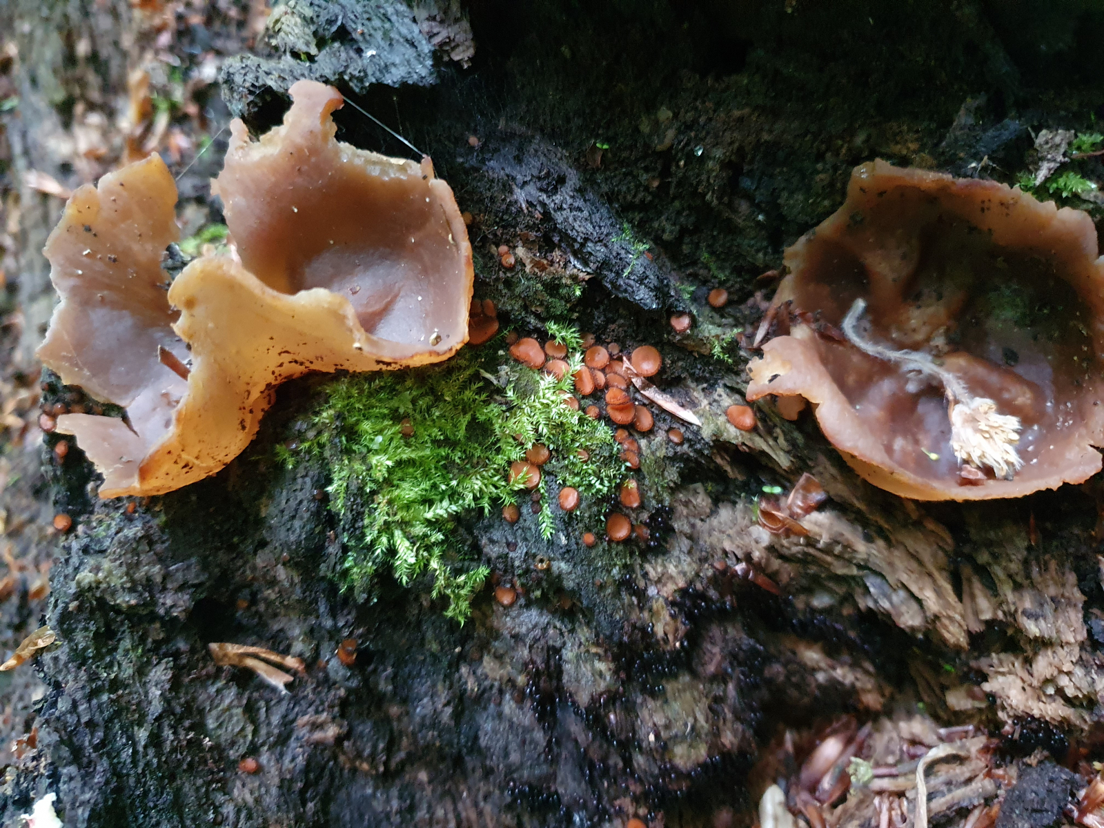 Weiter ging es zu einem angrenzenden großen naturnahen Eichen-Buchenmischwald an der Wied. Ein interessantes Biotop mit viel Feuchtigkeit. An einem extrem stark verrottendem Stamm eine Gyromitra? und dazwischen Schildborstlinge (vermutlich an verrottender Buche - muss wohl das Holz mikroskopieren, das war aber kompletter und alter Laubwald). Dachte erst wegen Laubholz an Gyromitra parma. Aber dazu passen die Sporen nicht: